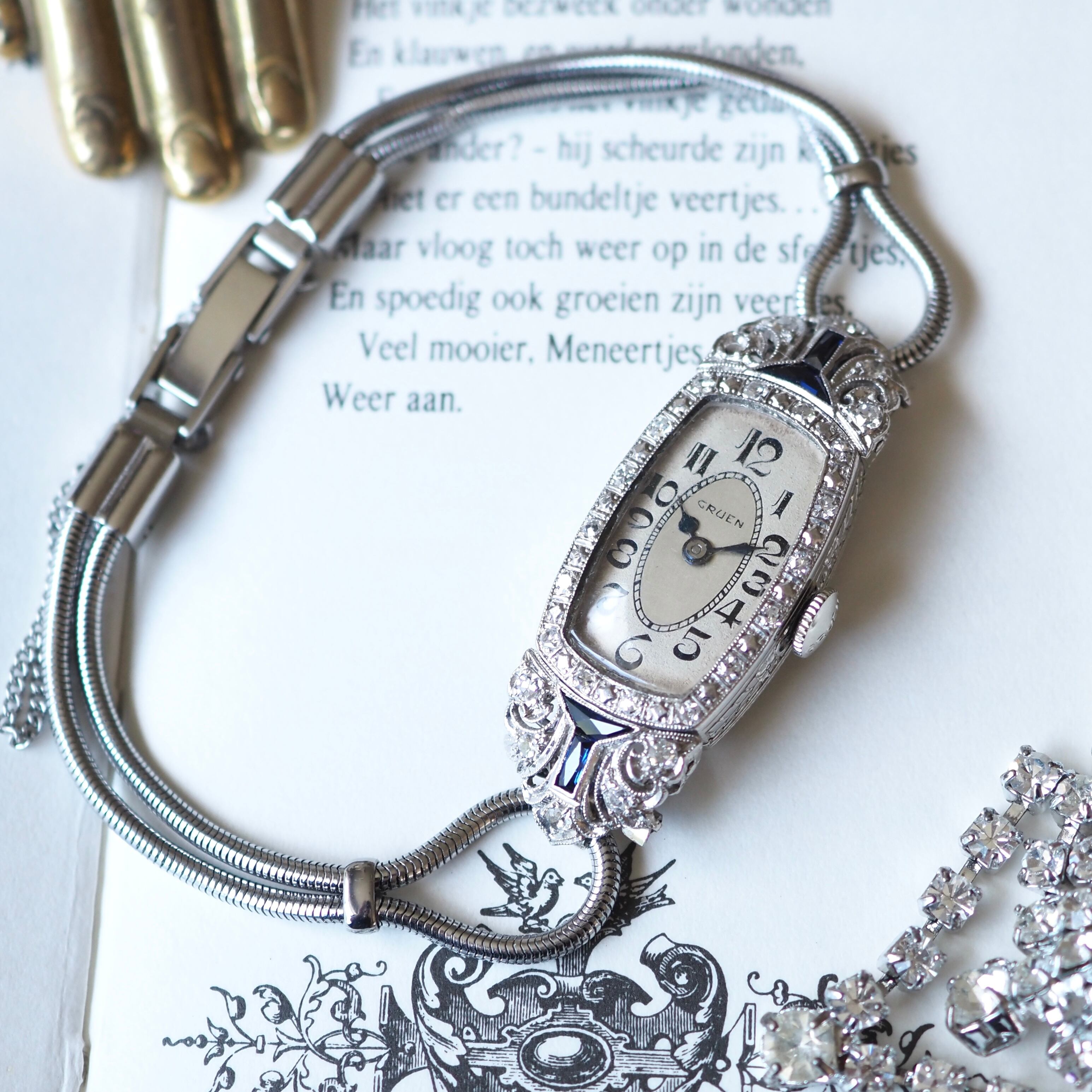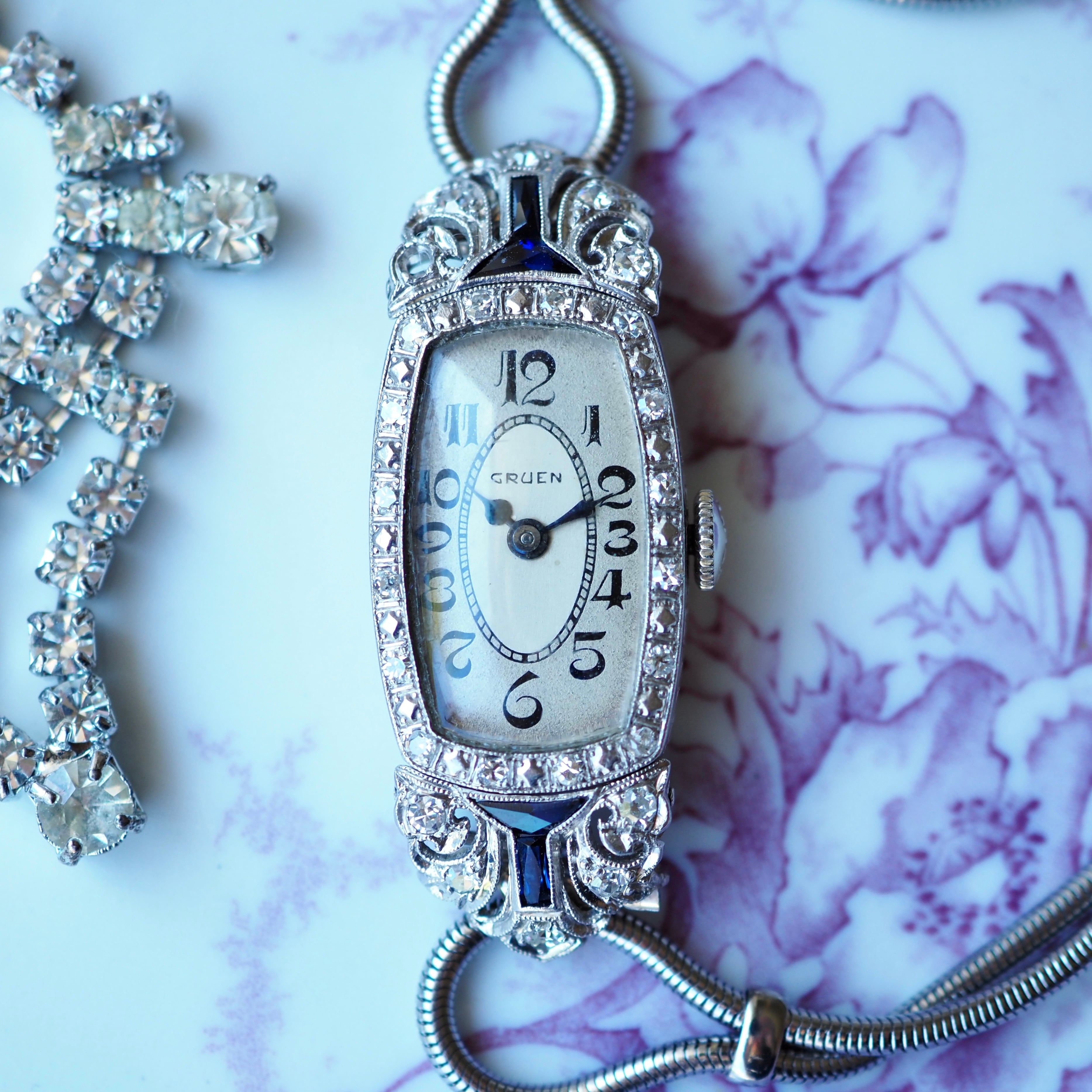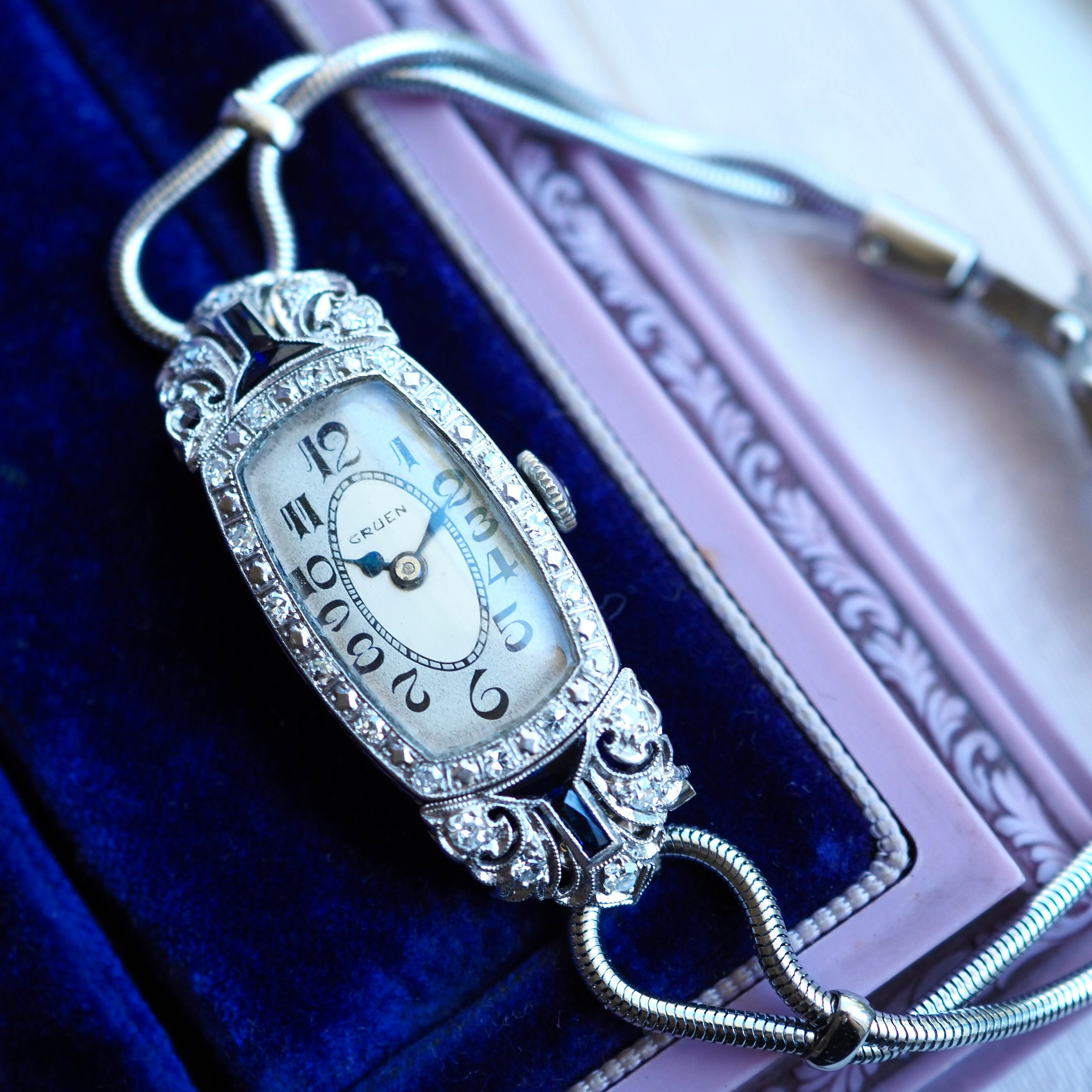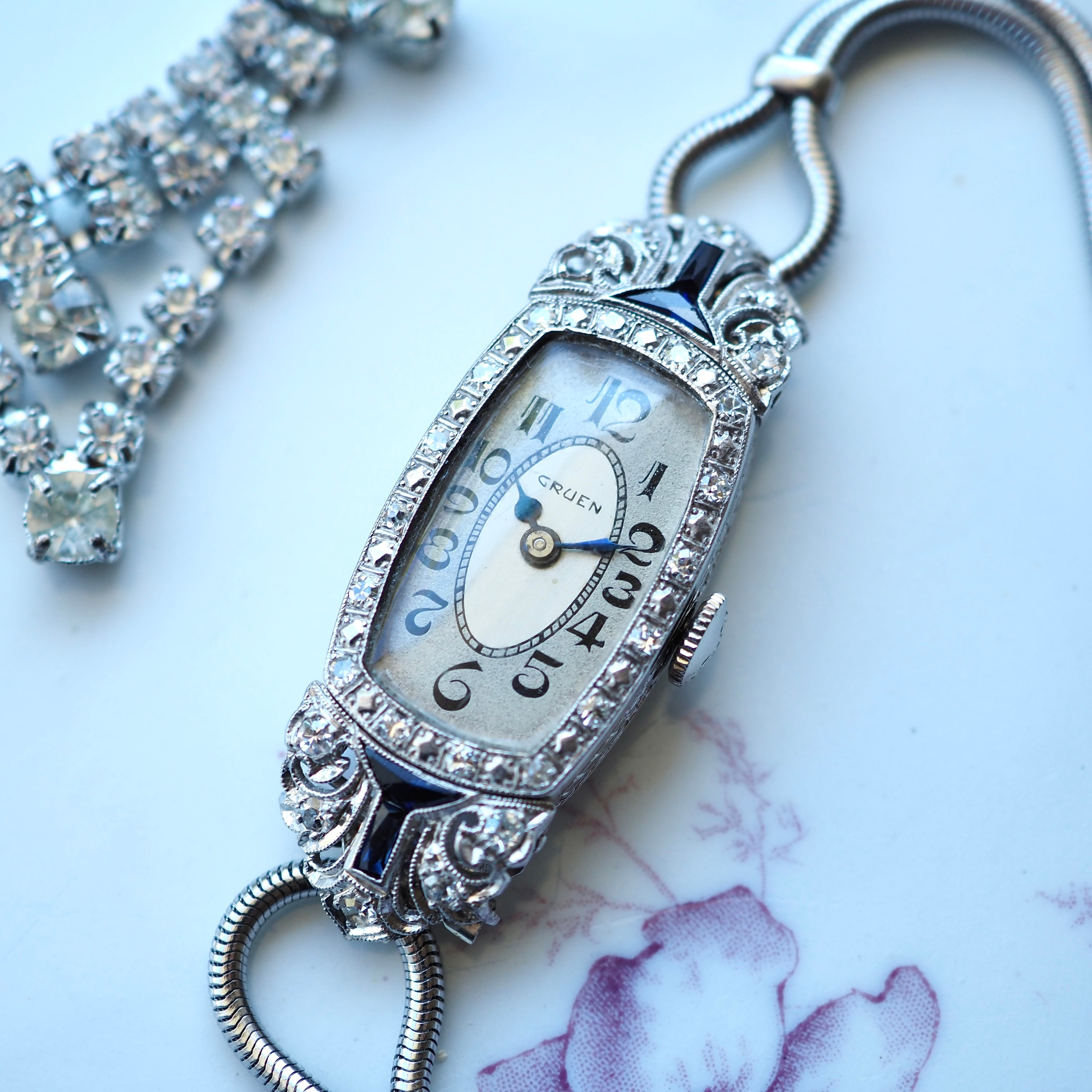 100年前 GRUEN グリュエン アール・デコ プラチナ ダイヤ&サファイア ジュエリーウォッチ