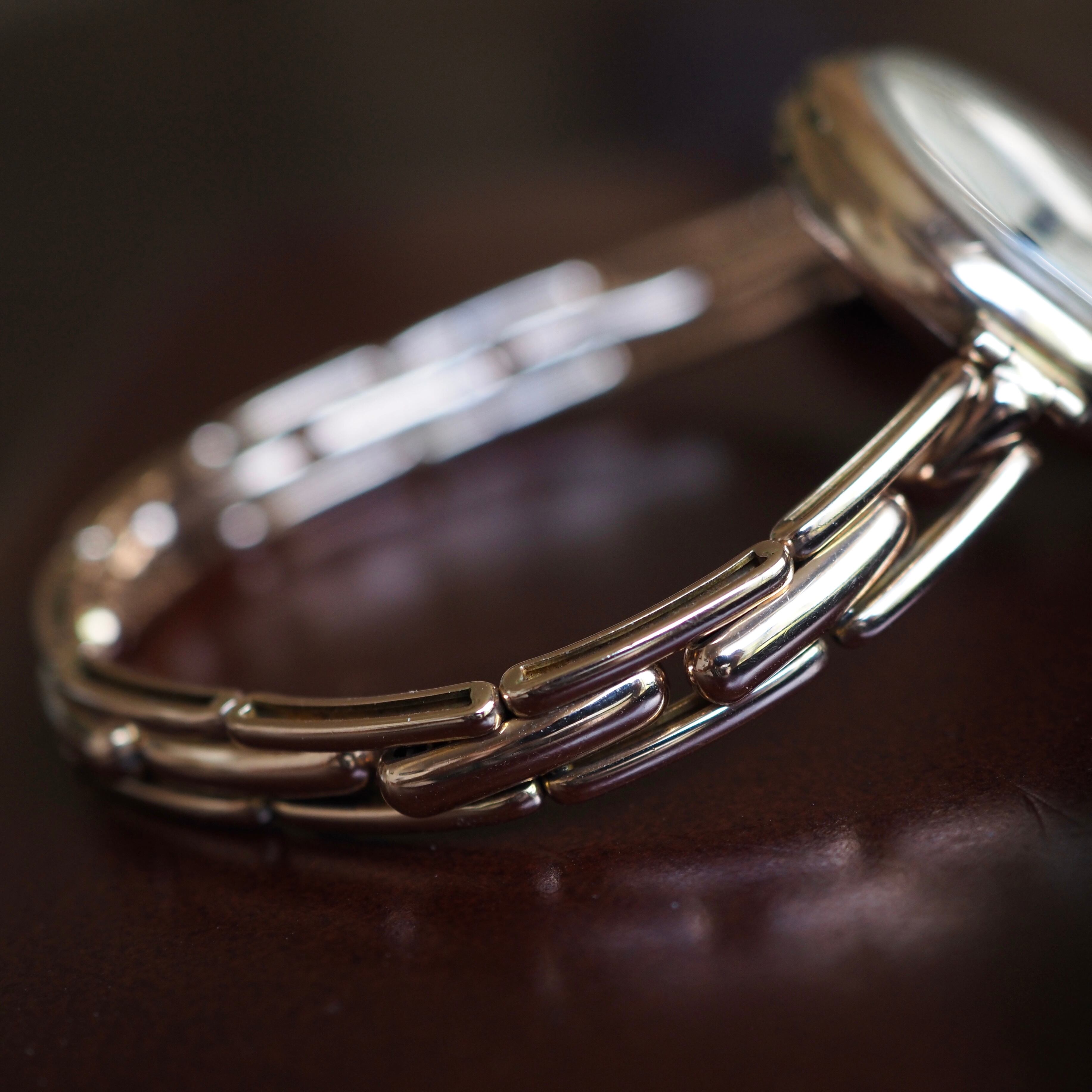 懐中時計を思わせるマニッシュなデザインと、つるりとした温かみのあるローズかがったゴールドの柔らかい雰囲気が絶妙なバランスの一本です。