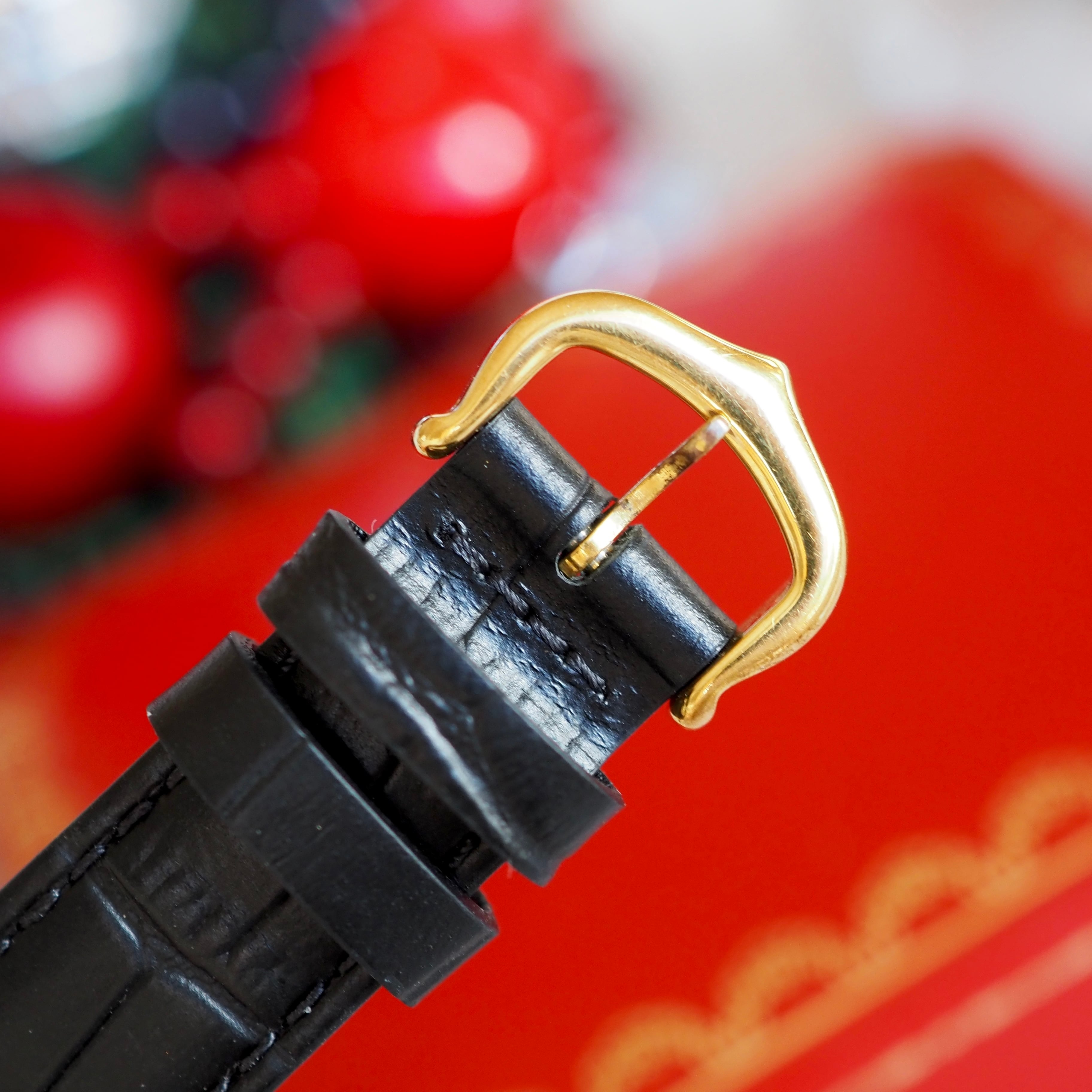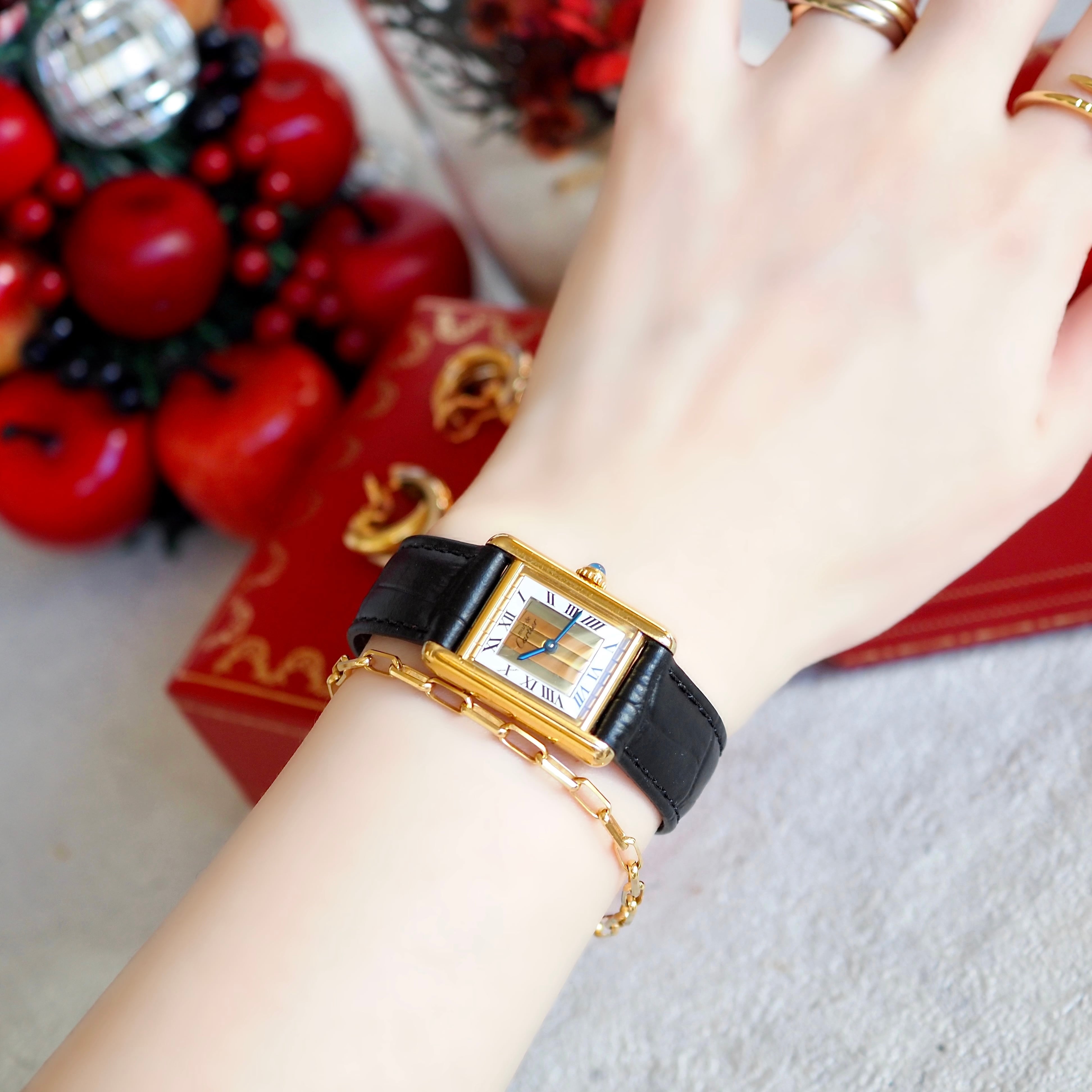 こちらの文字盤は、正統派なローマンインデックスにカルティエの名モチーフの一つであるトリニティゴールドをあしらったスリーカラーが華やかでカルティエらしいデザインです。