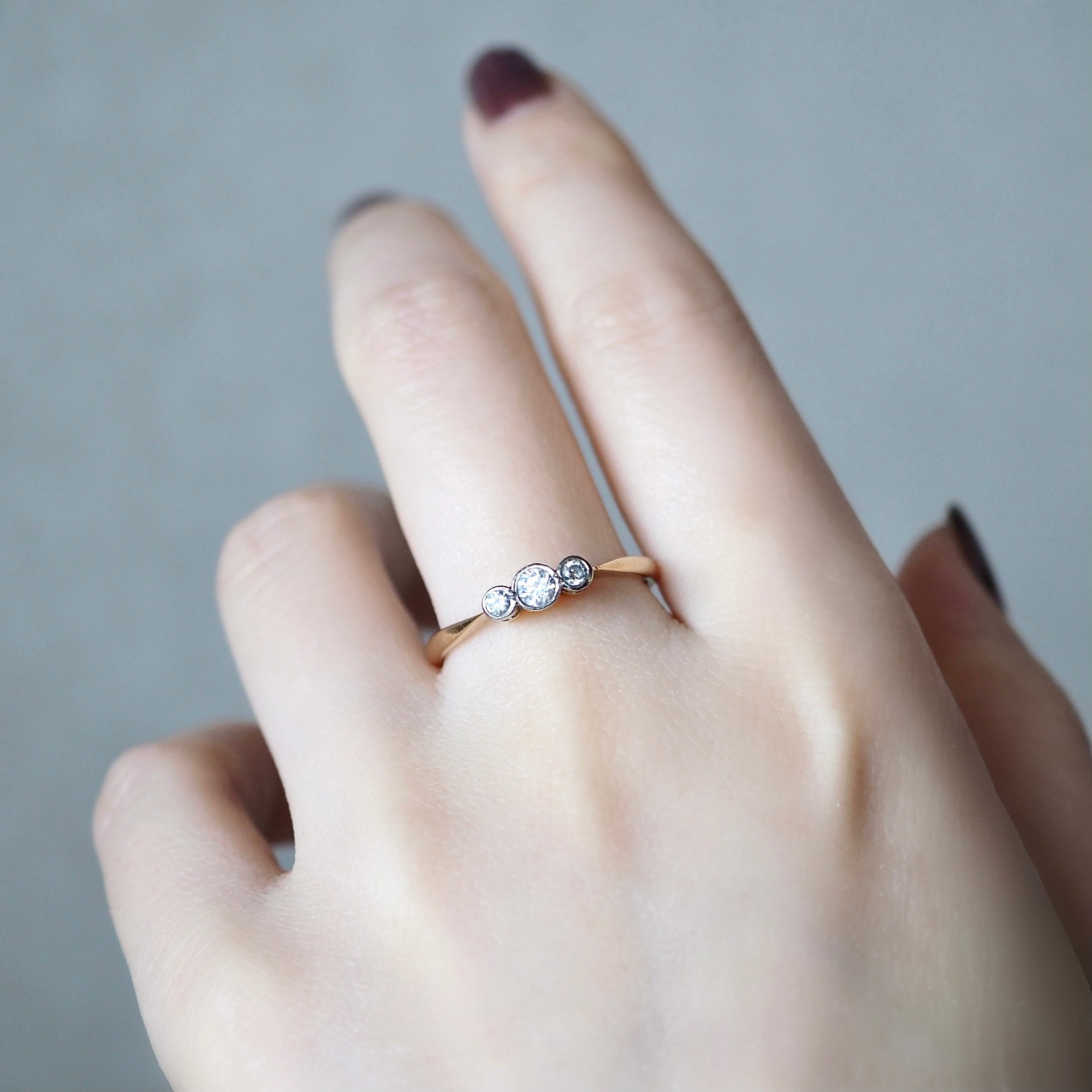 ちょこんと並んだ3粒のダイヤモンドがセットされたトリロジーリングです。