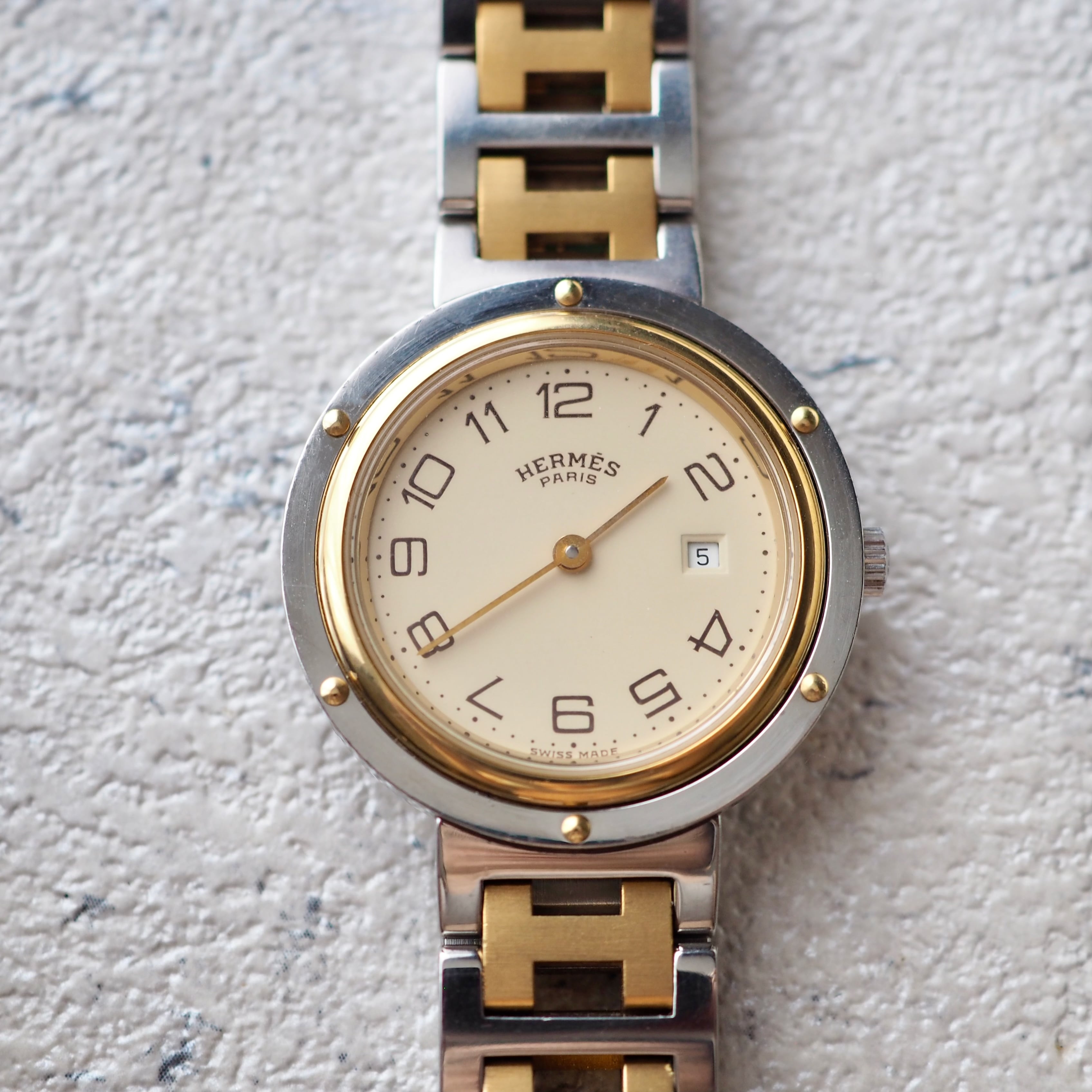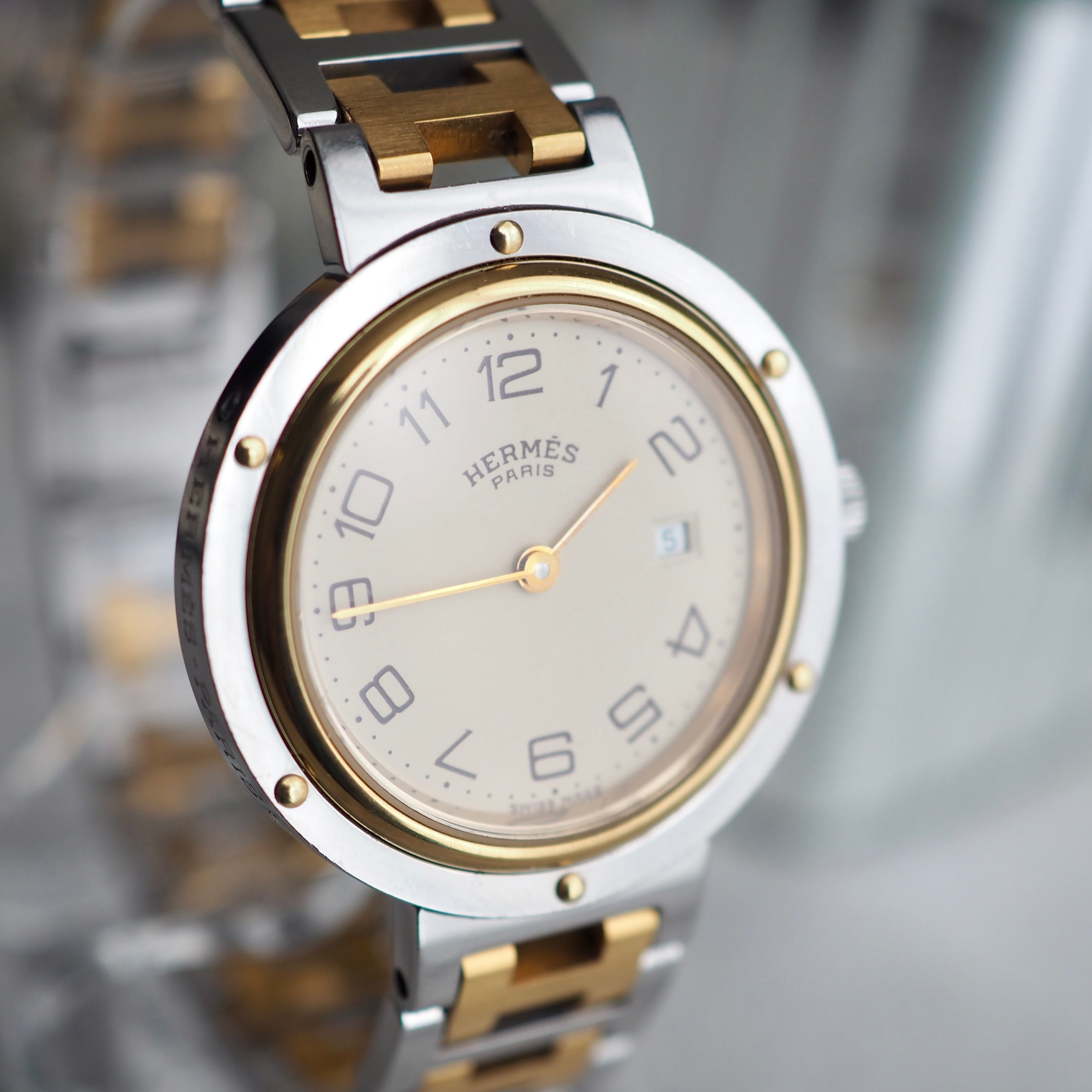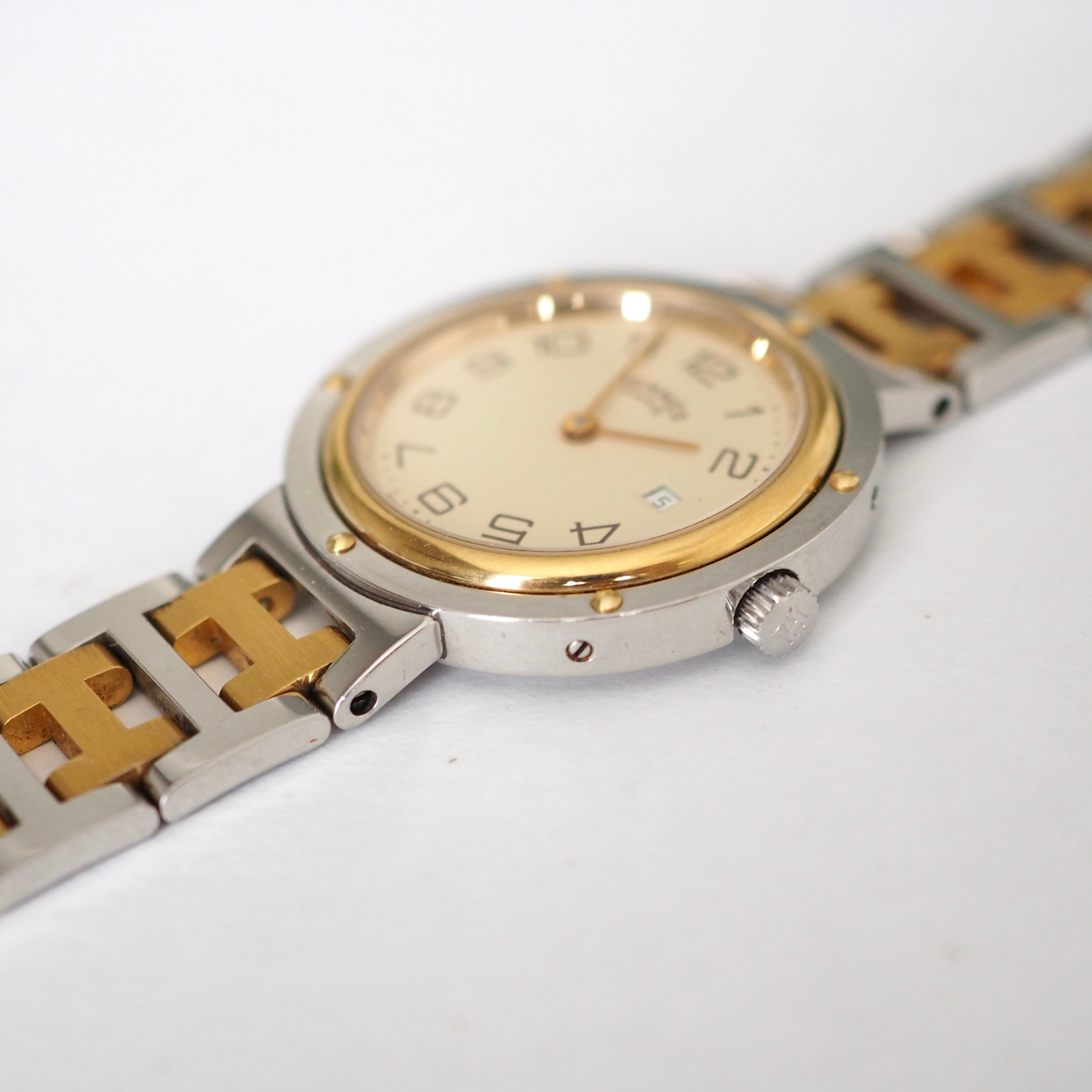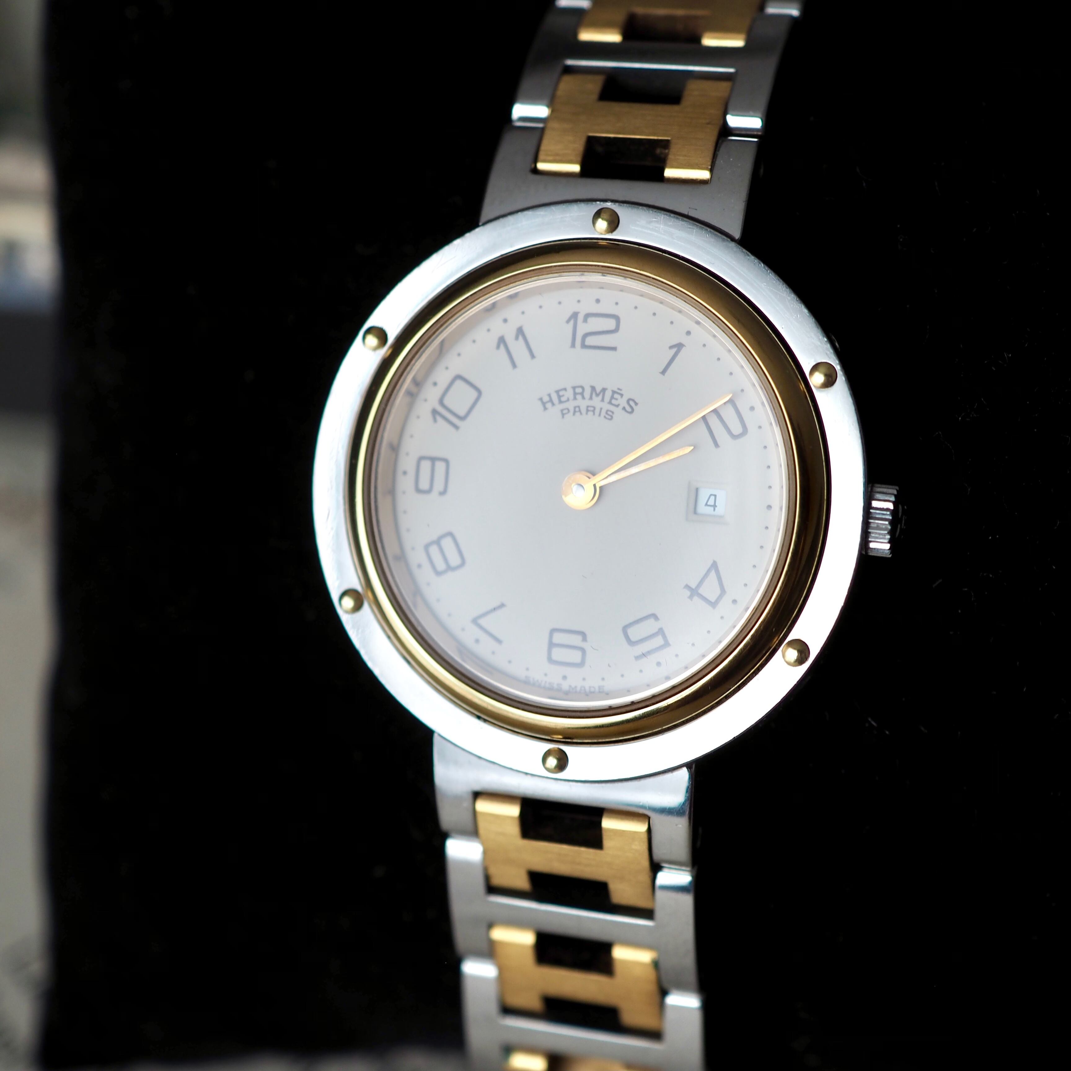 19世紀に活躍した大型帆船のクリッパー号から名付けられ、ビスが施されたケースは客船の窓から着想を得たデザインと言われます。Hermesの頭文字「H」を模ったブレスレットも特徴的です。