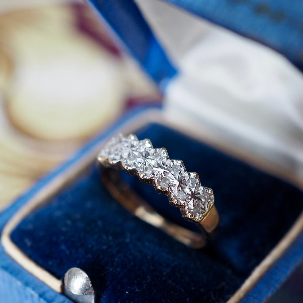 12Pのダイヤモンドが輝く珍しい形のヴィンテージリングです。ダイヤの周りはホワイトゴールドで✴︎の形になるようにデザインされていて美しくキラキラしています。