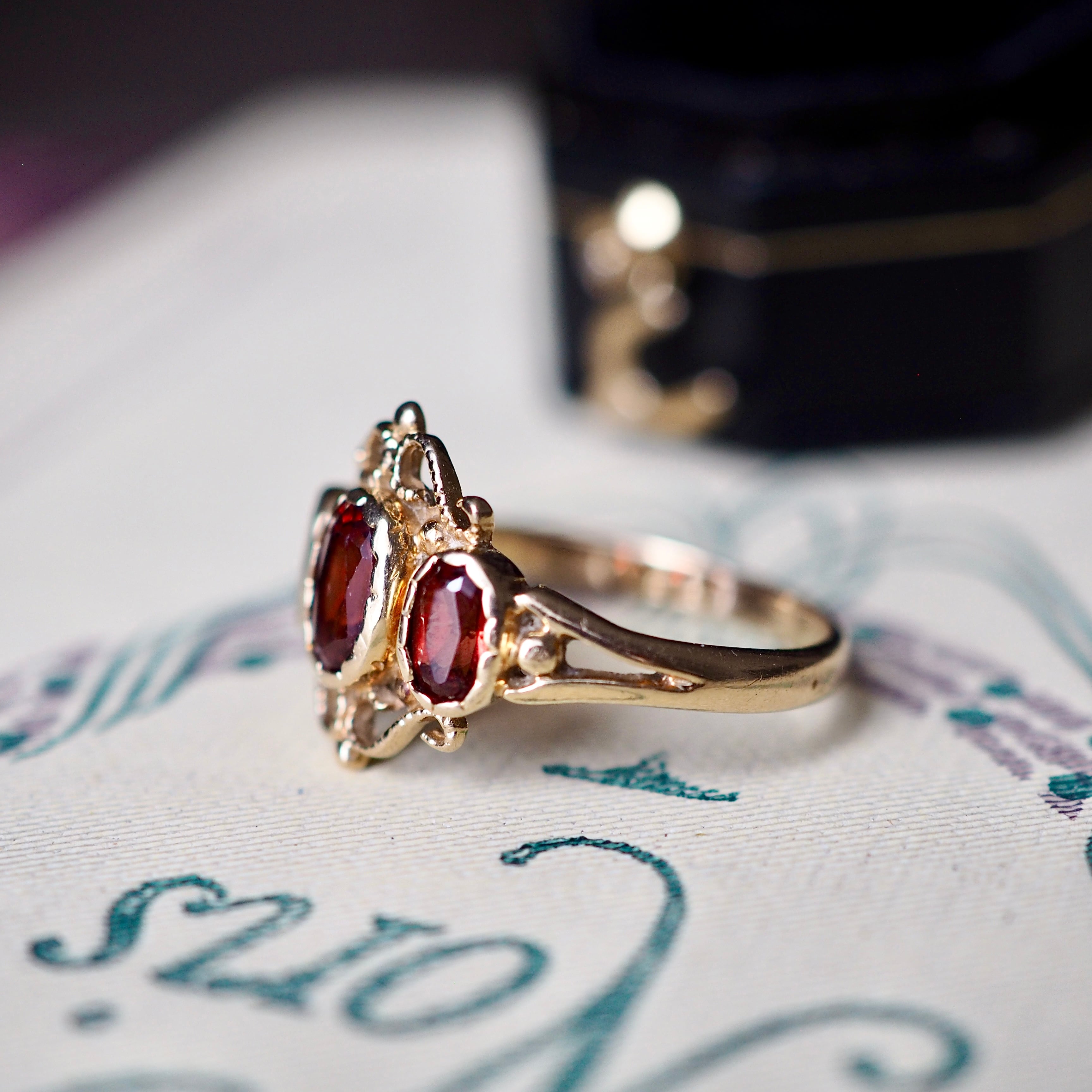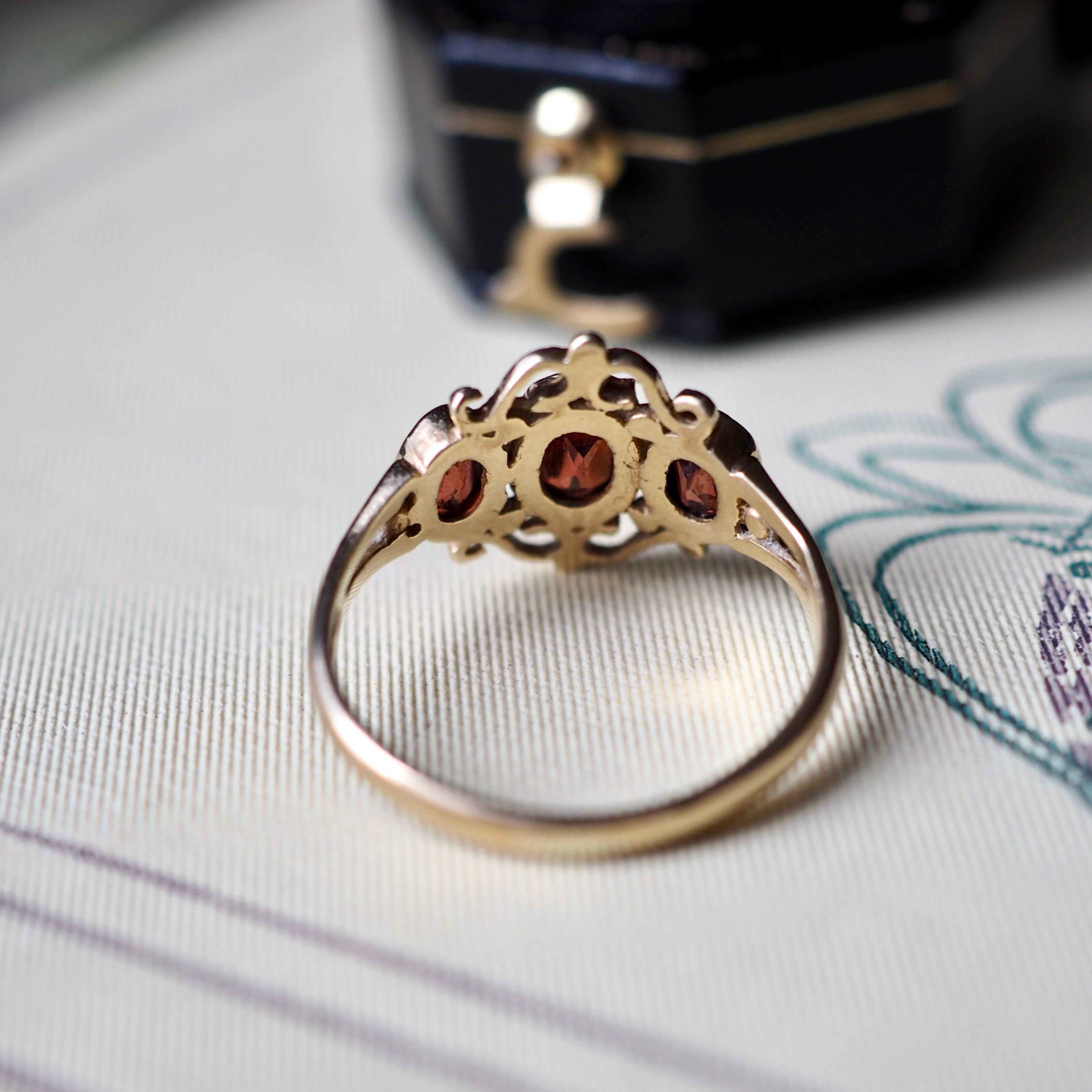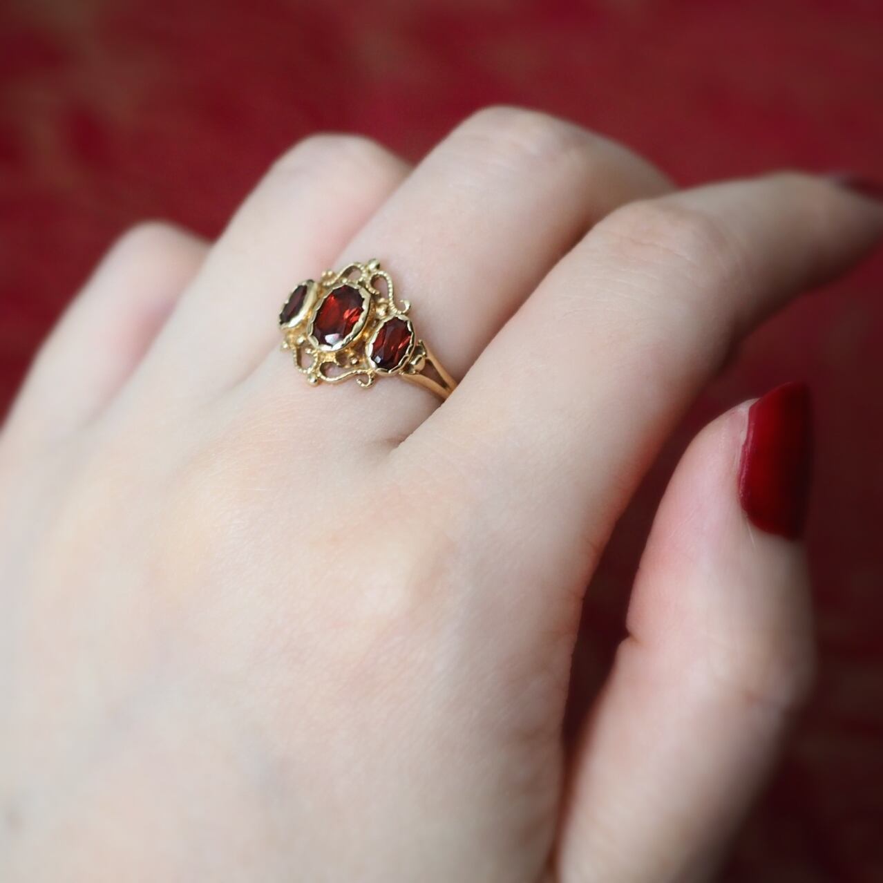 約7mmのガーネットを中心に両隣には5mmがセッティングしてあります。あまり濃くなく透け感のあるレッドカラーがとても綺麗です。