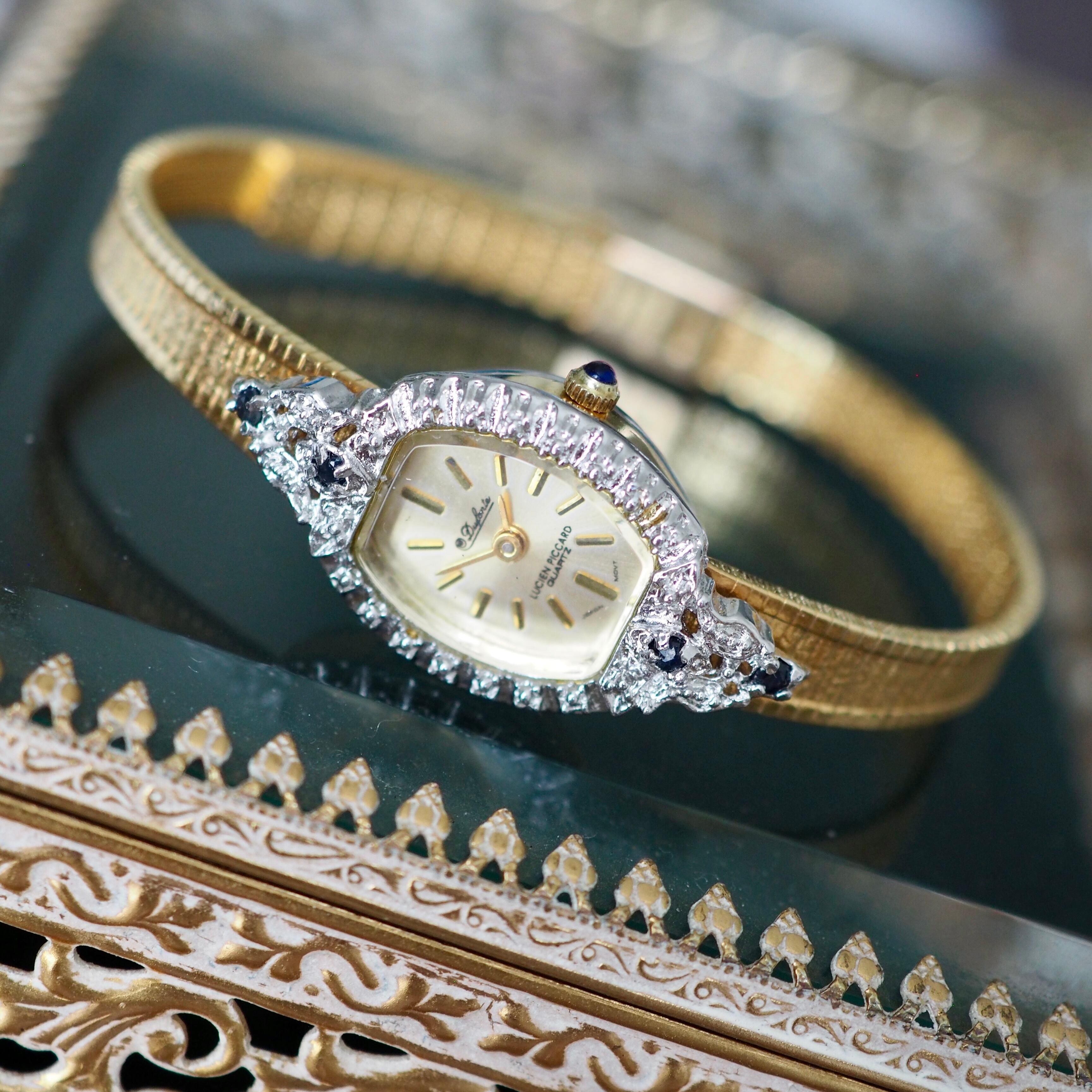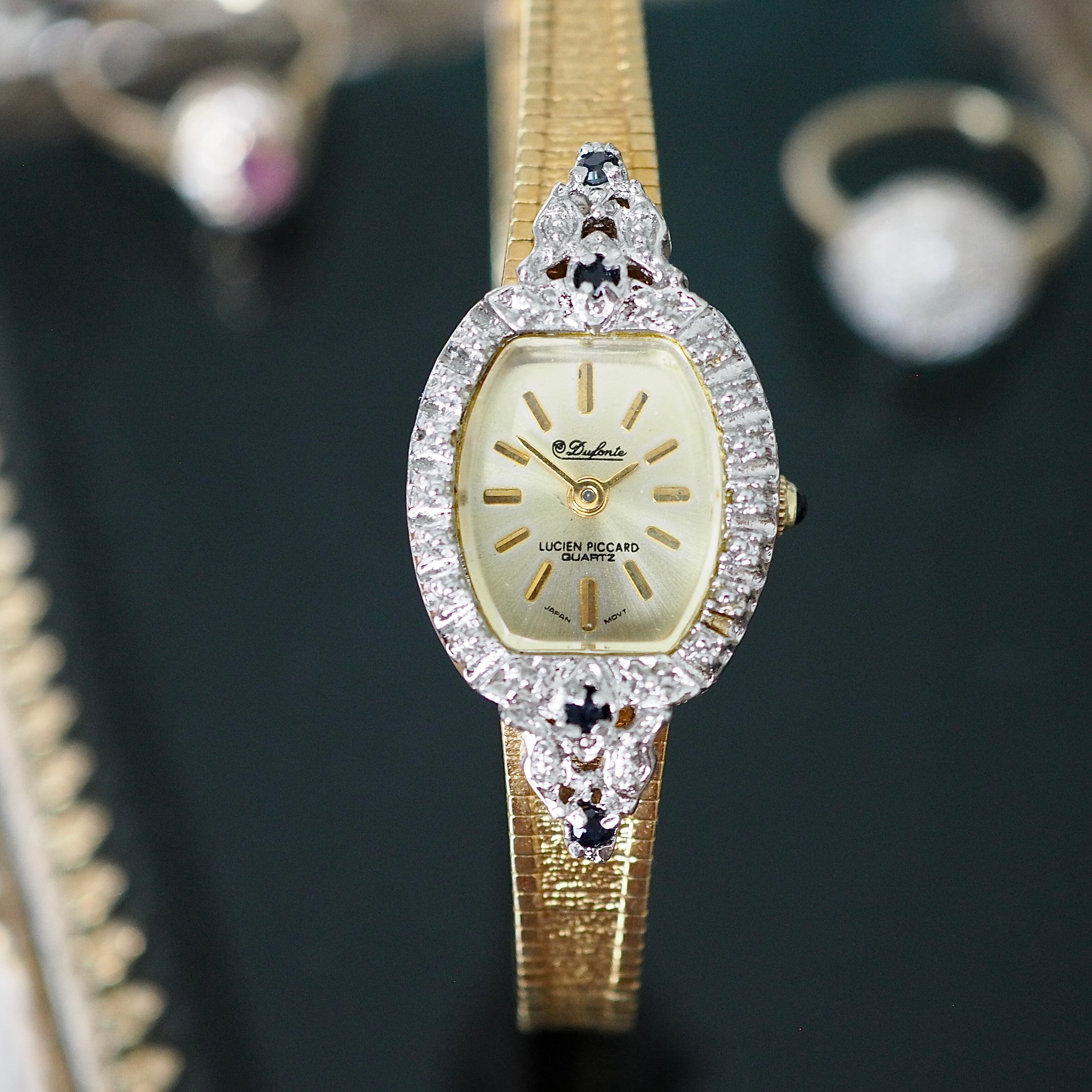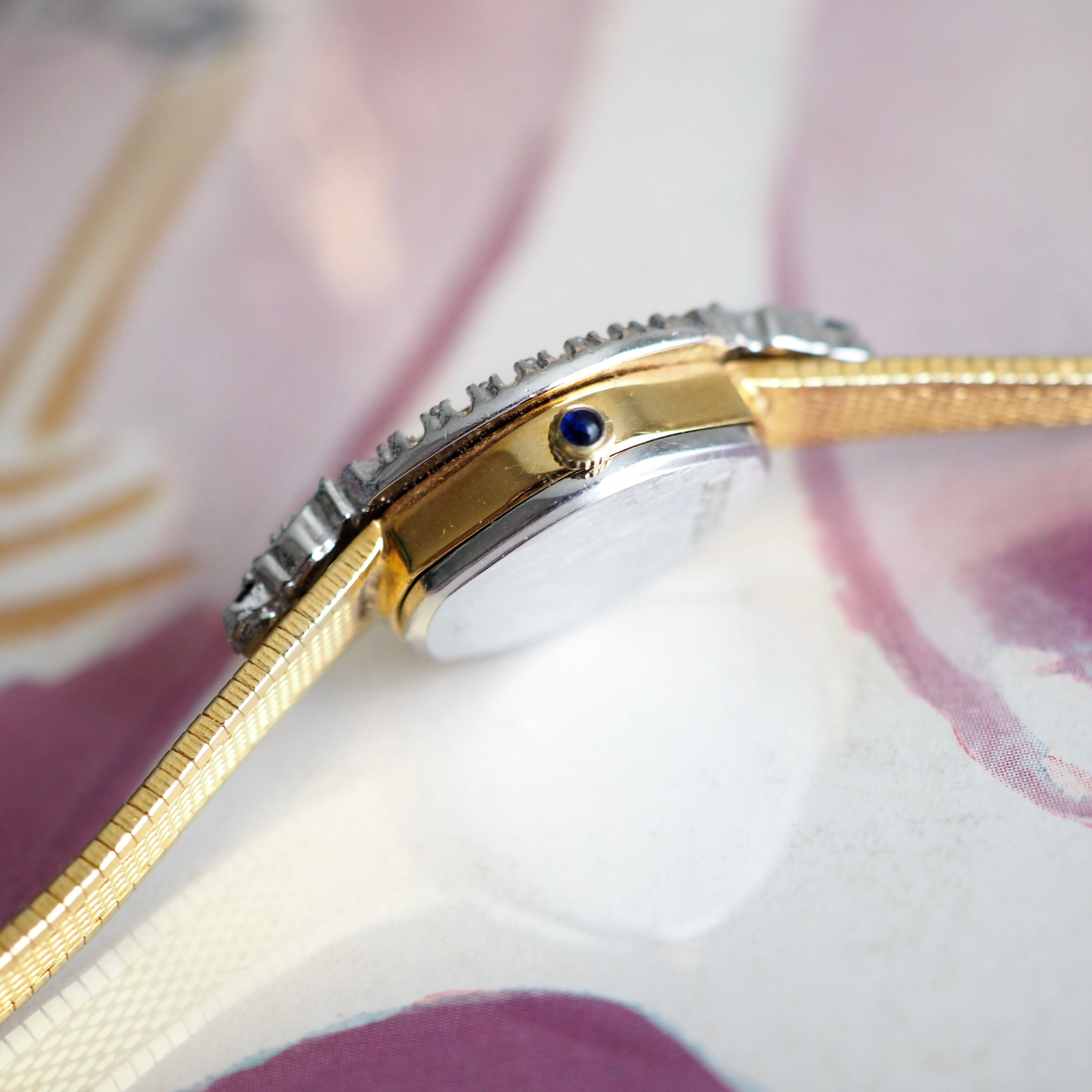 ヴィンテージ ・ルシアンピカールのドレスウォッチです。オーバル型ケースのベゼルと上下のラグにはサファイア、ベゼルにはダイヤモンドがセッティングしてあります。