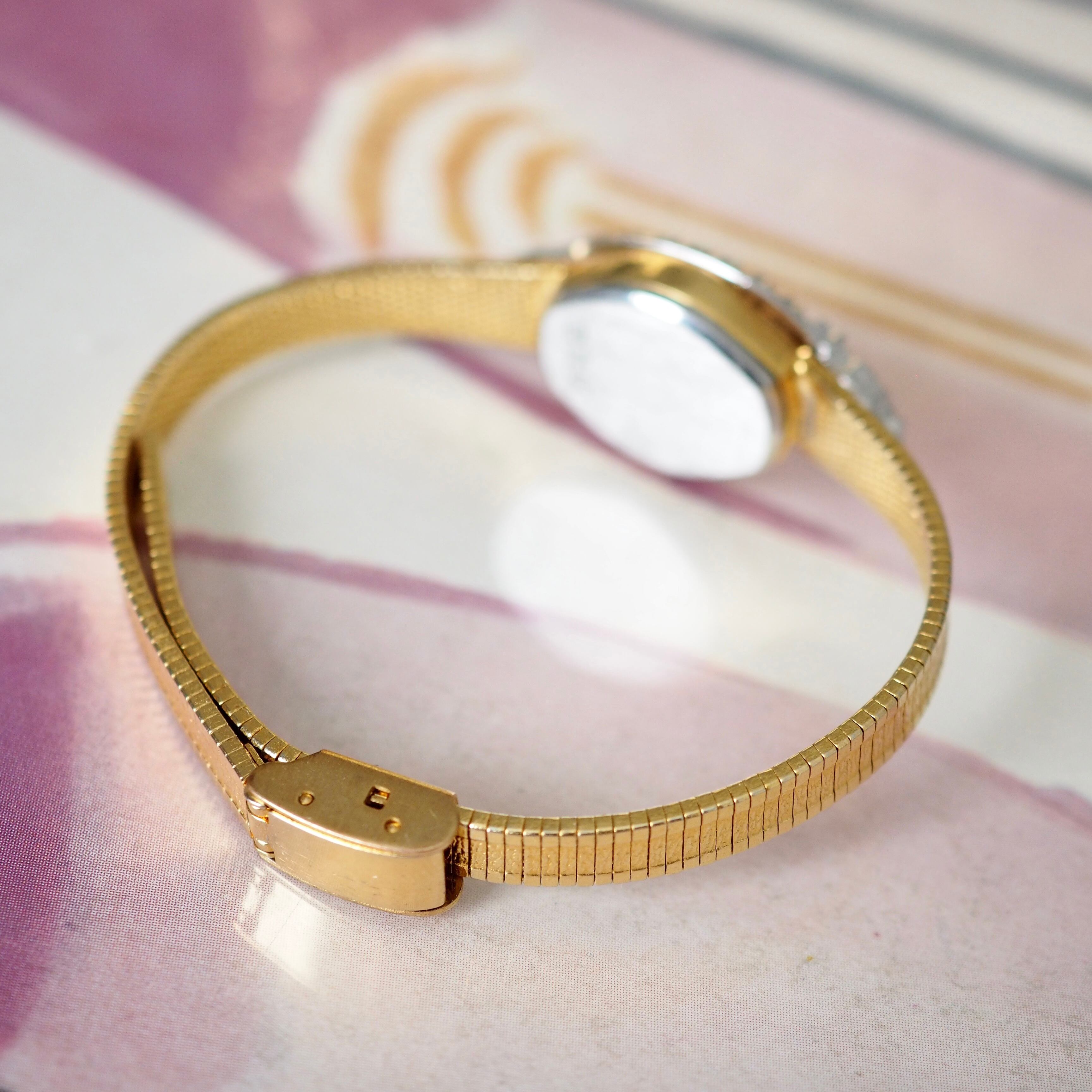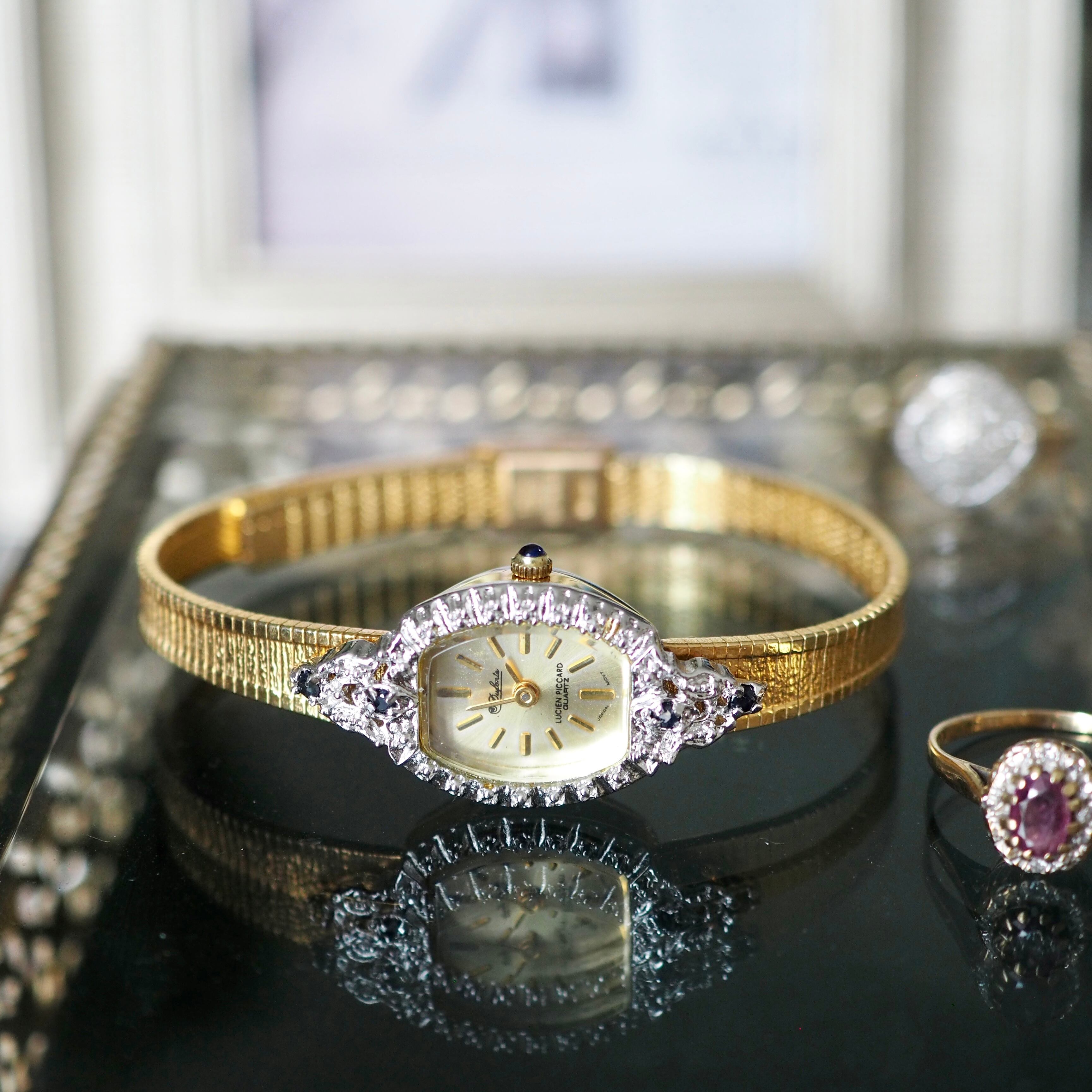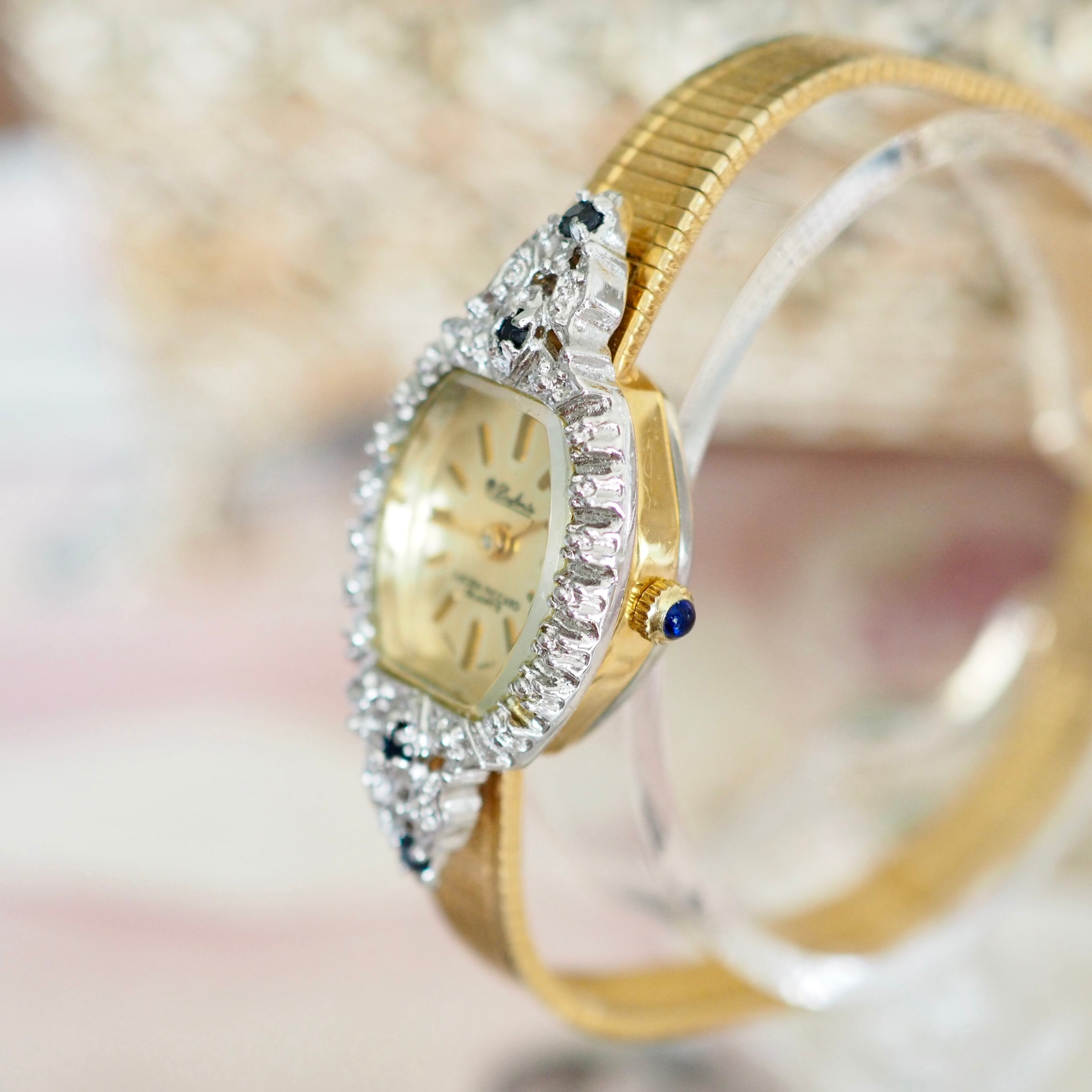 ヴィンテージ ・ルシアンピカールのドレスウォッチです。オーバル型ケースのベゼルと上下のラグにはサファイア、ベゼルにはダイヤモンドがセッティングしてあります。