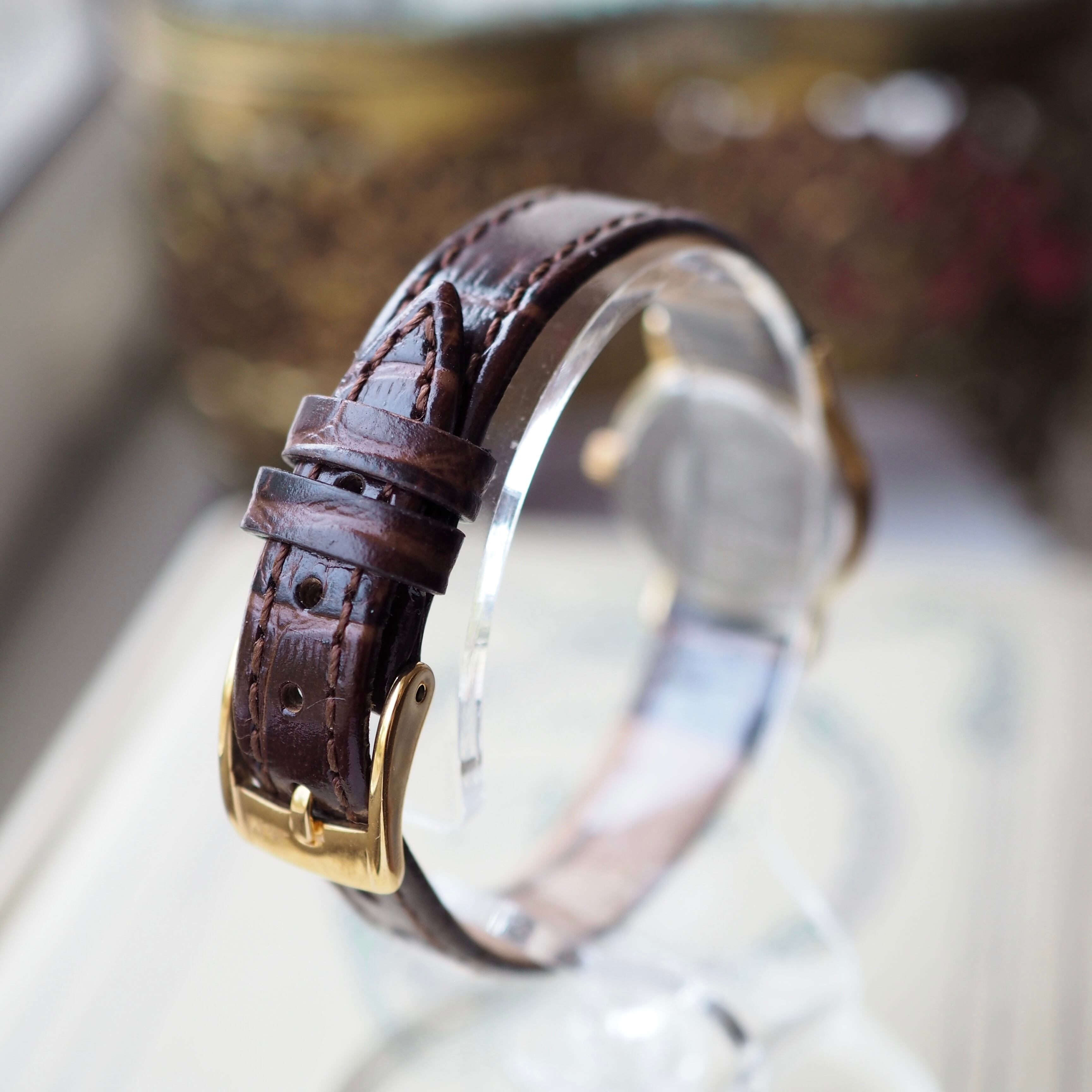 ゴールドのラウンドケースに小さめのアラビア数字インデックスが女性に可愛らしさと知的さを感じさせます✨