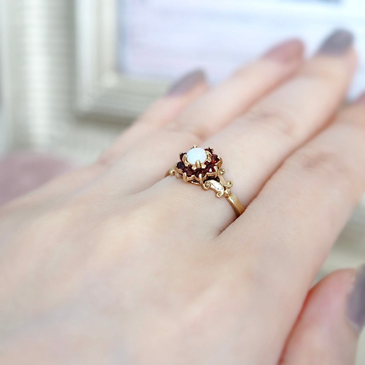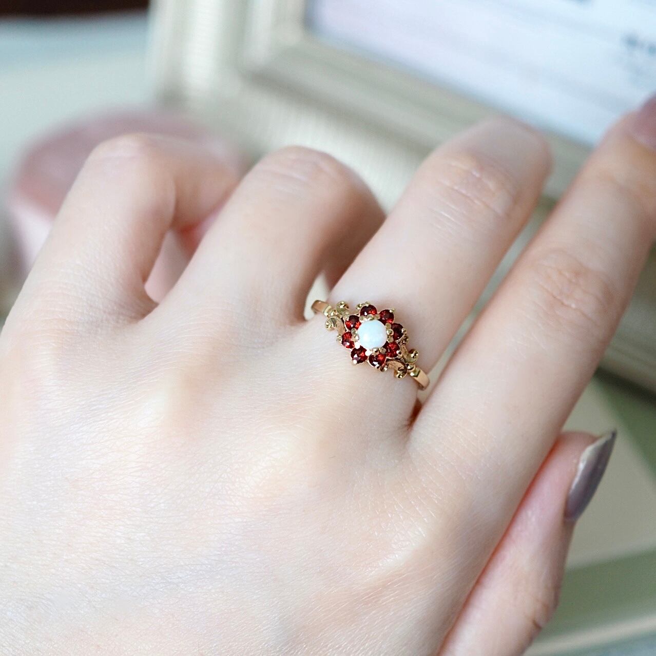 ふわっとオレンジ、ピンクの遊色が見られるオパールの周りに8石のガーネットがセッティングされた可憐なフラワーリングです。