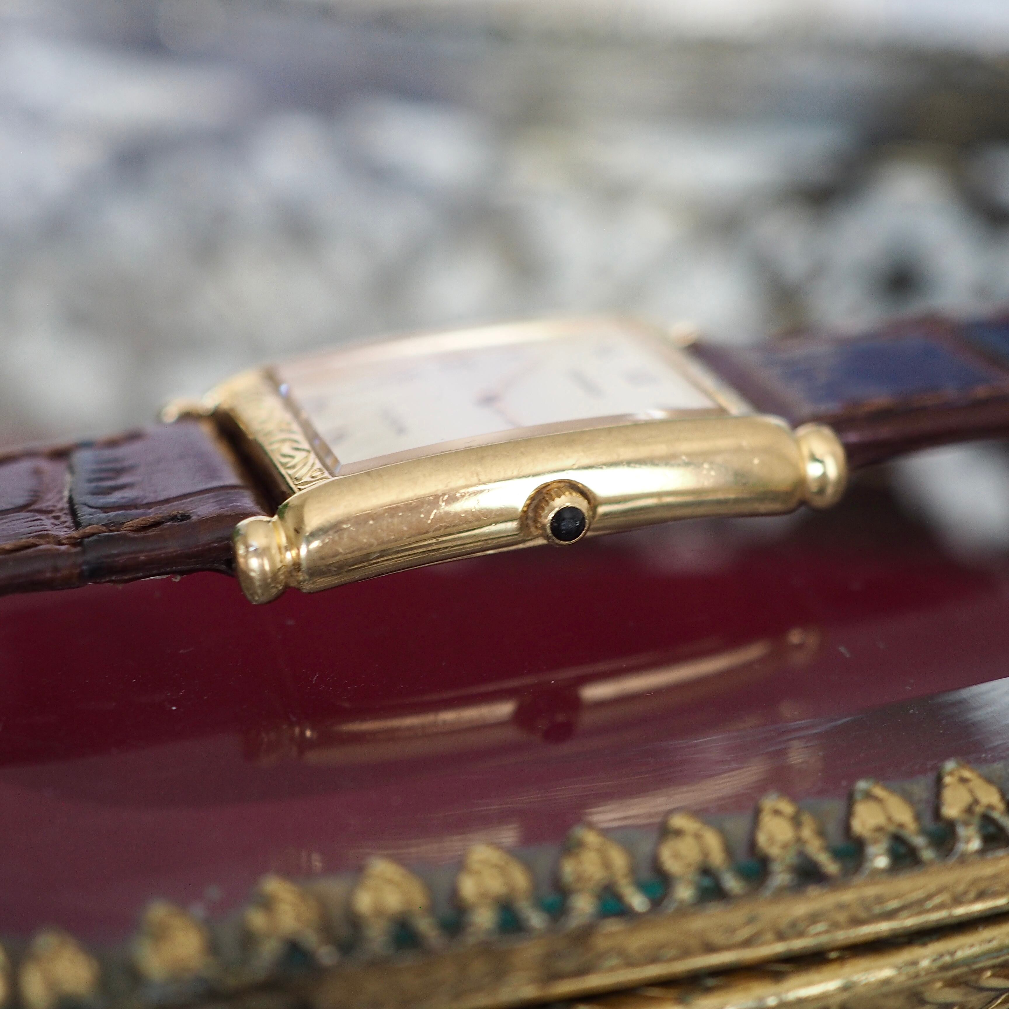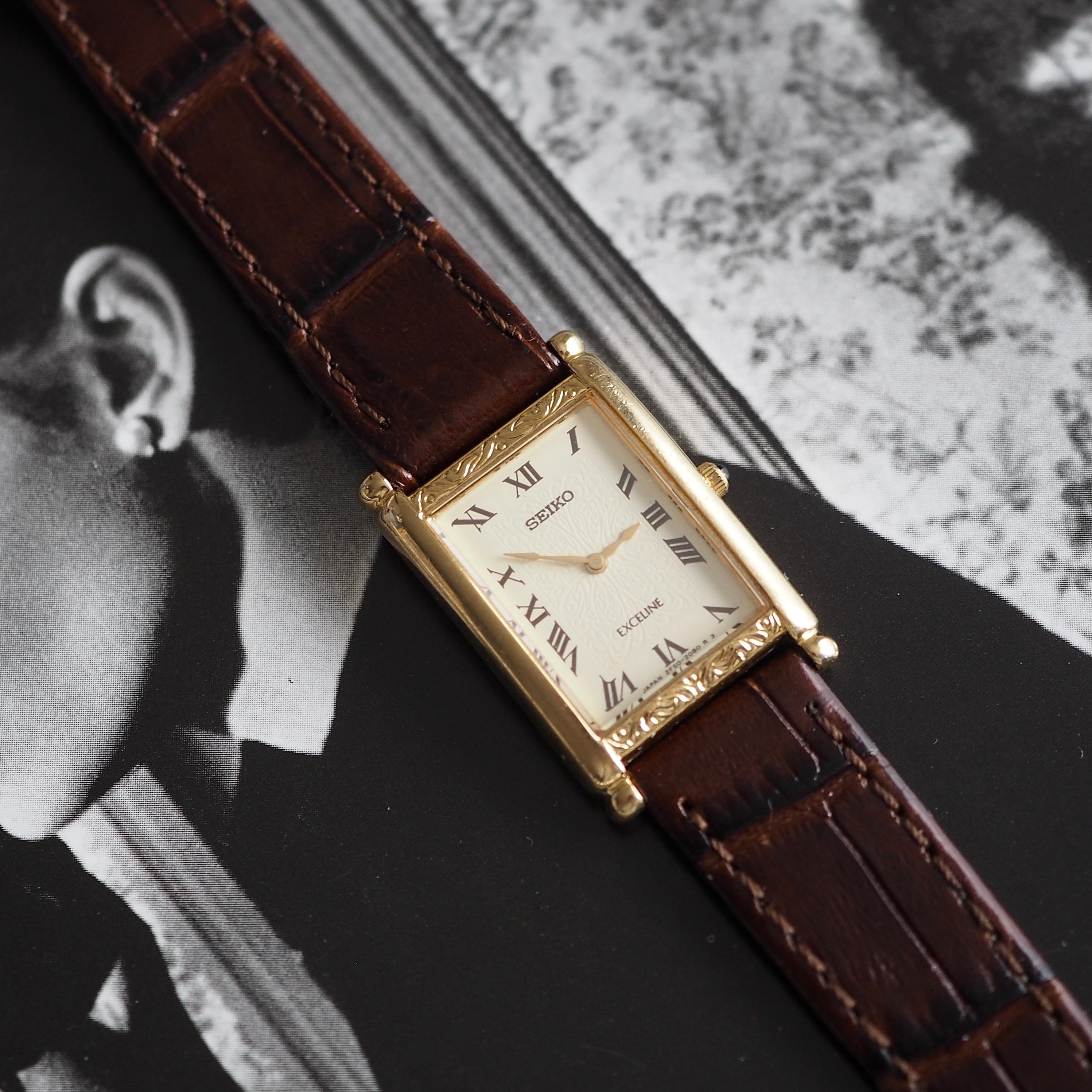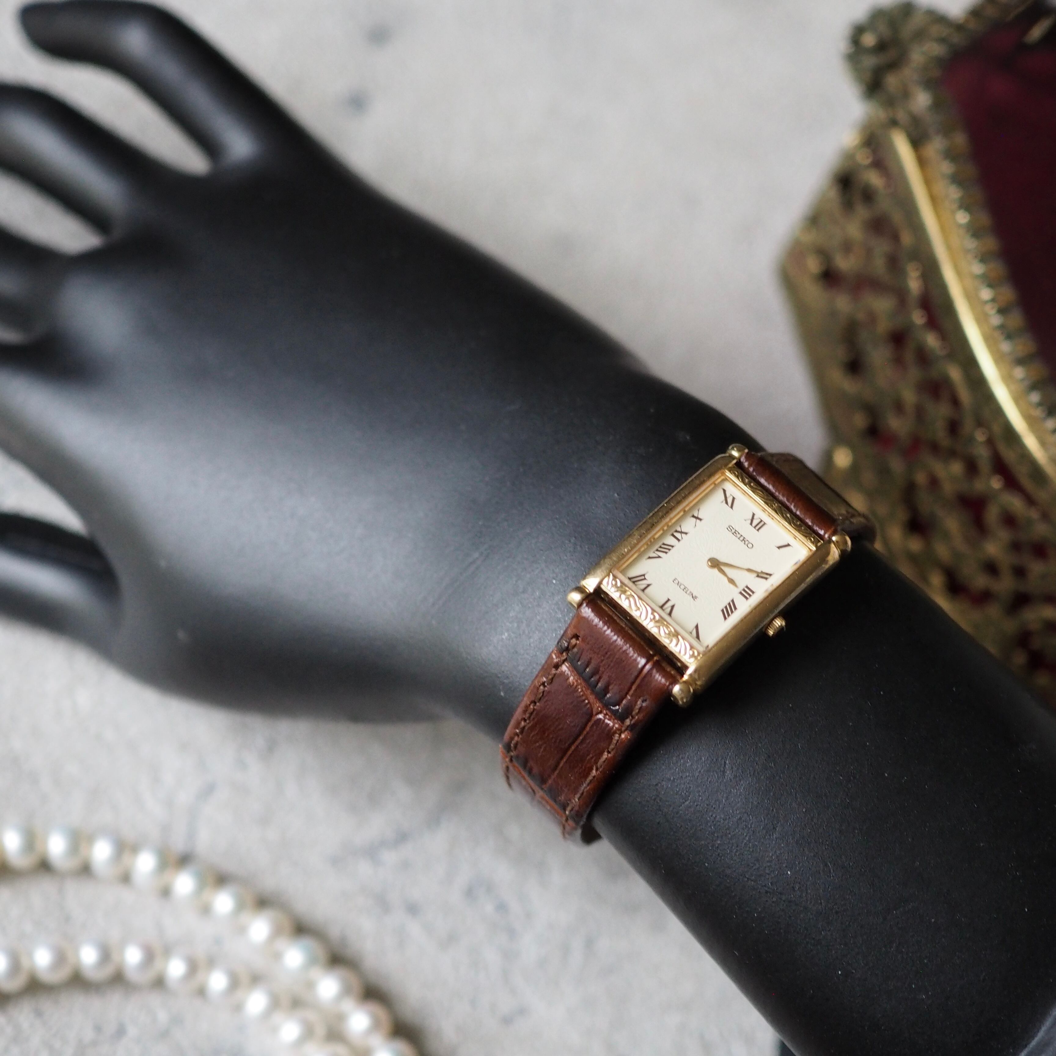 ゴールドのレクタンギュラーケースには細かな彫り細工がほどこされ、女性らしい落ち着きのある、知的な印象のヴィンテージ ・セイコー。
