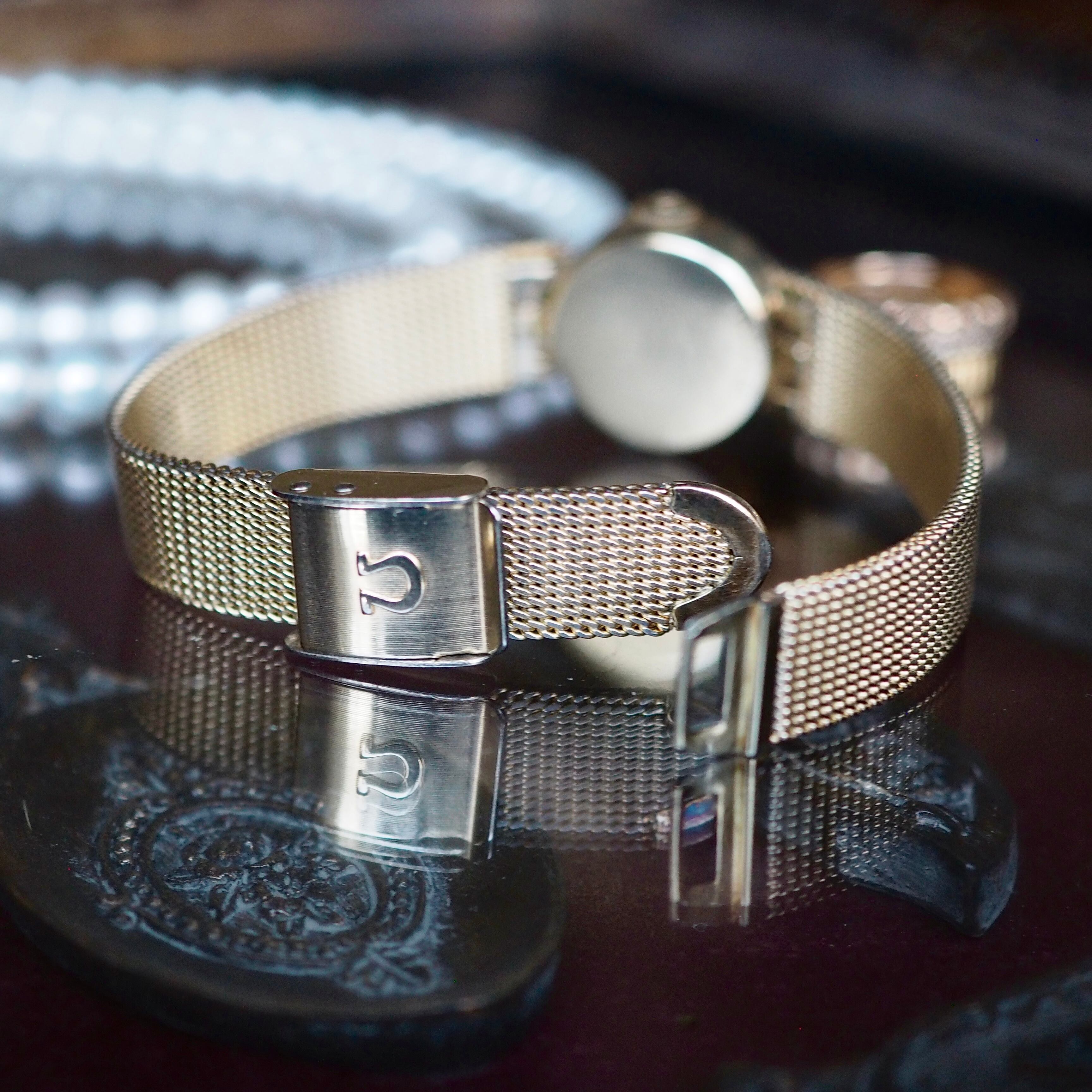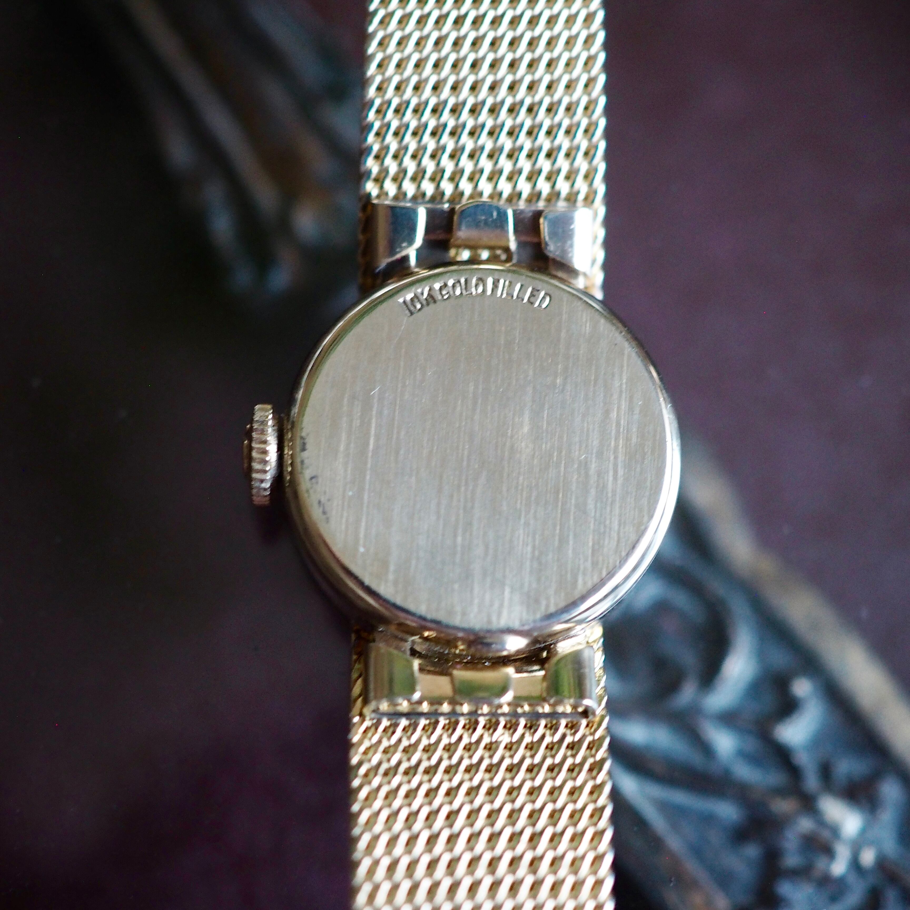 10金張りの厚い金のこっくりとしたラウンド型ケースのベゼルとキラキラと光るニュアンスのあるベルトが上品できちんと感があります。