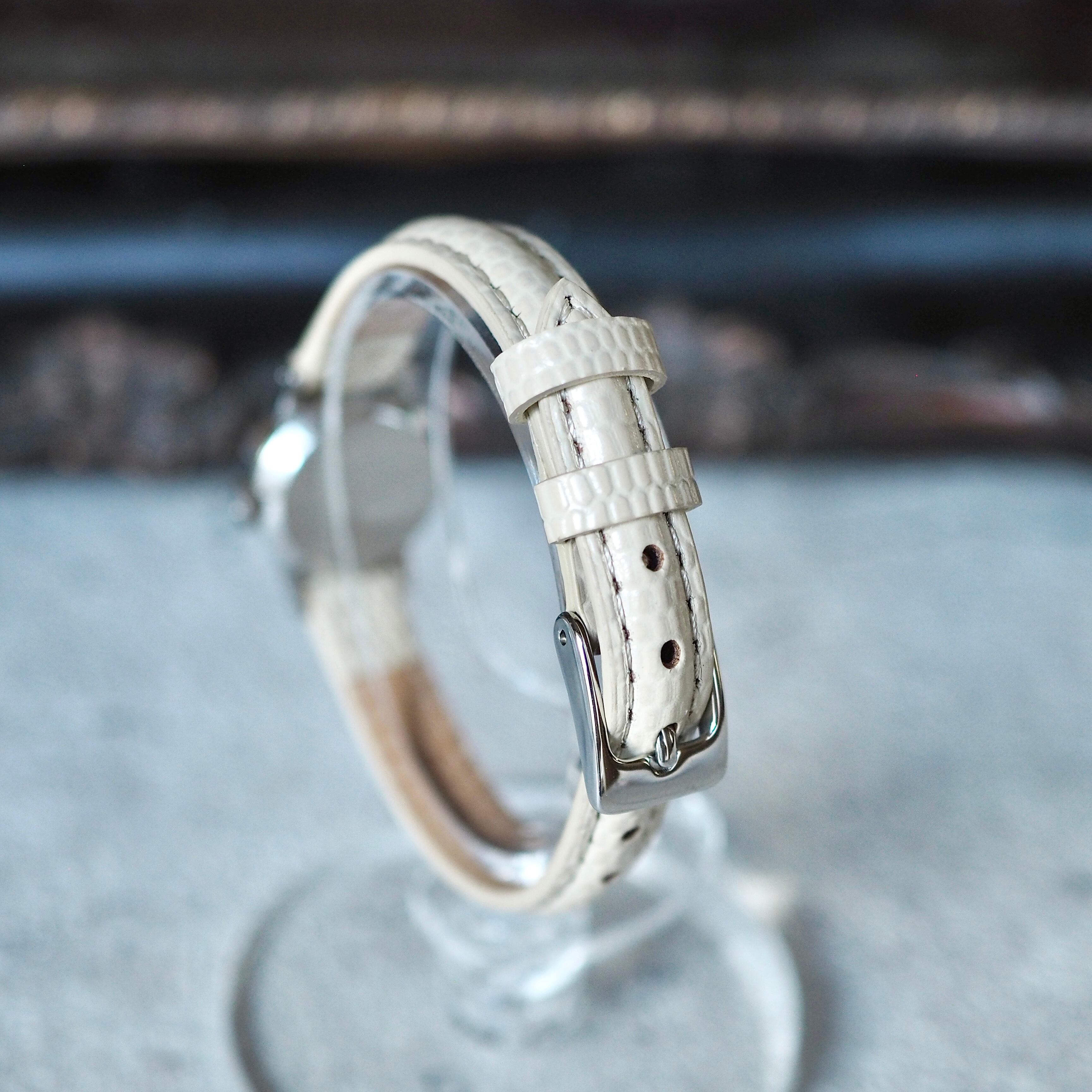 肌なじみの良いアイボリーのリザード型押し新品ベルトに交換しましたのですぐに気持ちよくお使いいただけます。