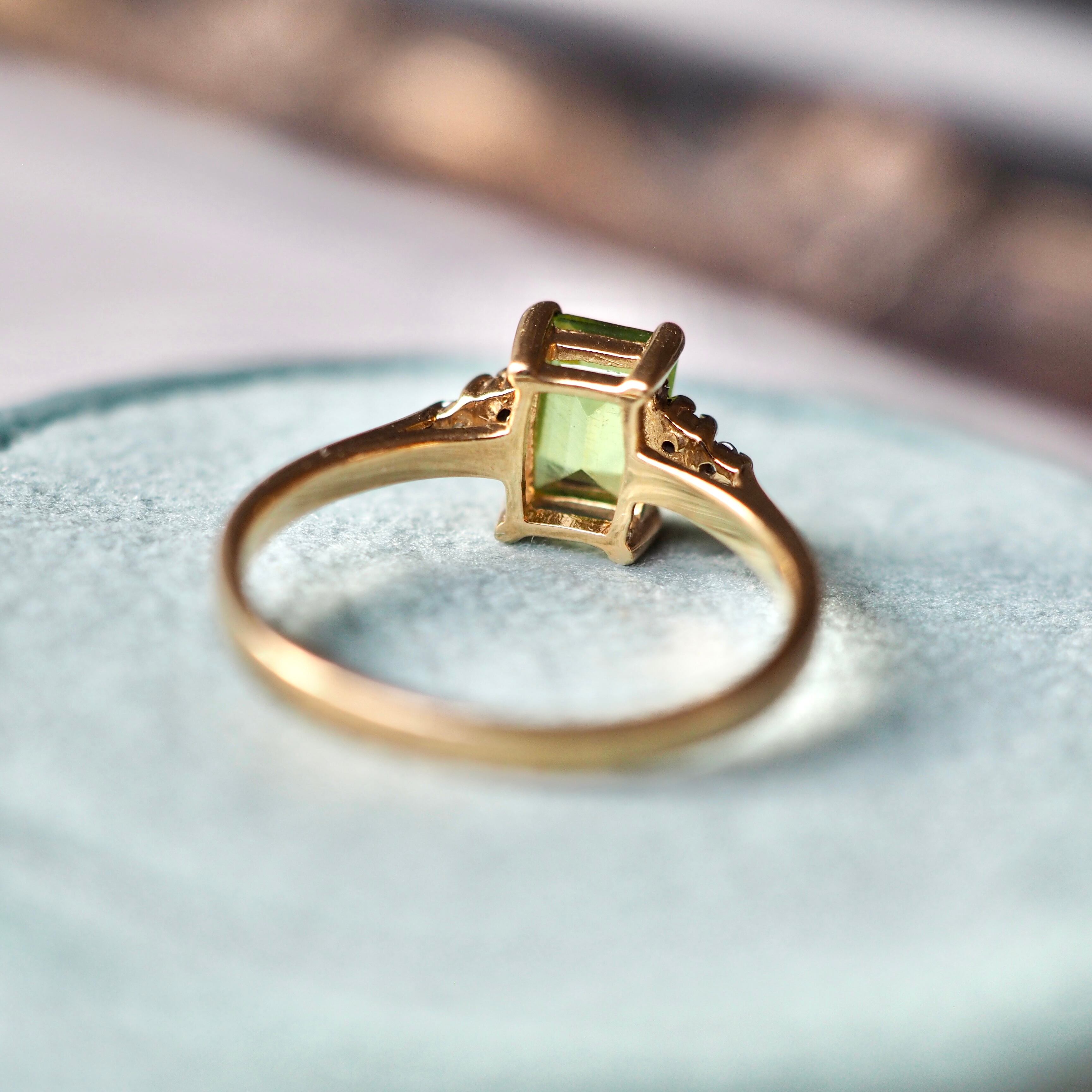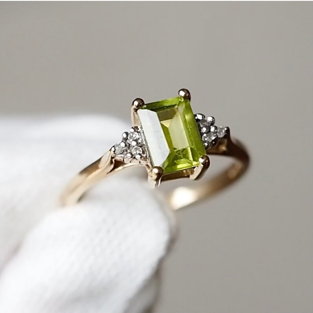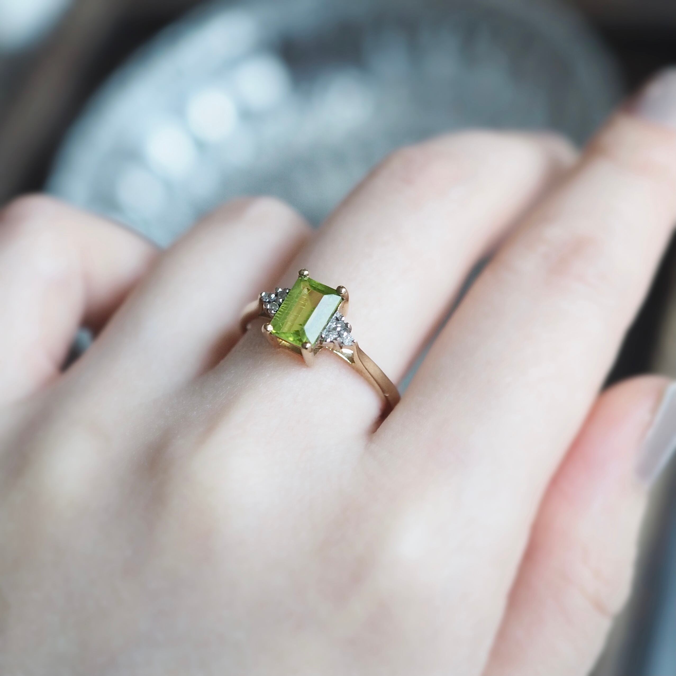 大粒のエメラルドカットのペリドットとダイヤモンドが組み合わされたかわいらしさと凛とした上品さが絶妙なバランスのヴィンテージリングです。