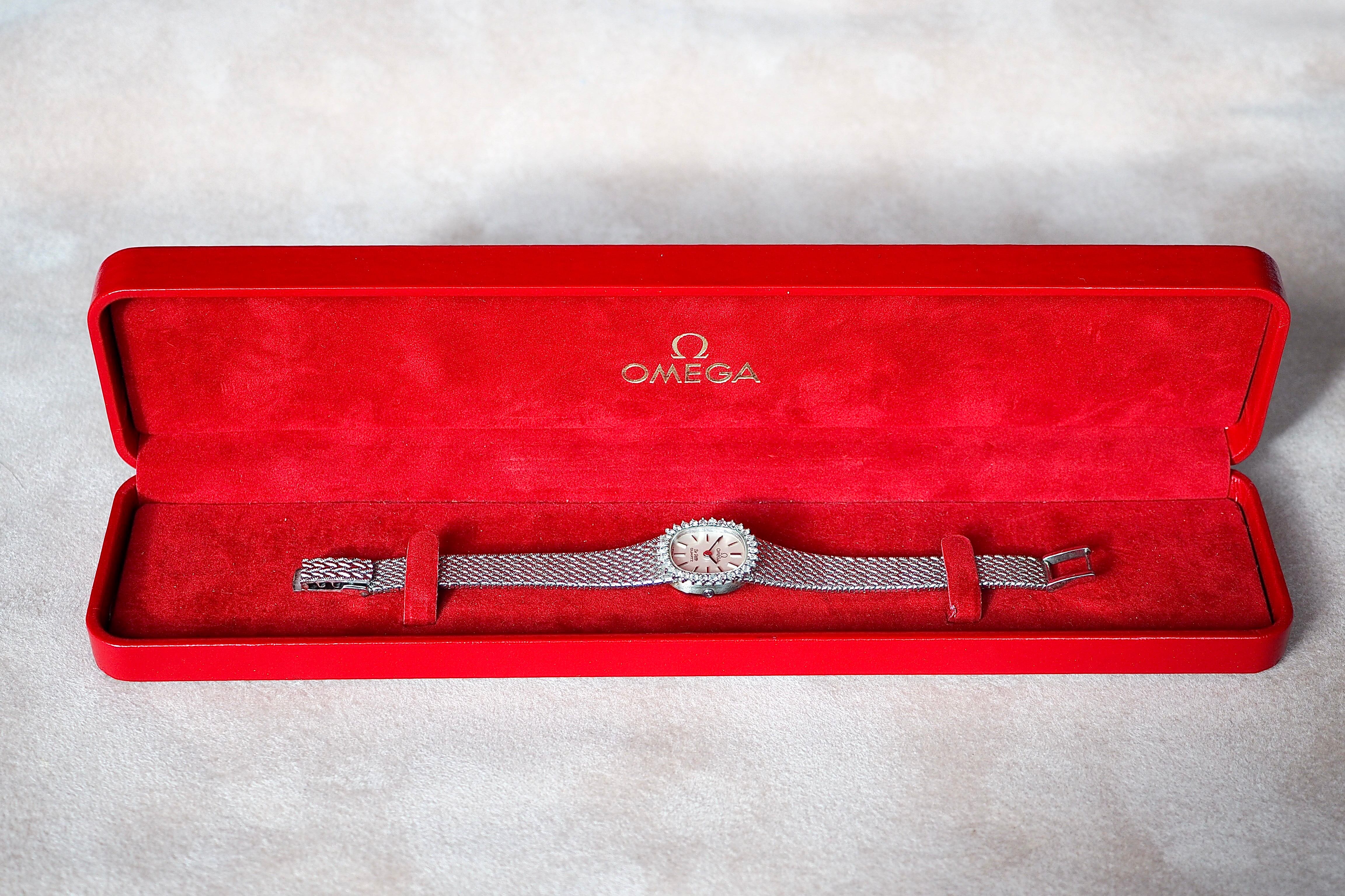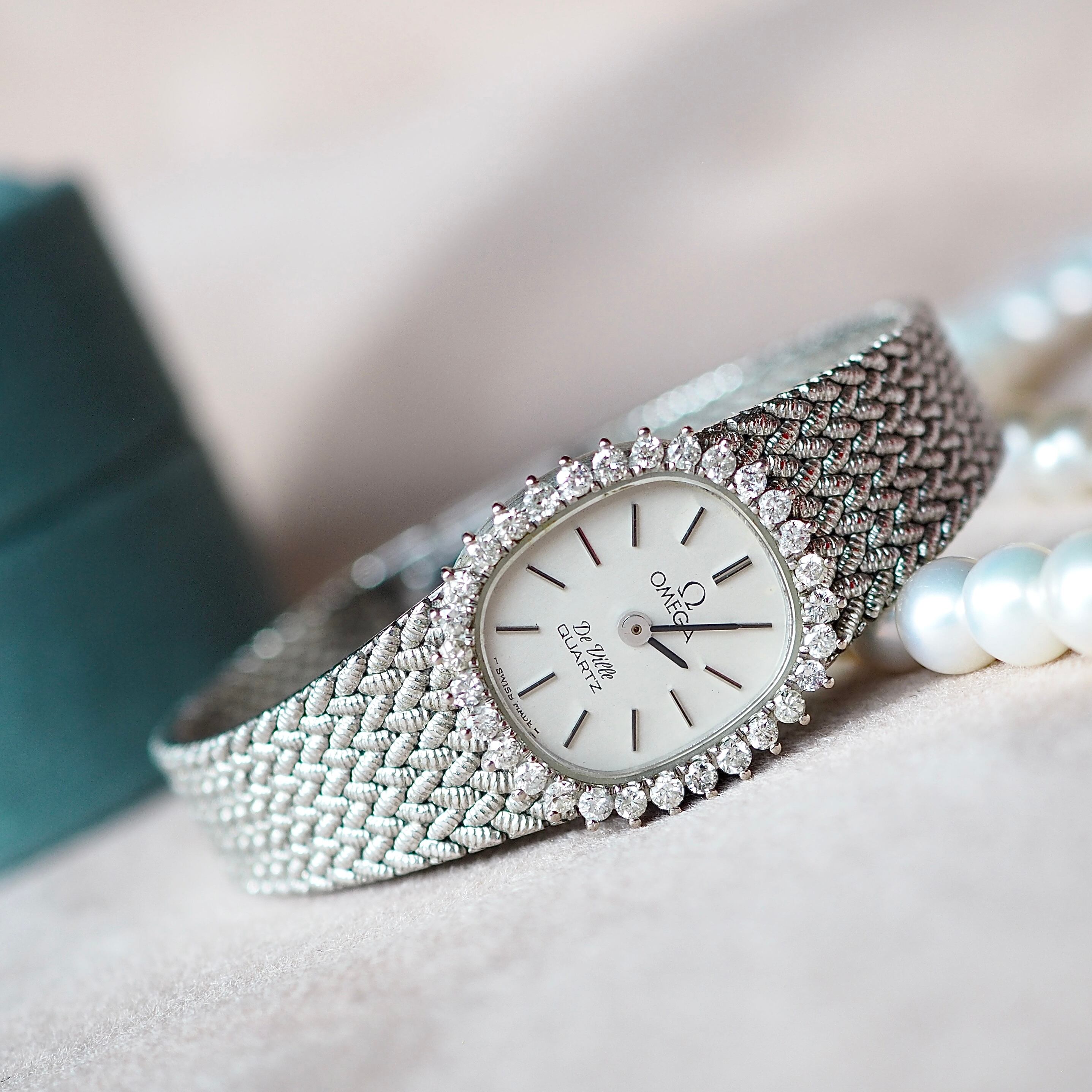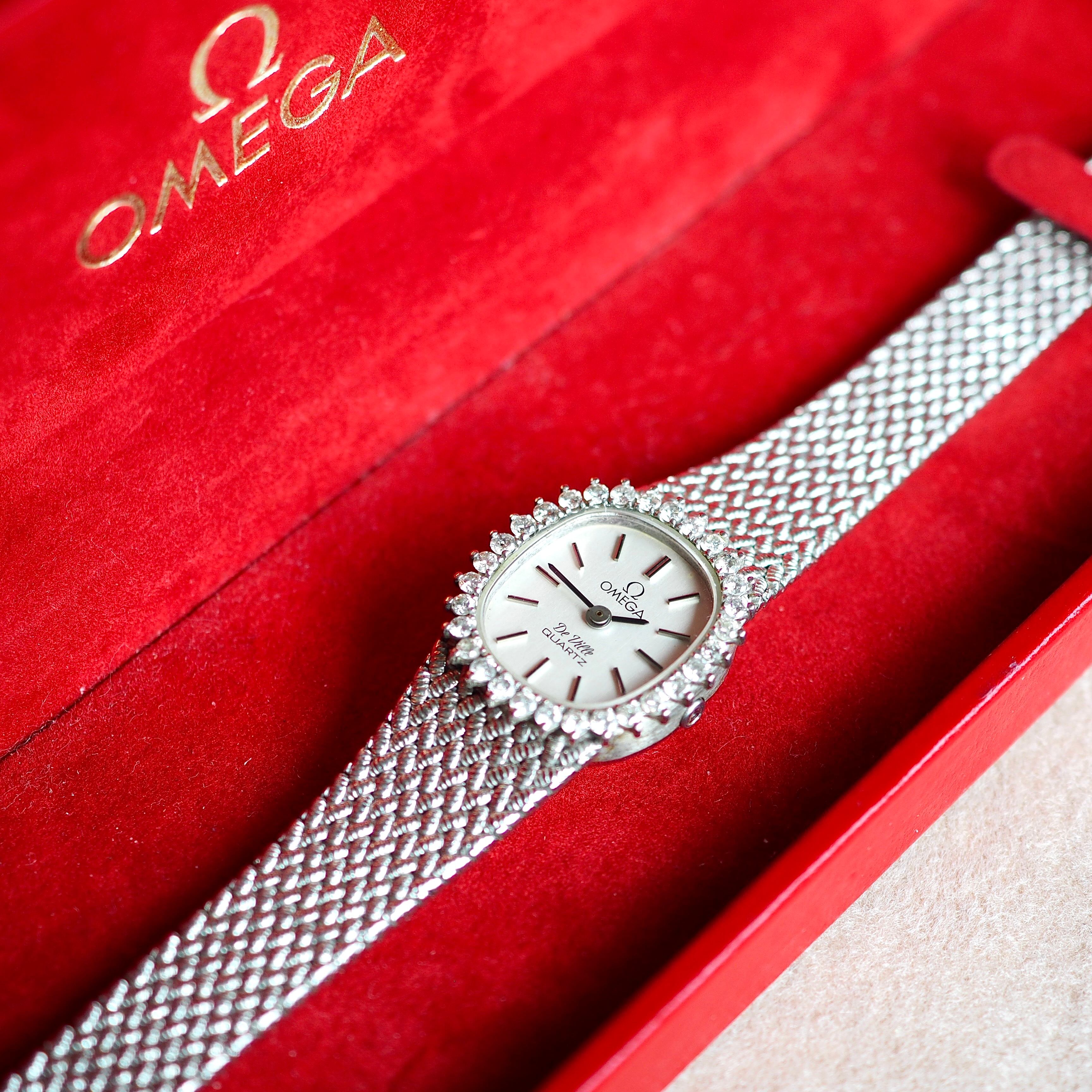 オーバル型ケースをぐるりと囲んだダイヤモンドが贅沢でなアンティーク・オメガ。