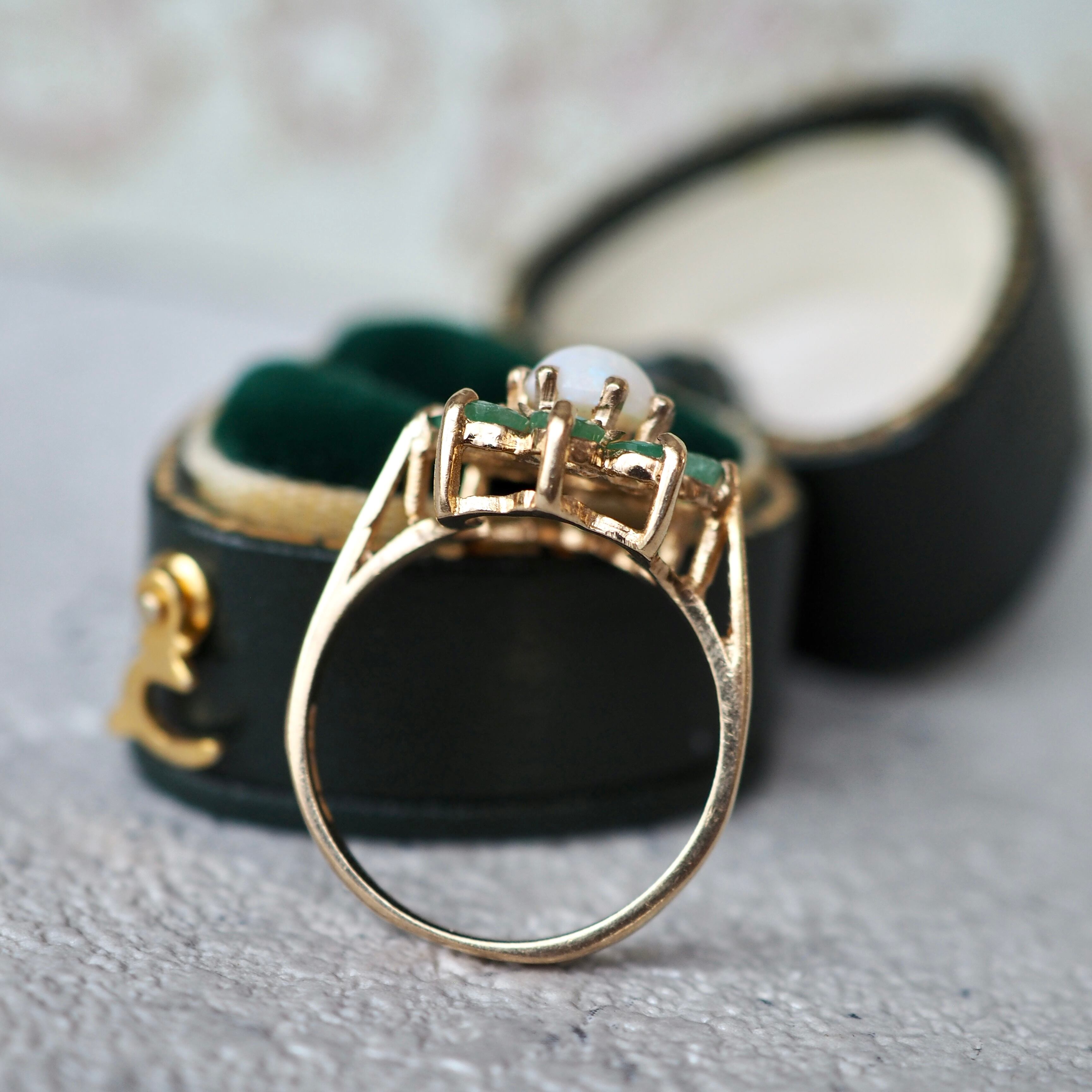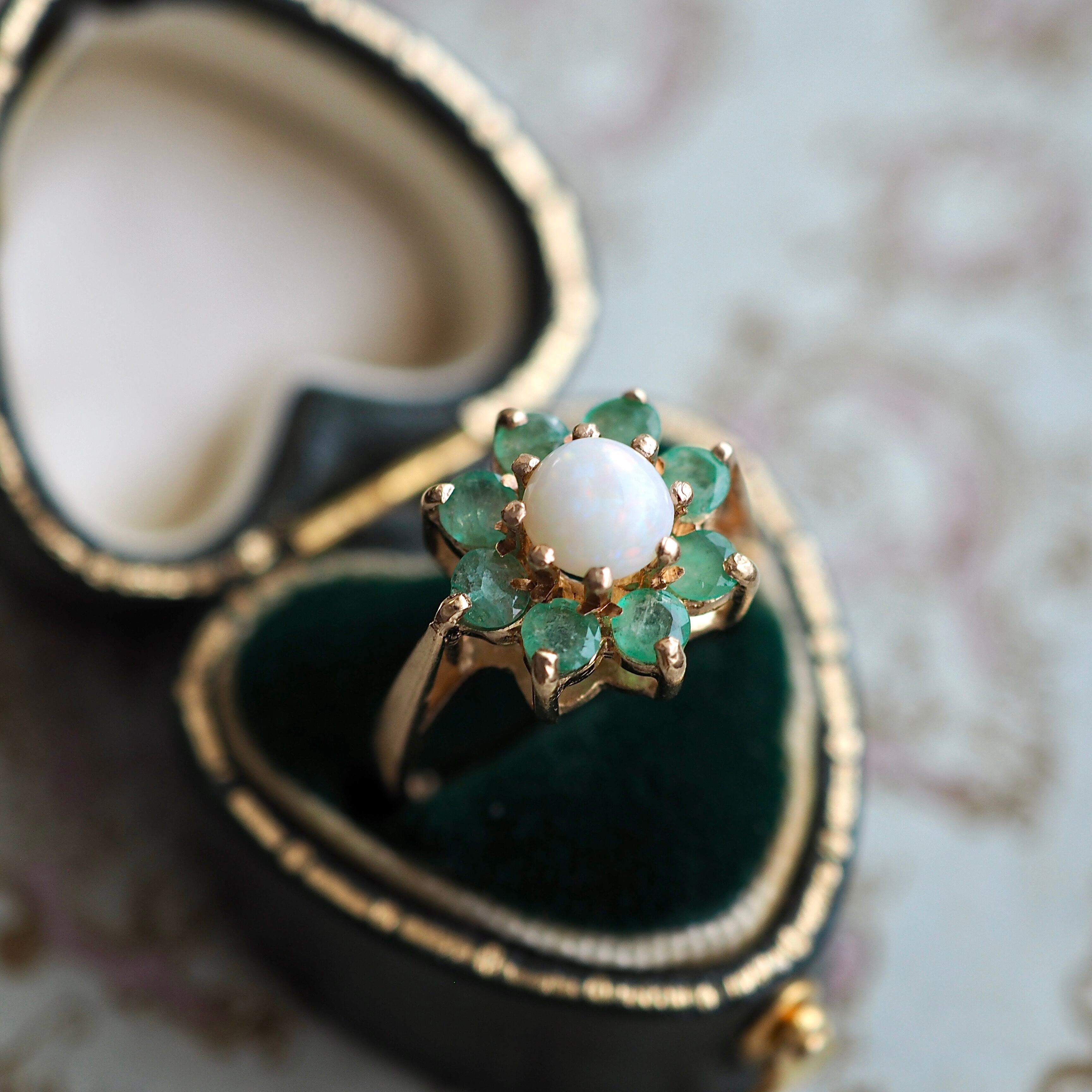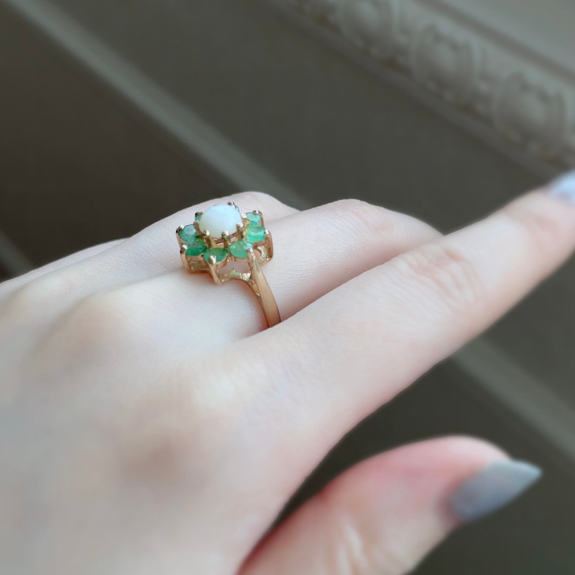 中央のオパールとシングルカットのエメラルドで作られたヴィンテージの大きなフラワーリングです。