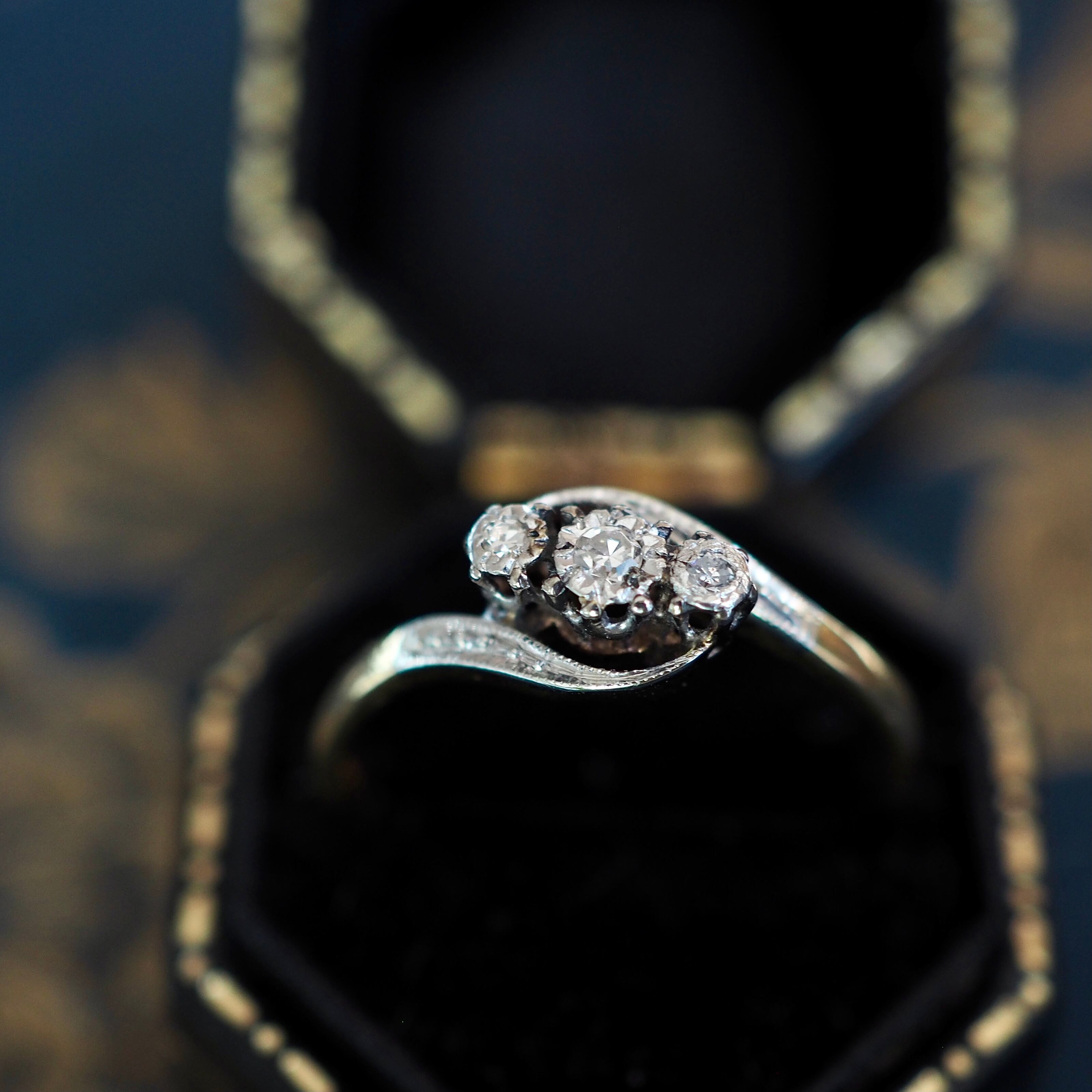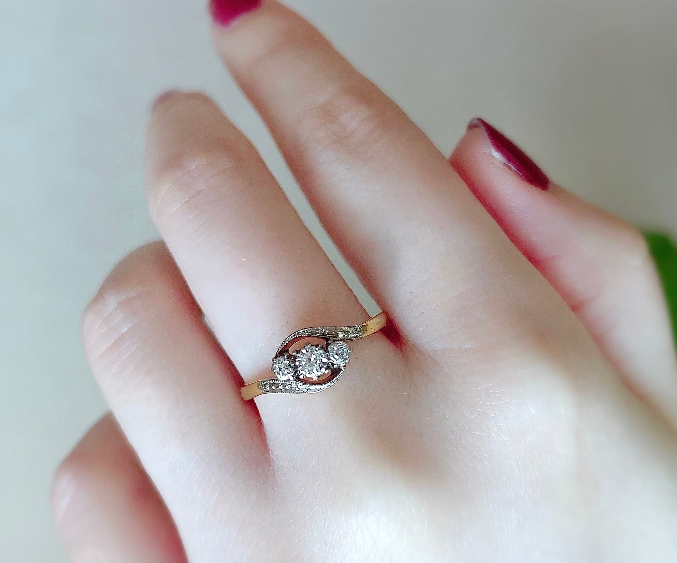アームから台座に向けてしなやかに流れる曲線に包み込まれるように3粒の天然ダイヤモンドがセットされたクロスオーバーのトリロジーリングです。