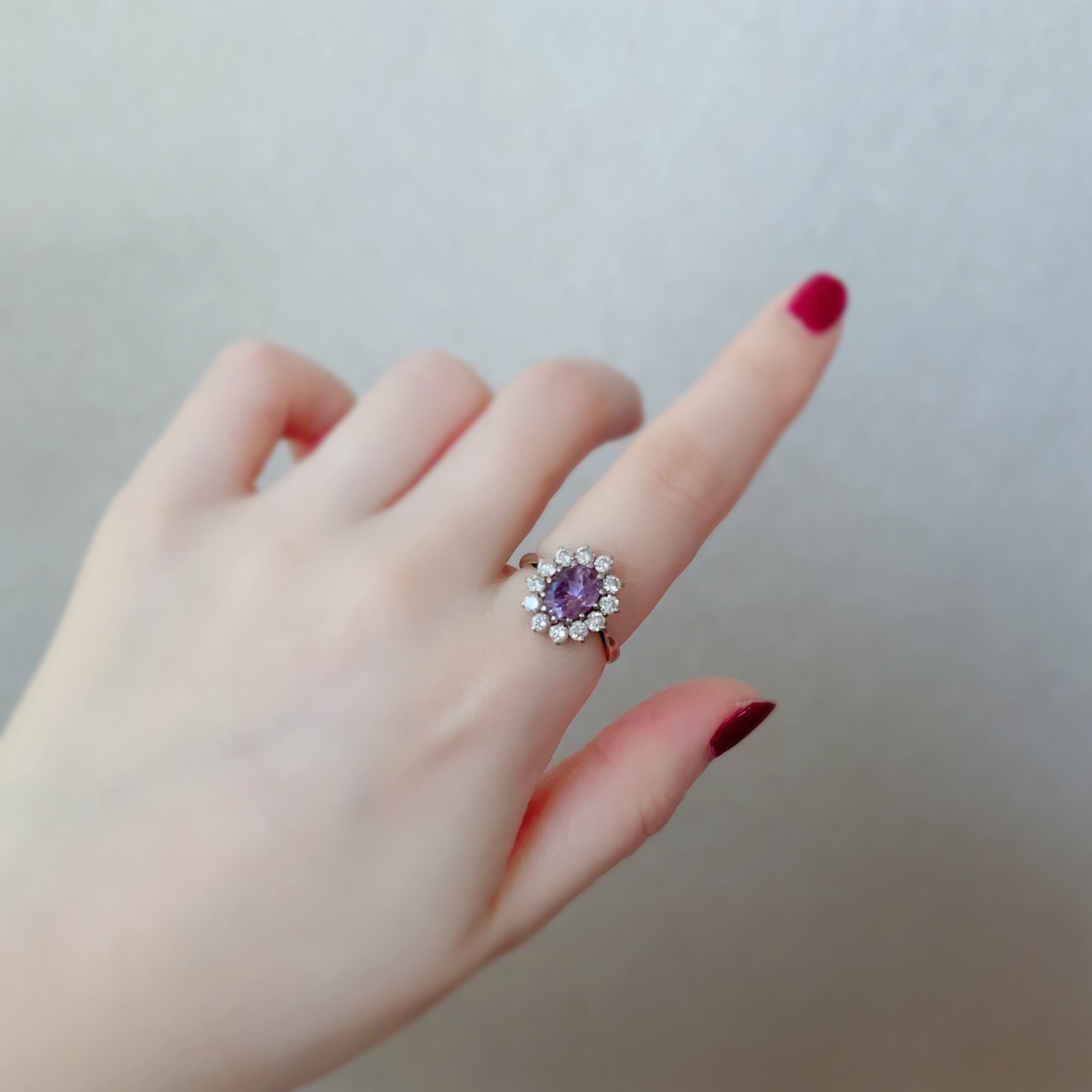 取り巻きのジュエルには眩く煌めくホワイトサファイアが添えられ、アメジストの透明感とサファイアの強い輝きのバランスが絶妙な調和をもたらしています。