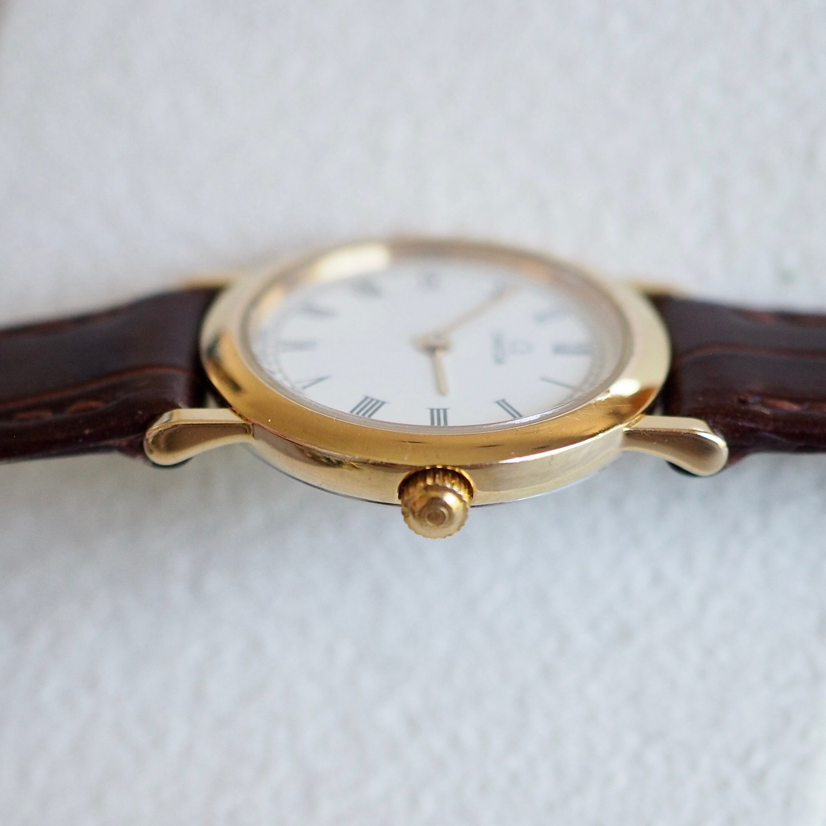 ゴールドのラウンドケースにローマンインデックス・レイルウェイの文字盤がクラシカルなデザイン。