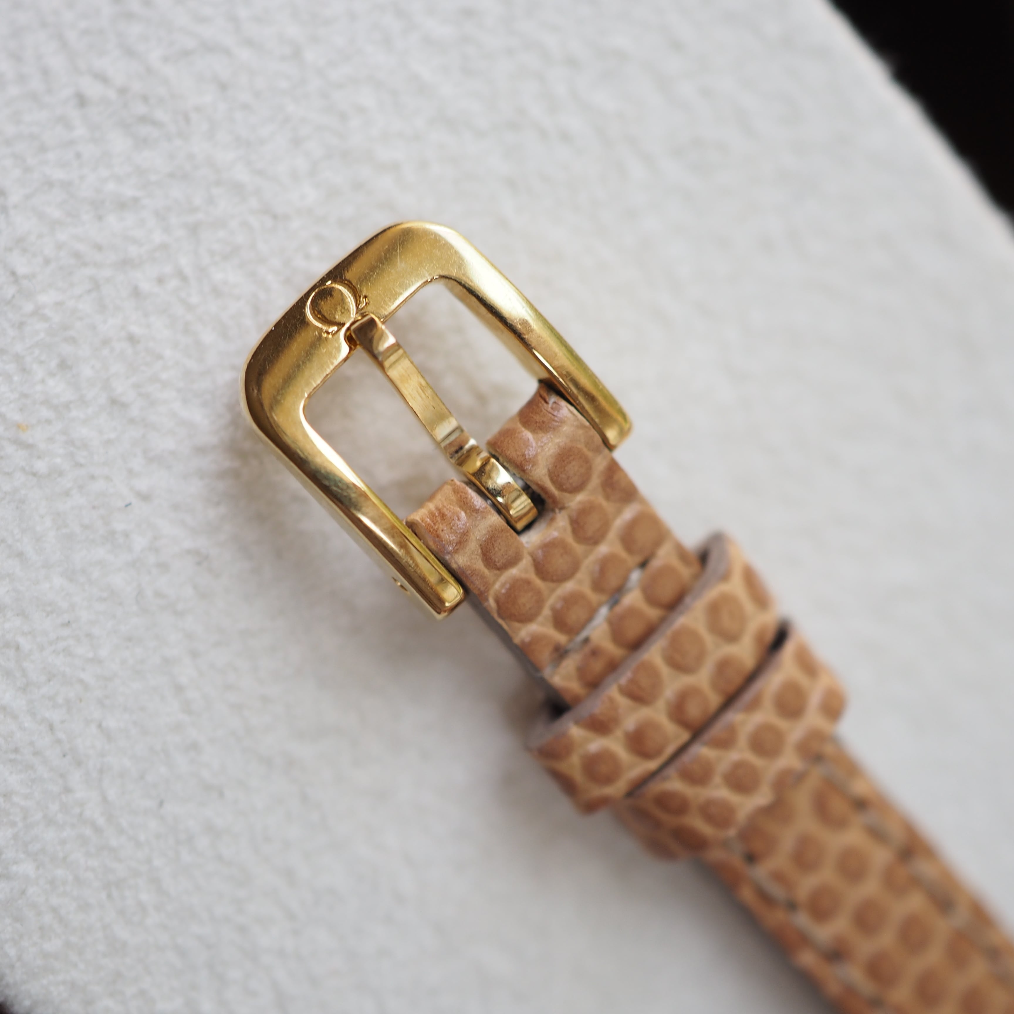 フランス・ピエールラニエ社製のキャメルカラーの新品リザード型押しベルトを付けております。