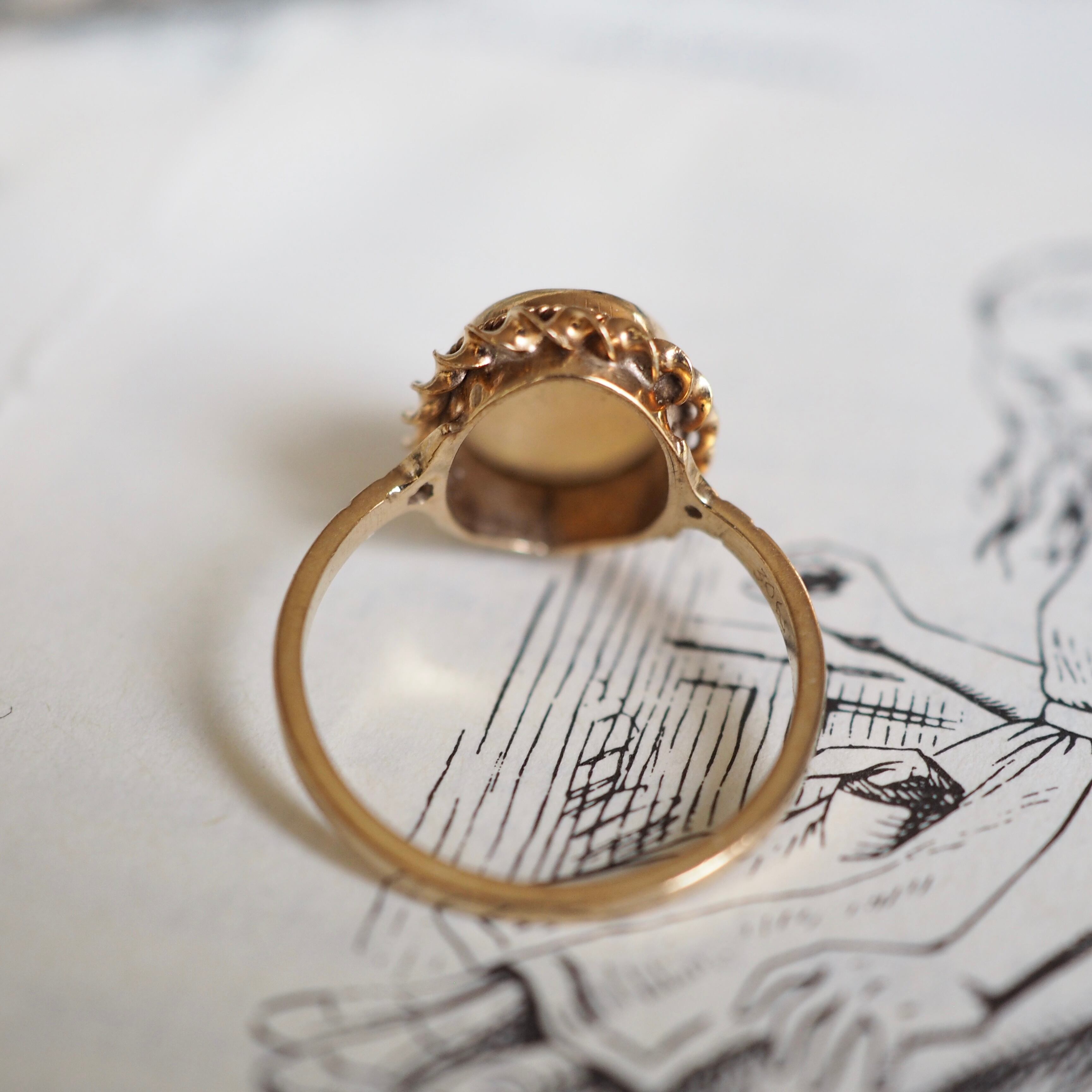 石を覆っているツイストされたベゼルがクラシカルで優しげな雰囲気のヴィンテージリングです。