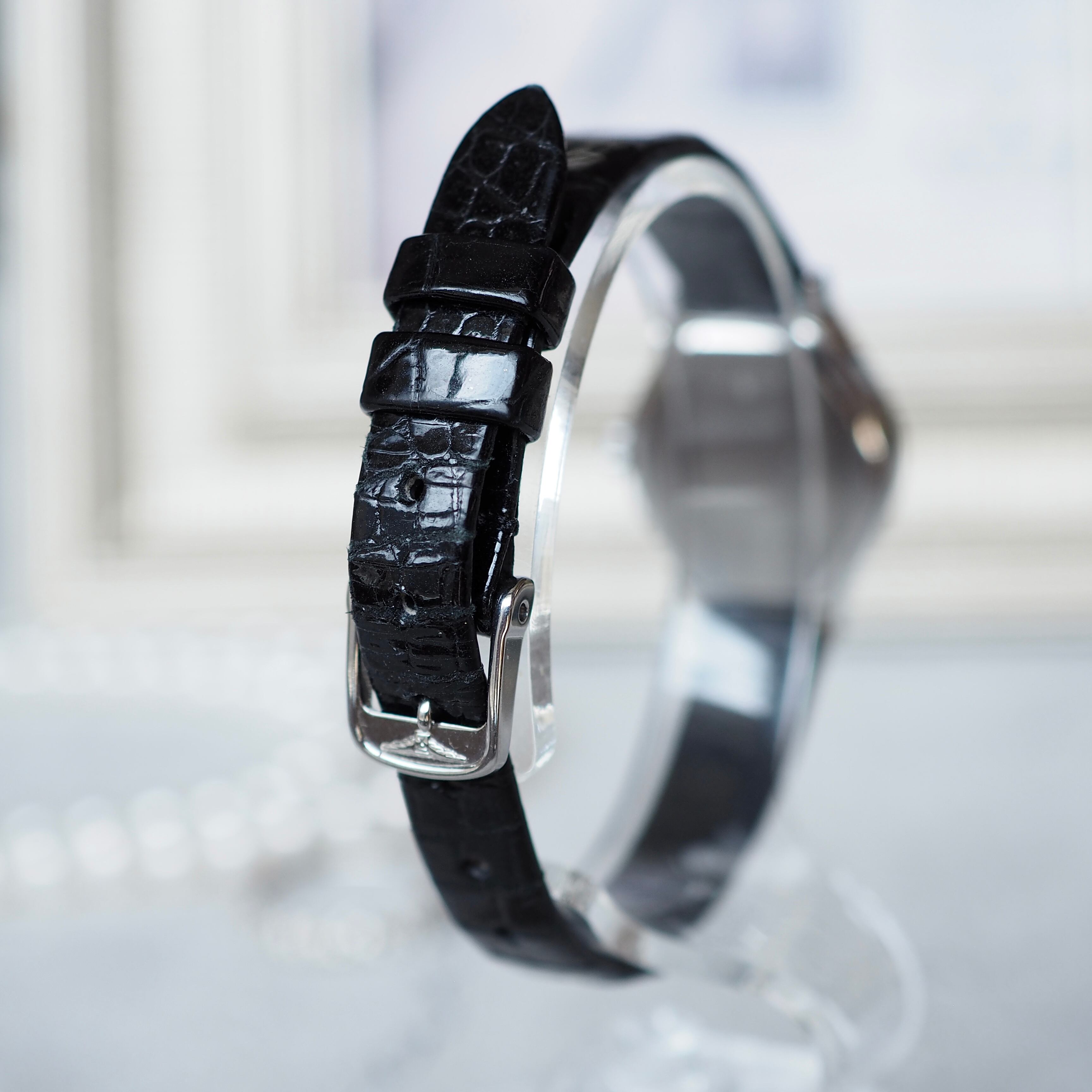 クラシカルなアラビアインデックス、高級時計にしか使われないブルースチール針、ブレゲ針、艶のあるアリゲーターベルトなど、気品のあるゴージャス感を演出しています。