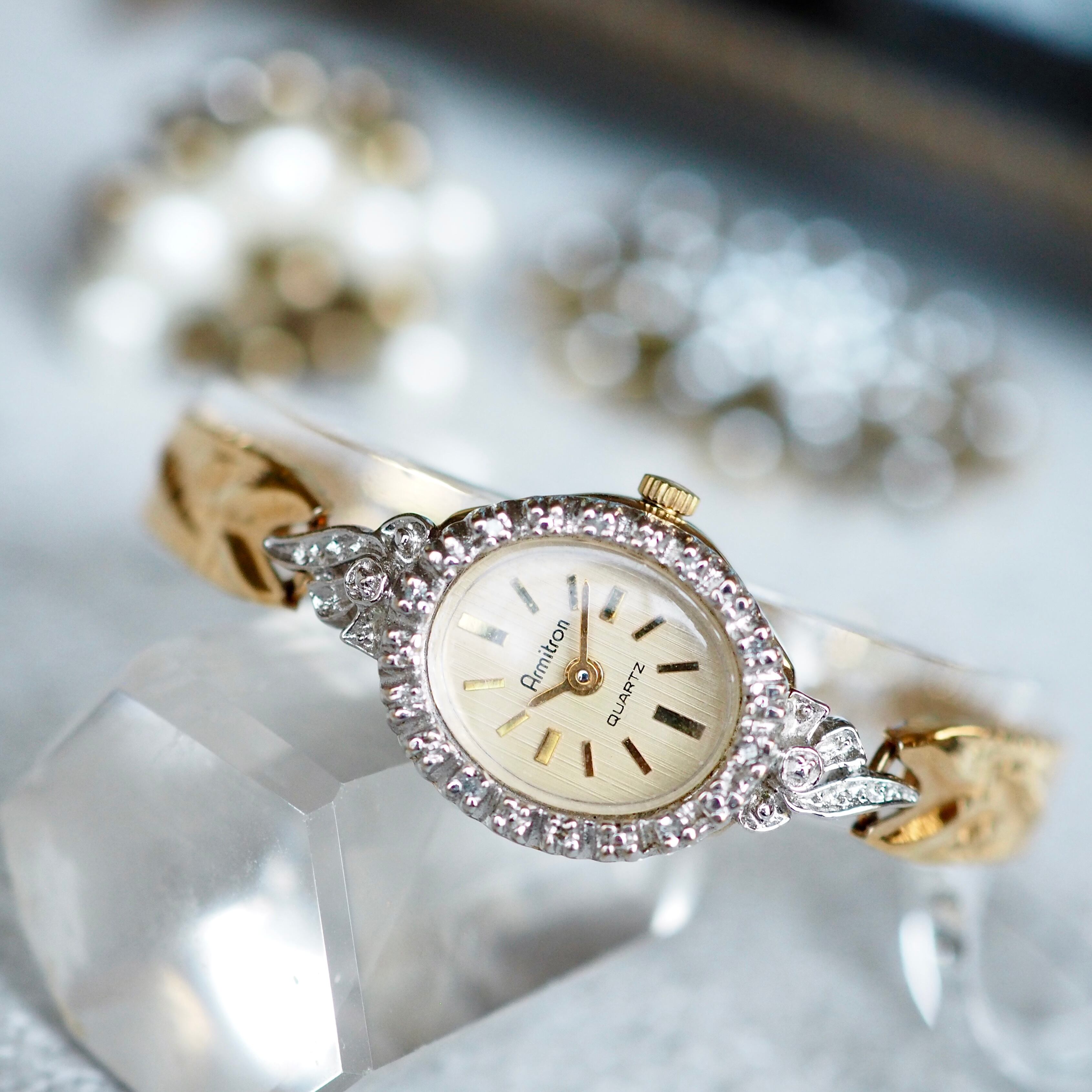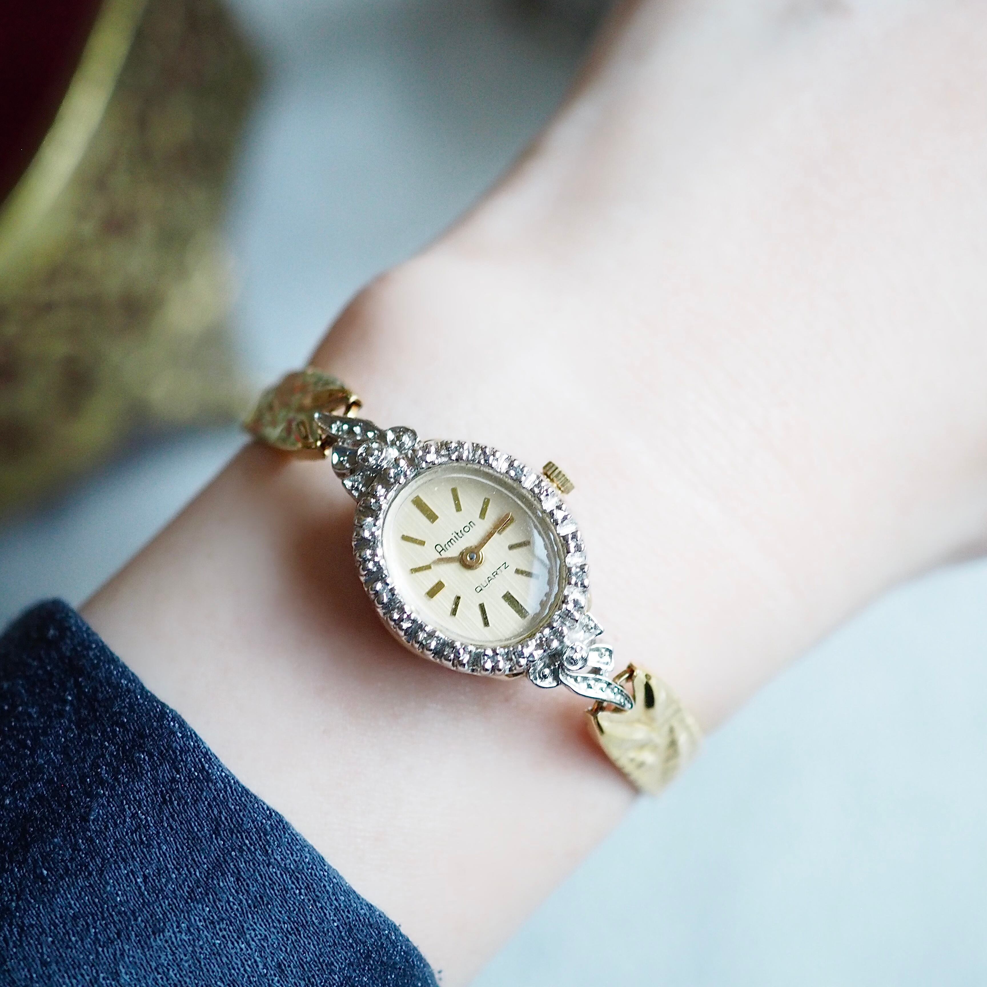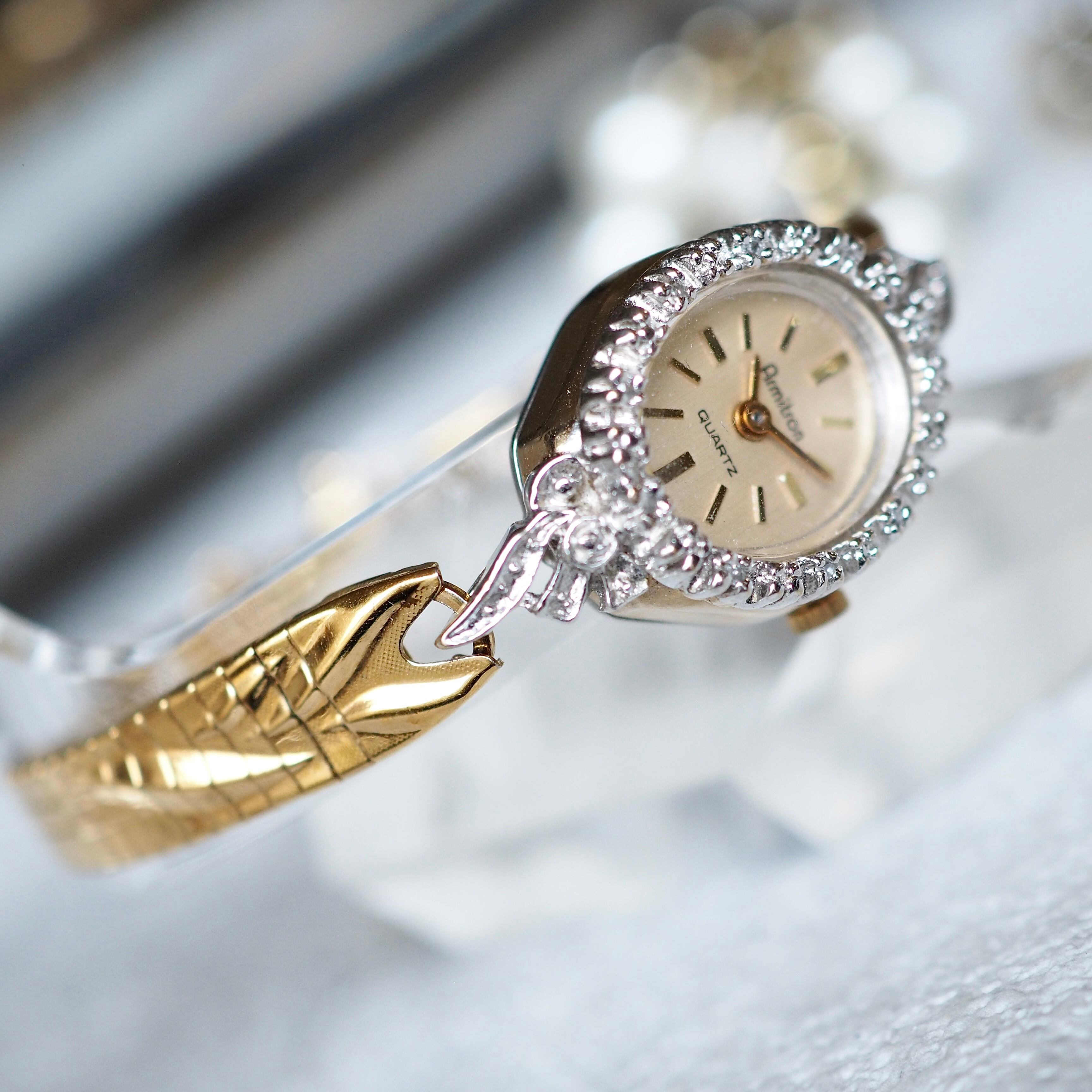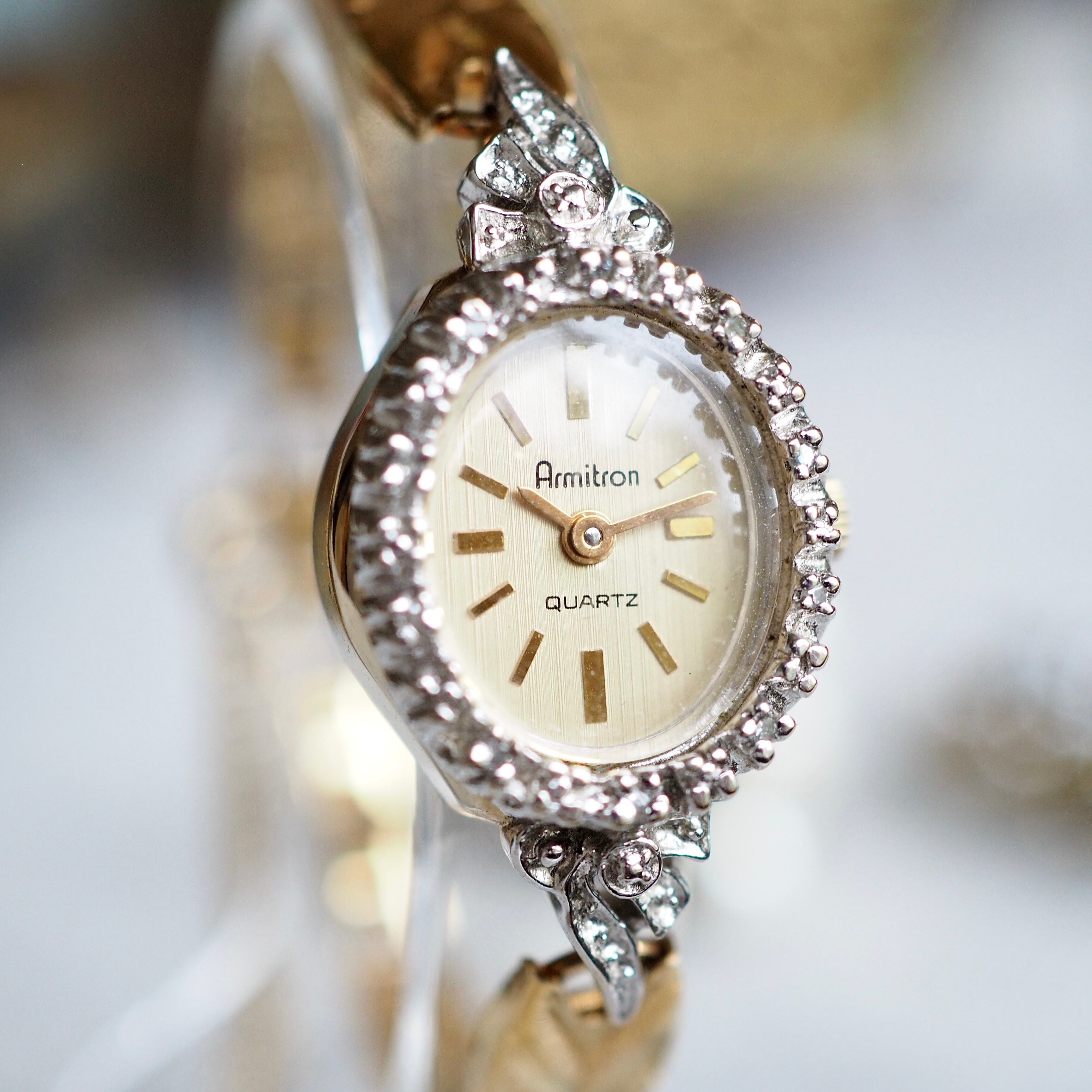 ヴィンテージ ・アーミトロンのドレスウォッチです。オーバル型ケースのベゼルとリボンの形をしたラグには小さなダイヤモンドがセッティングしてあります。