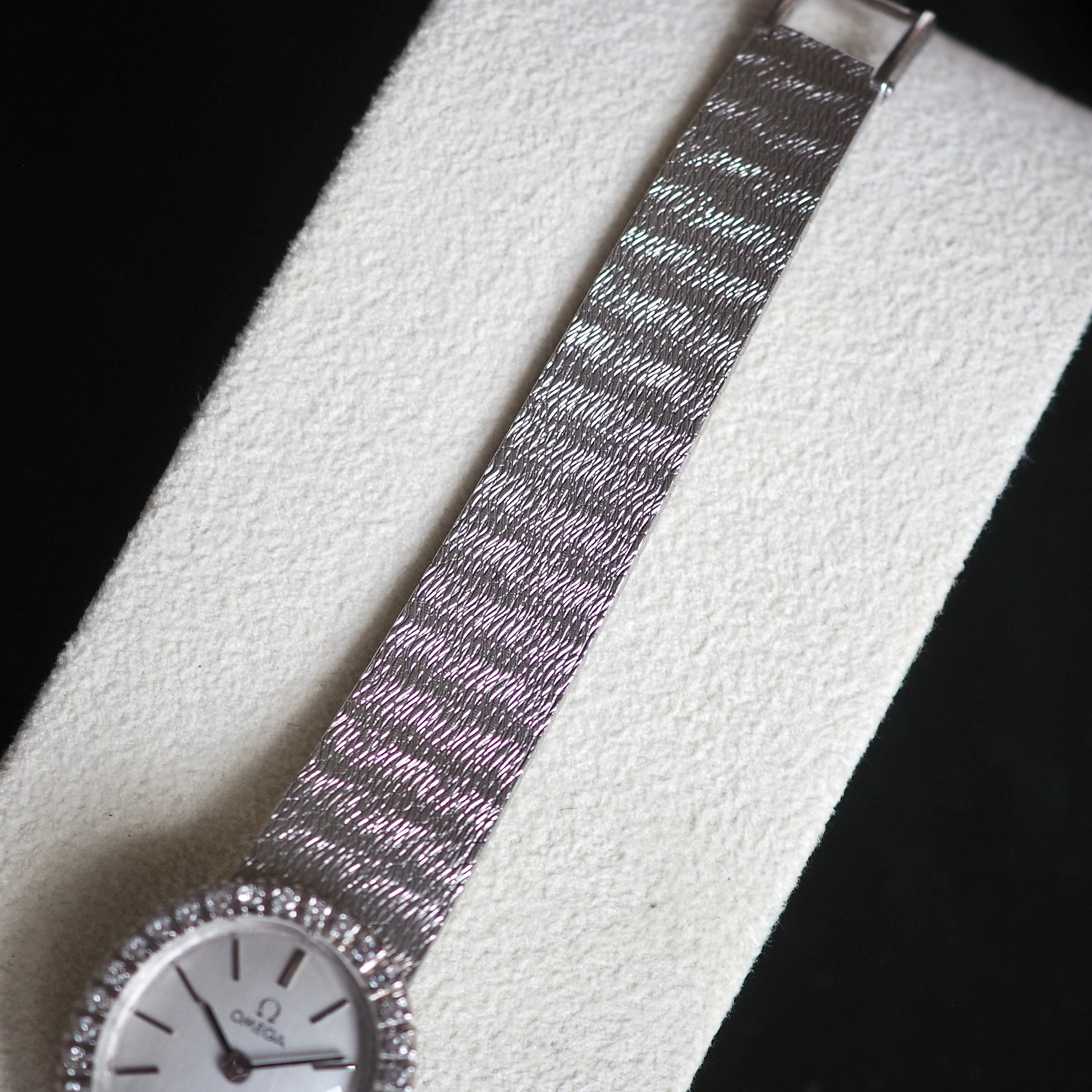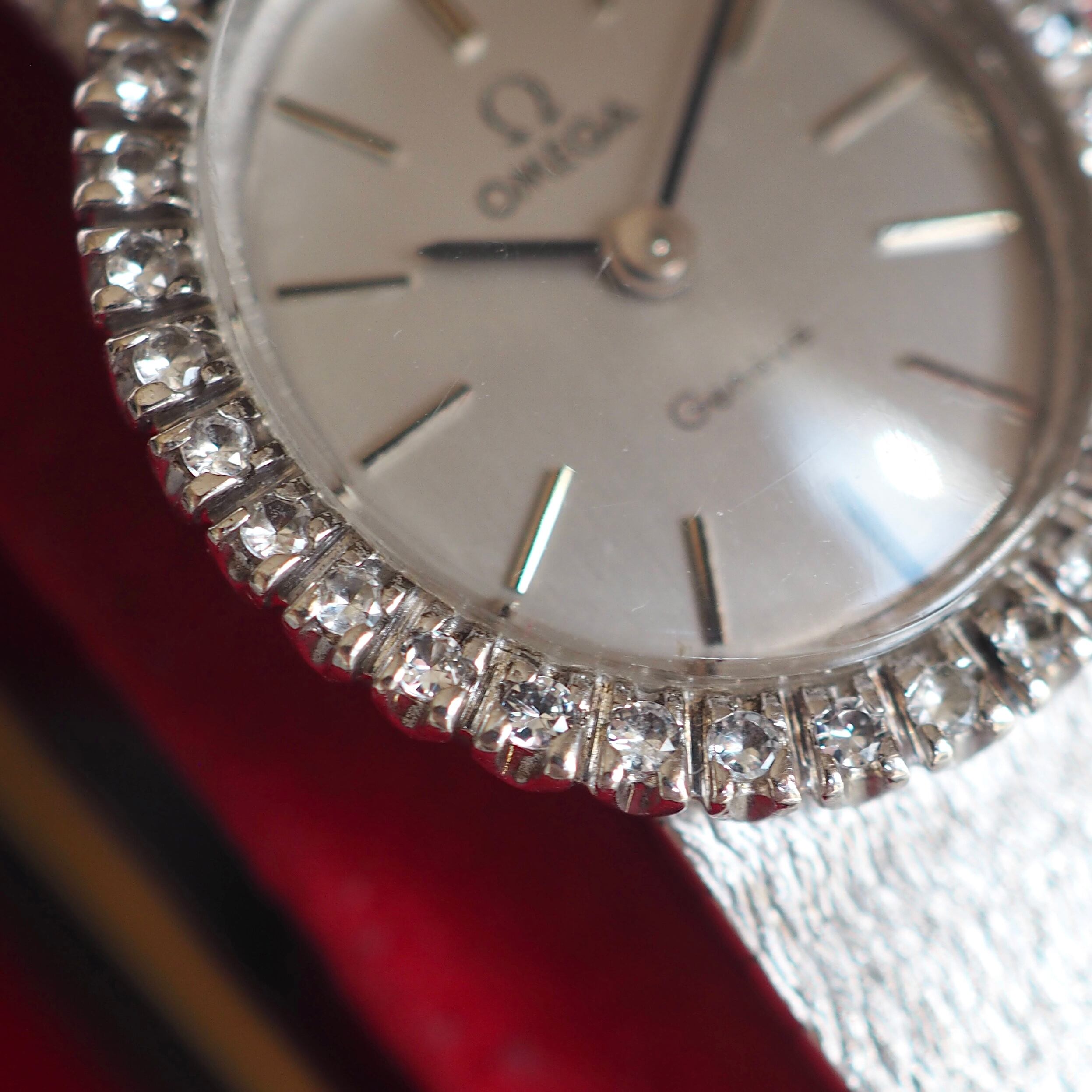 オーバル型ケースをぐるりと囲んだ32Pのダイヤモンドが贅沢でエレガントな60年代製アンティーク・オメガ。