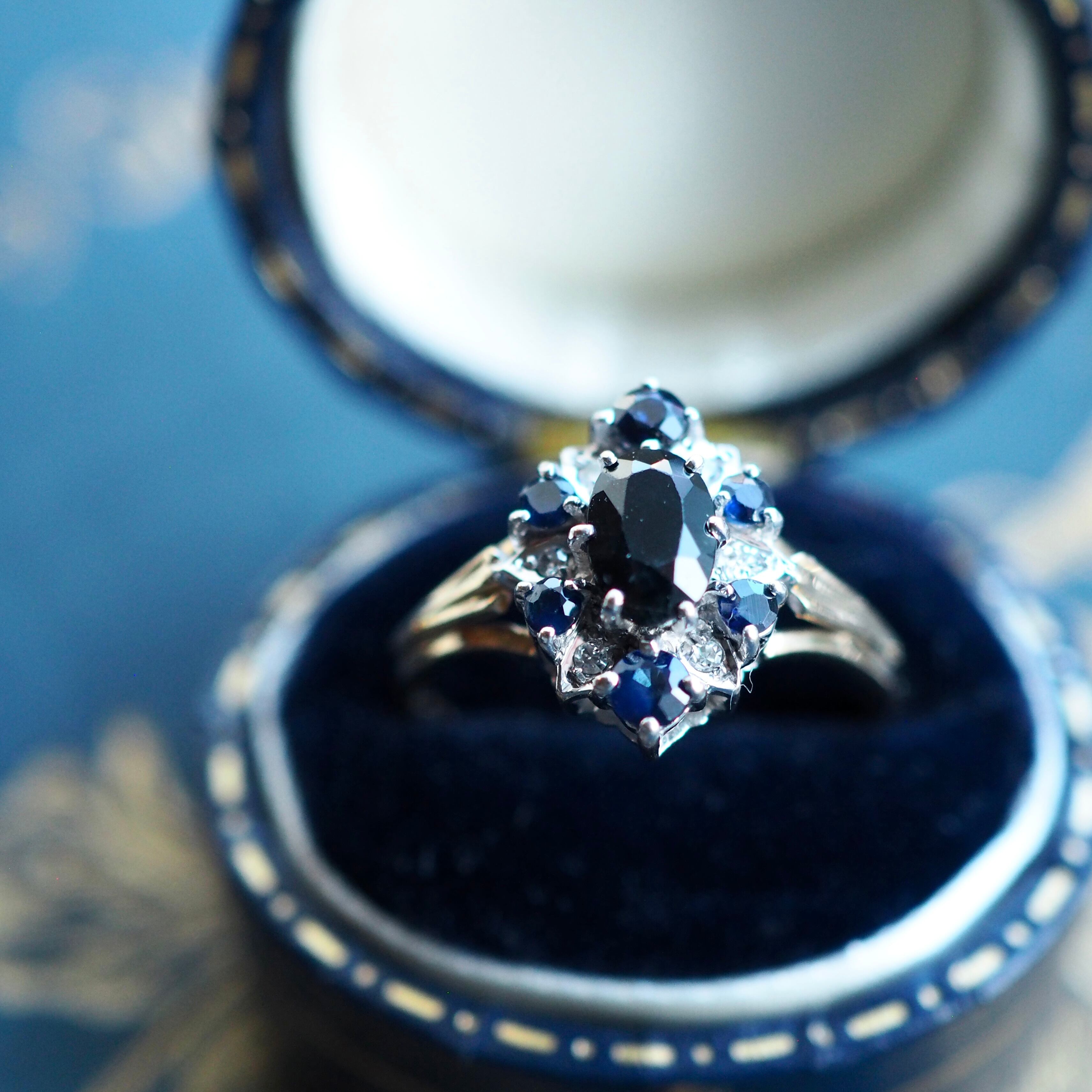 ベゼルはマーキス型。中央のオーバルカットされたサファイアを包み込む花弁のように、ラウンド型のサファイアと、ホワイトゴールドに埋め込まれたダイヤモンドがセットされた繊細なディテールのシックで美しいリングです。