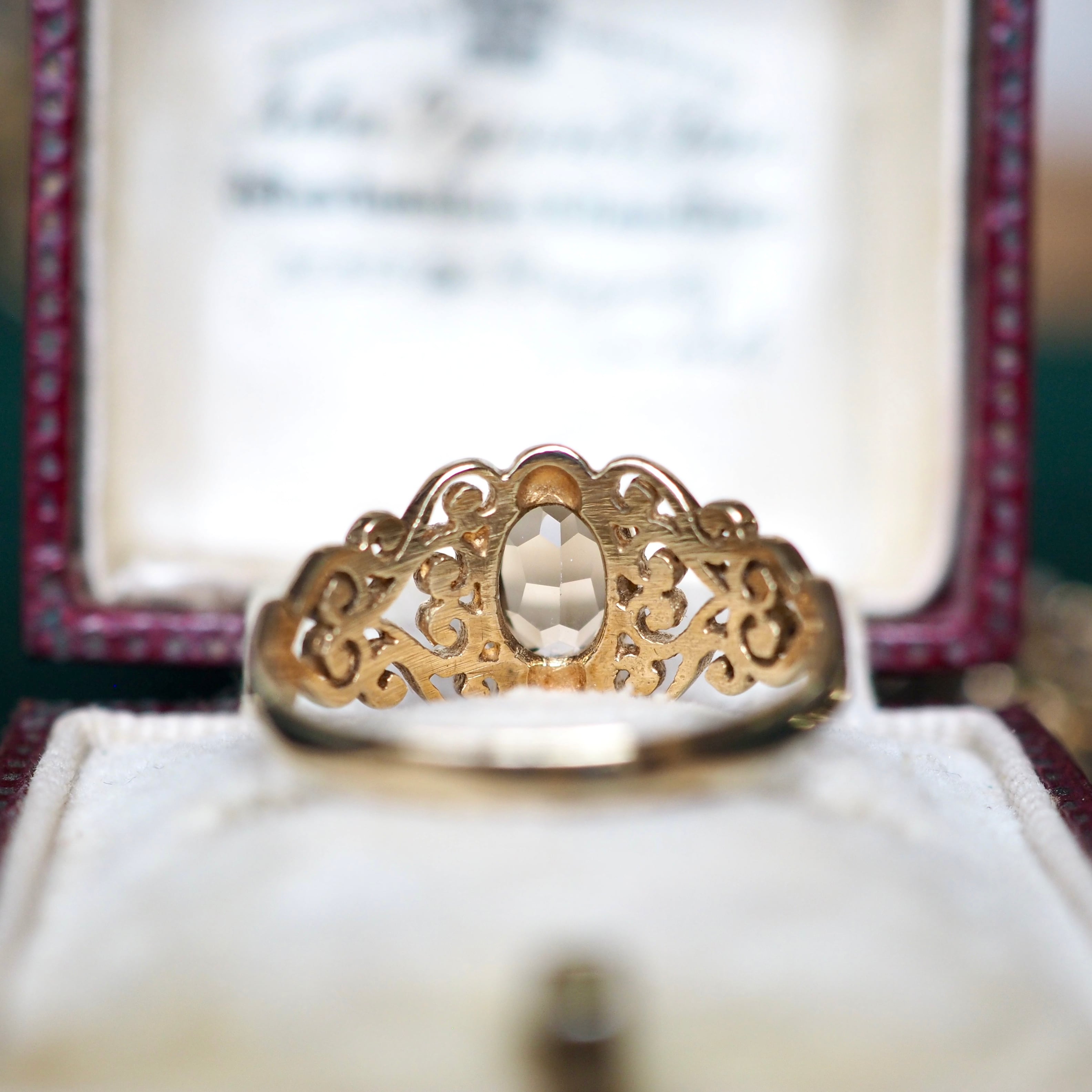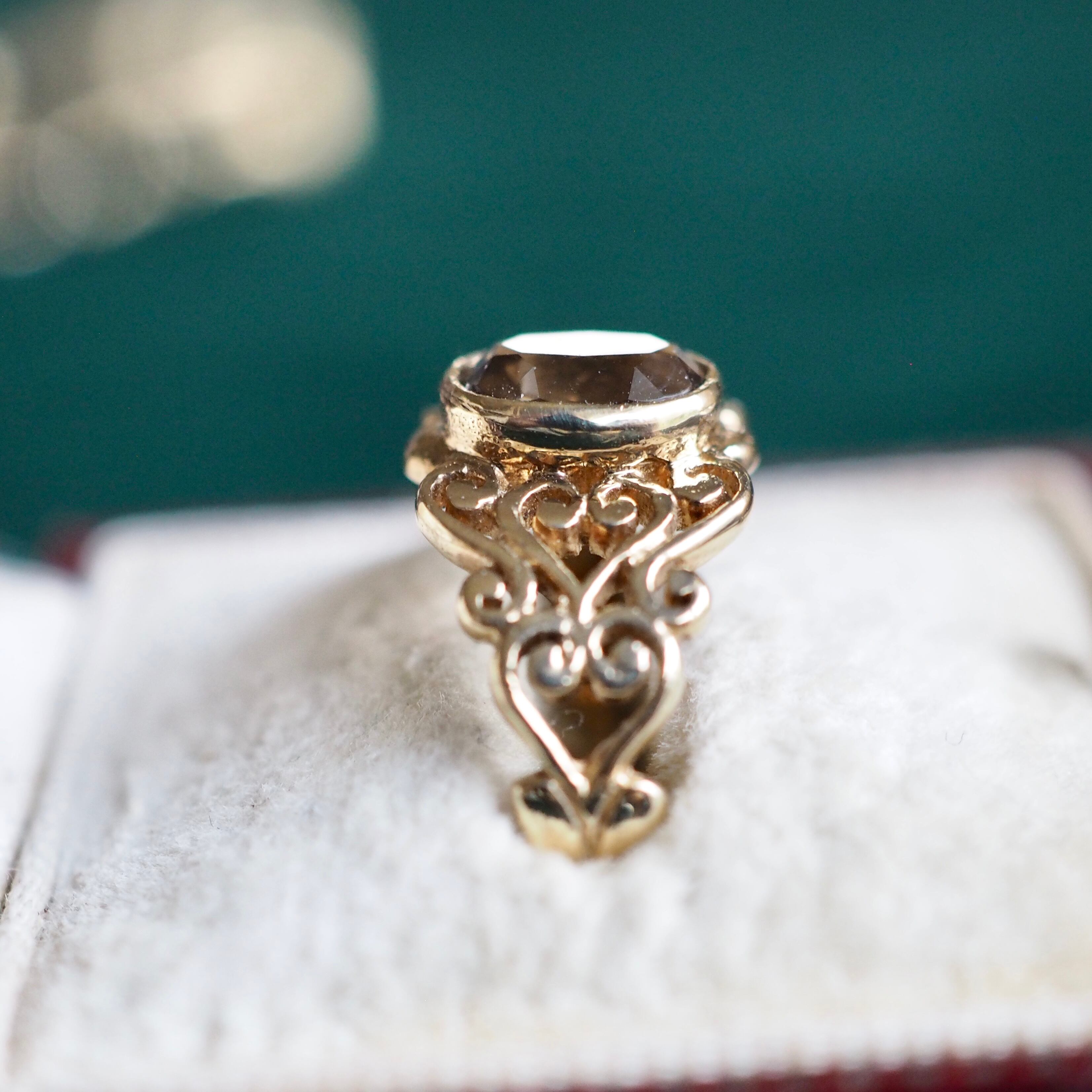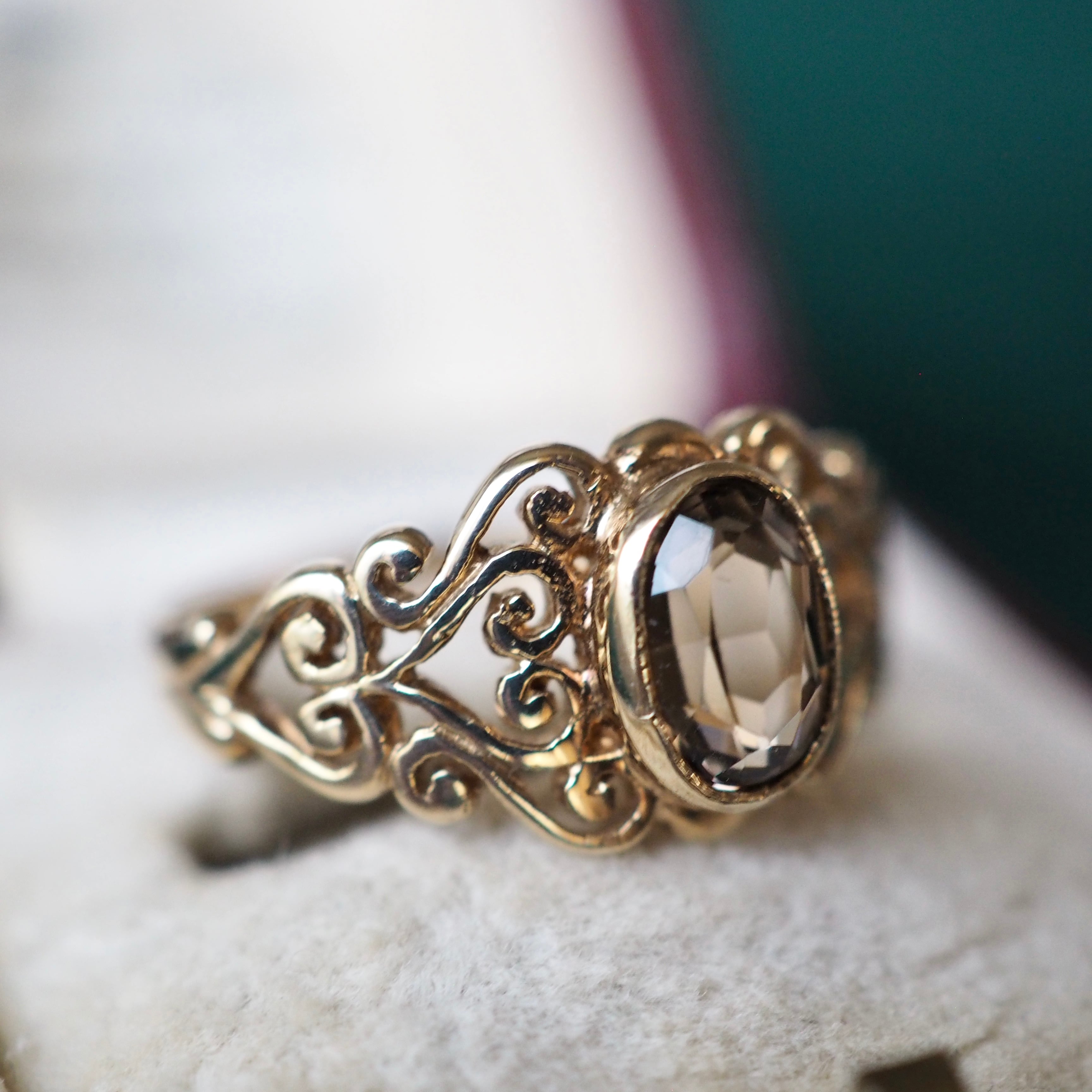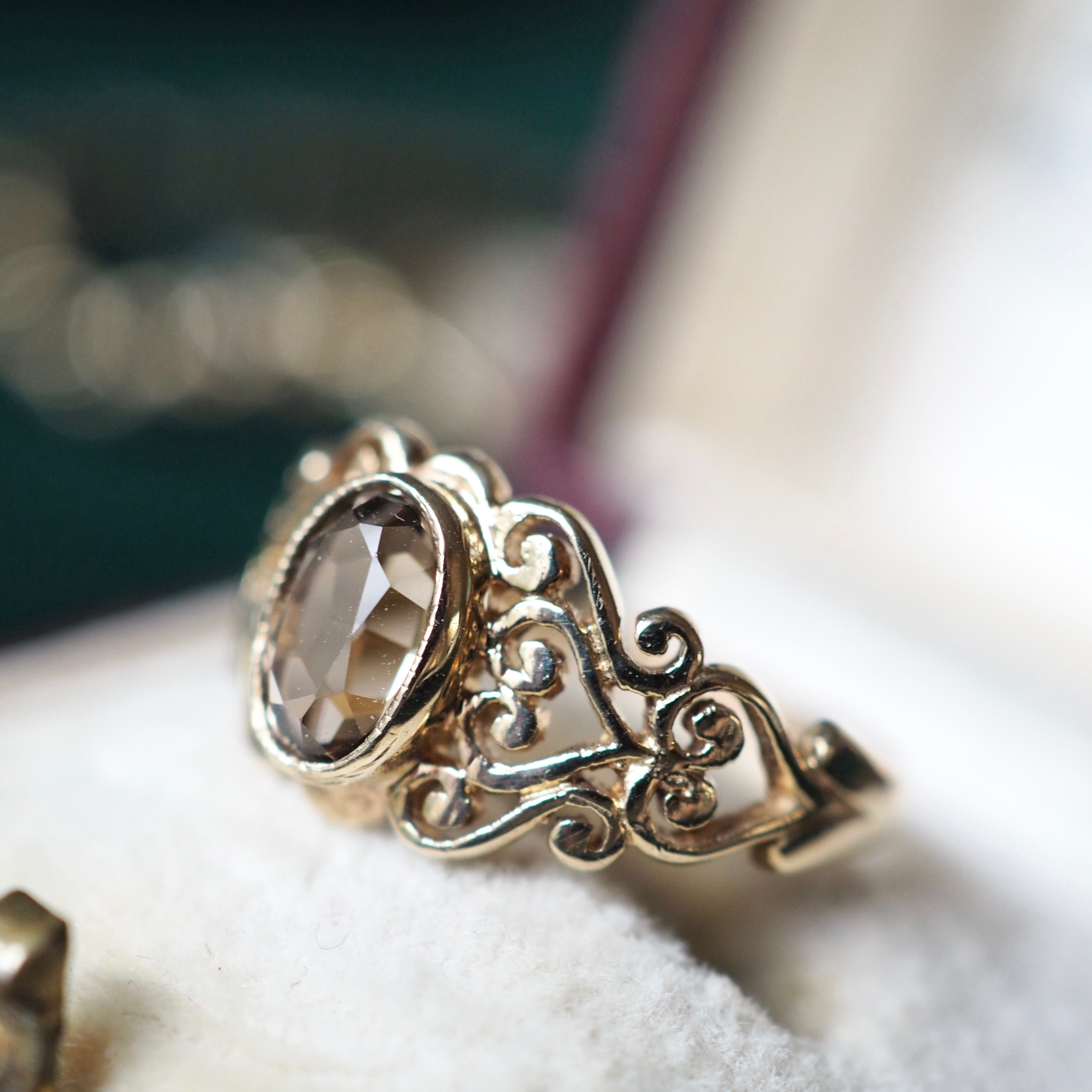 美しくカットされたオーバル型のスモーキークォーツがセットされたヴィンテージリングです。光を通す淡いシックなブラウンカラーになります。