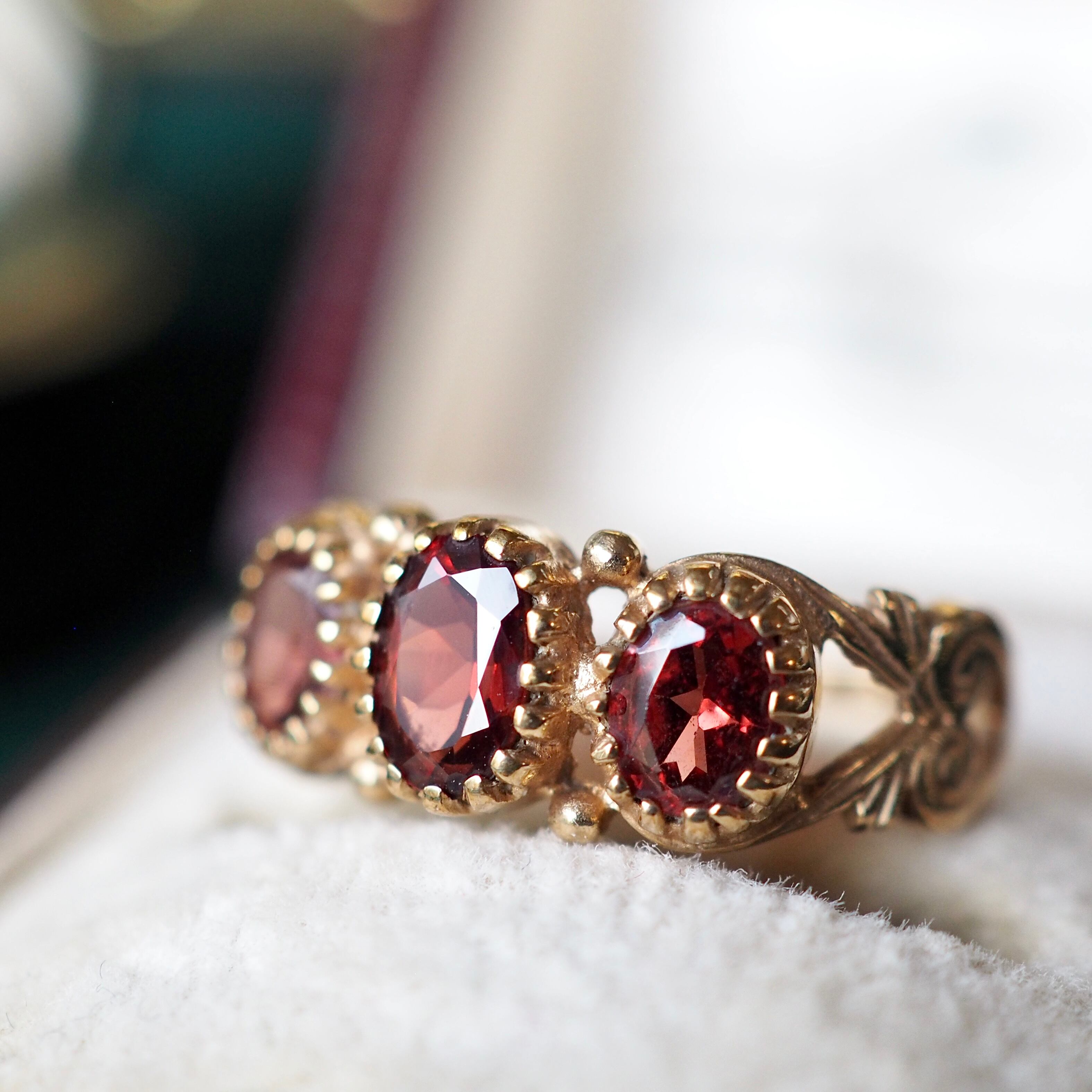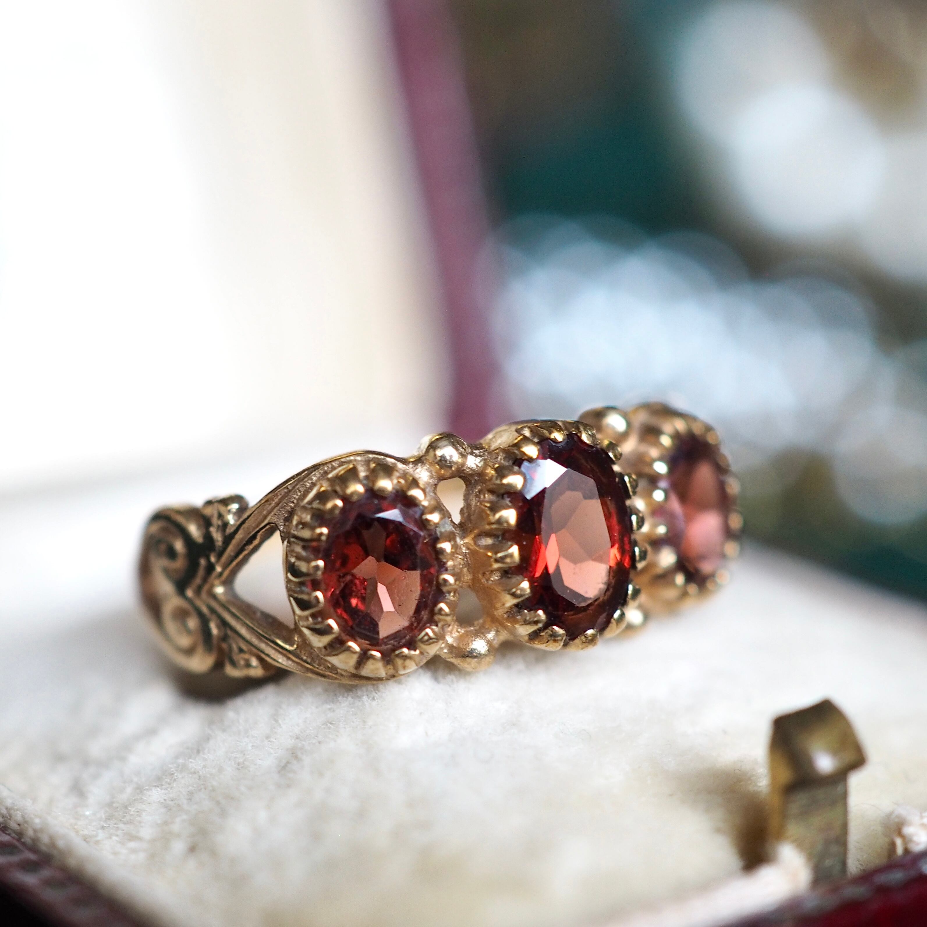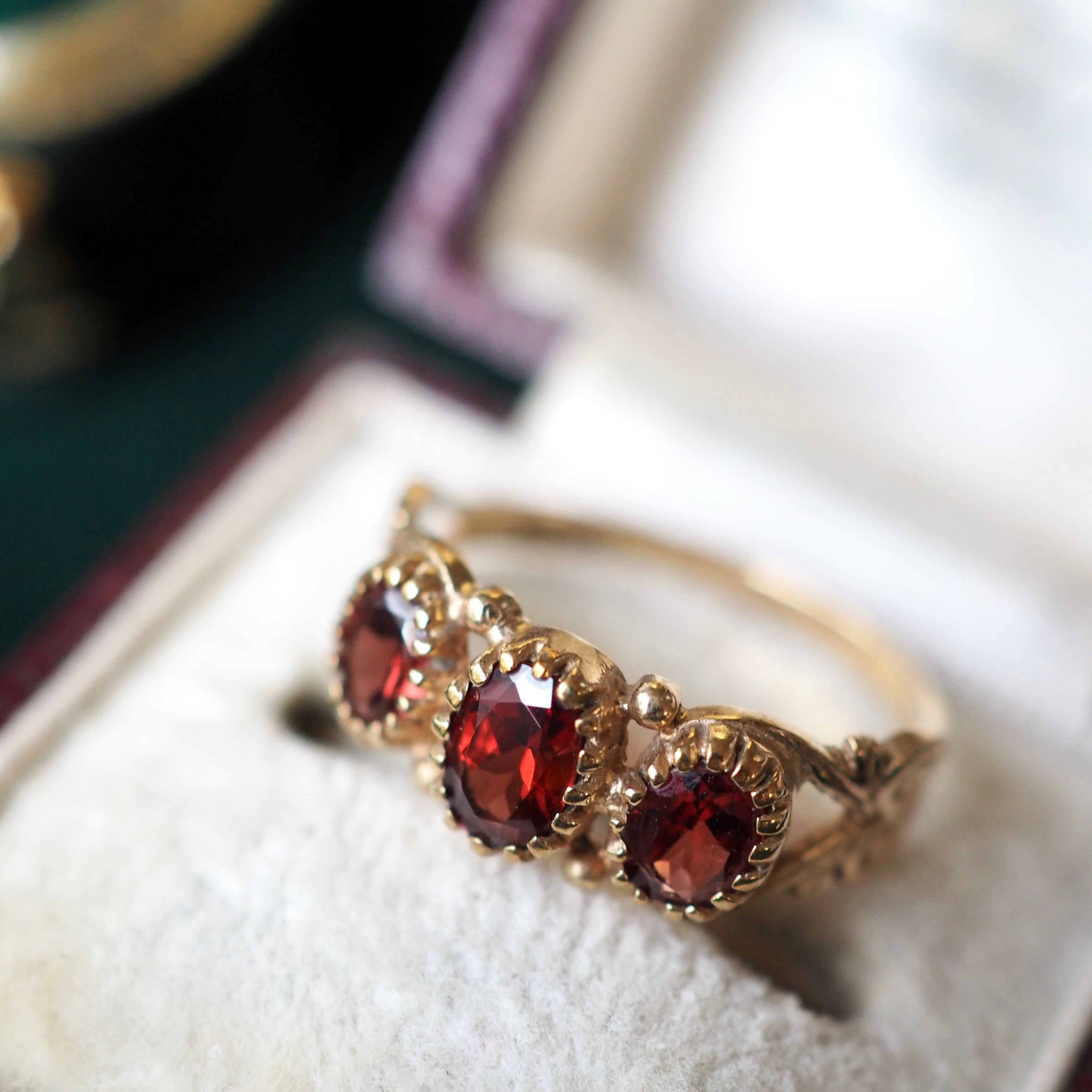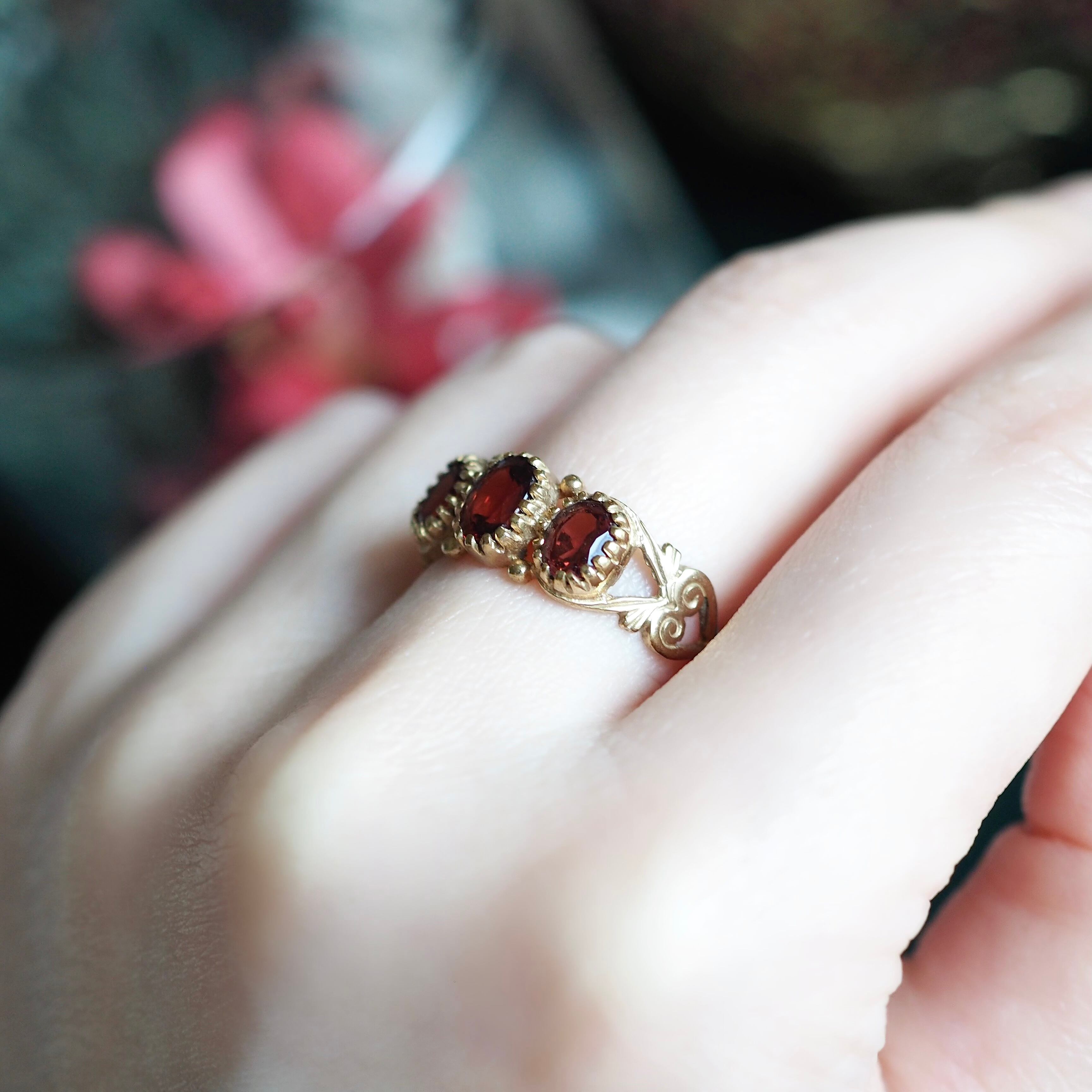 美しくカットされたオーバル型のガーネットが3石セッティングしてある一文字リング。