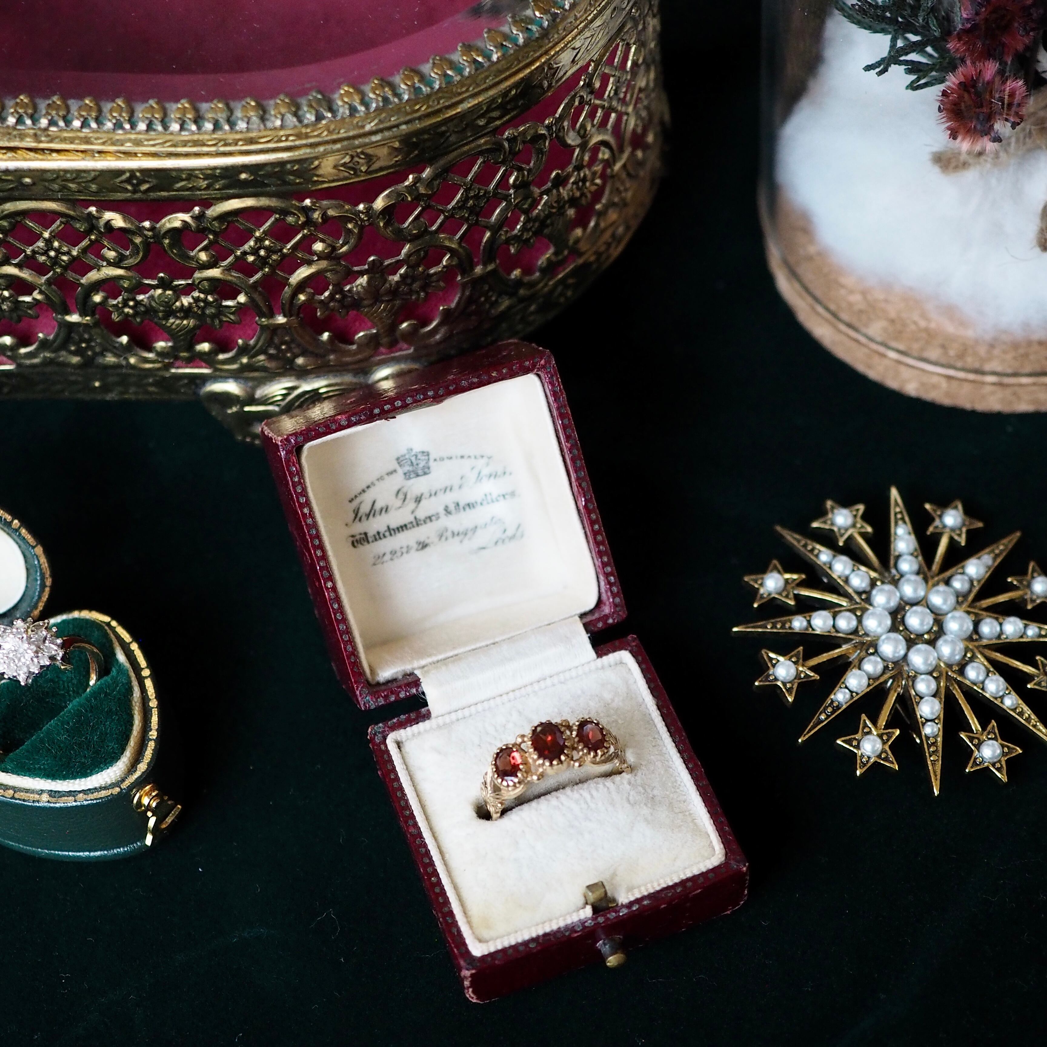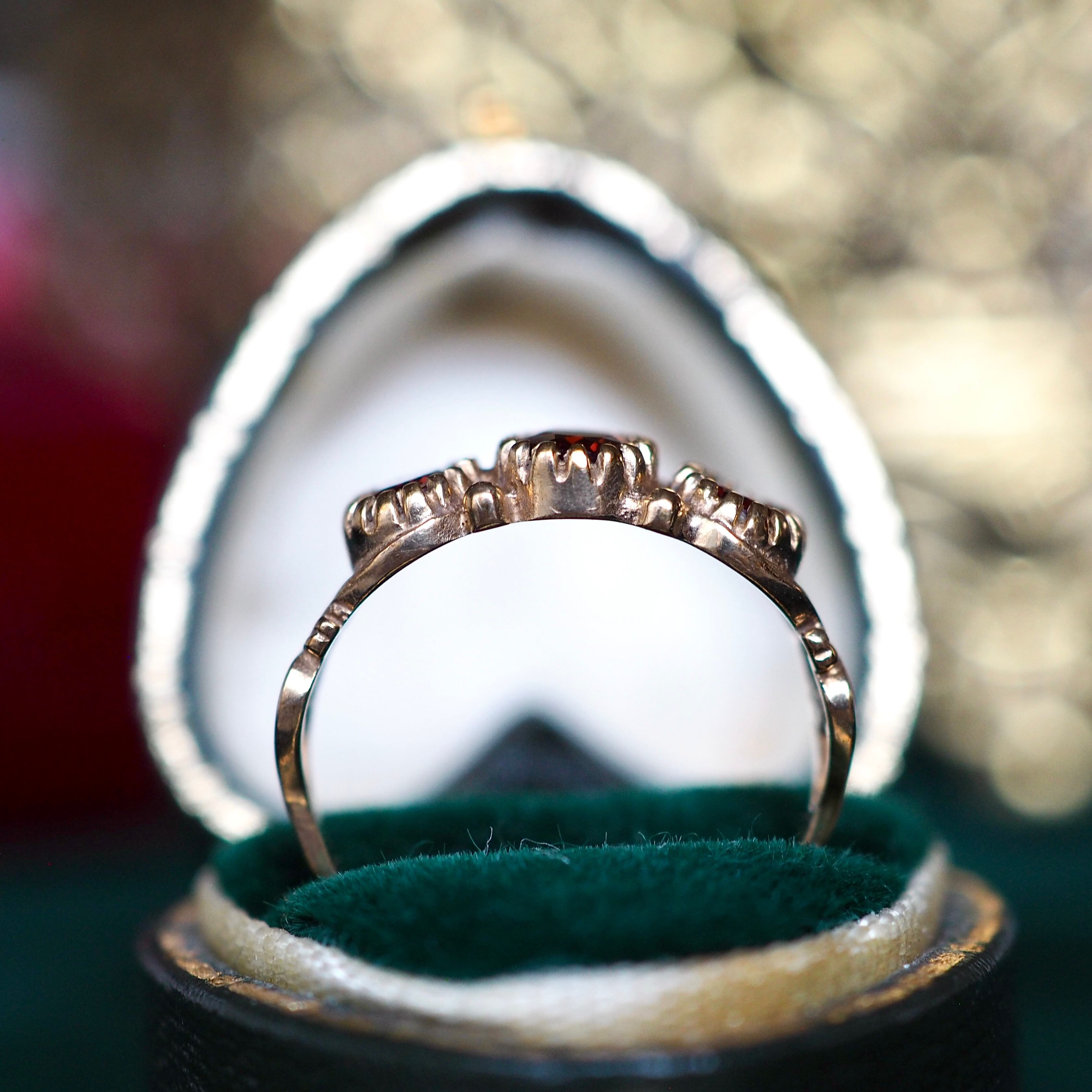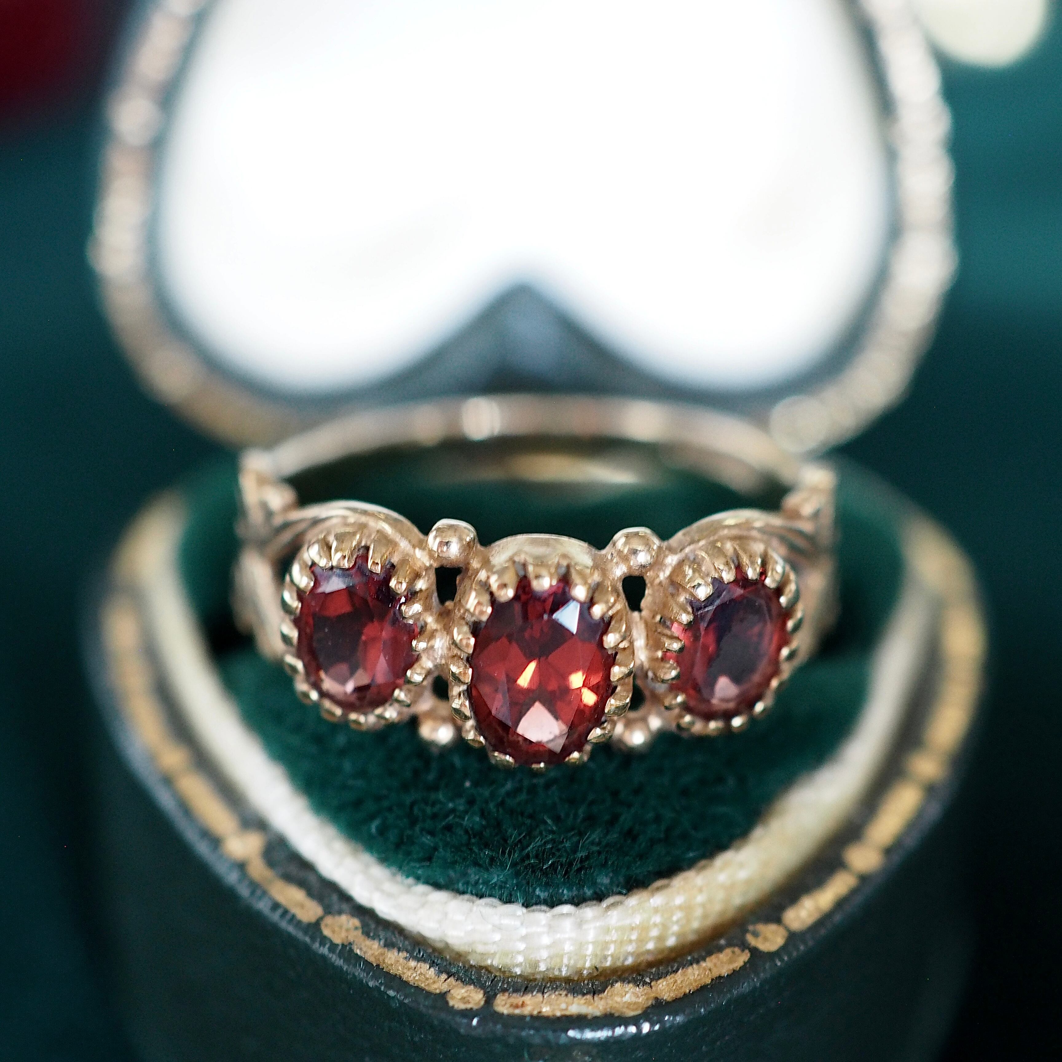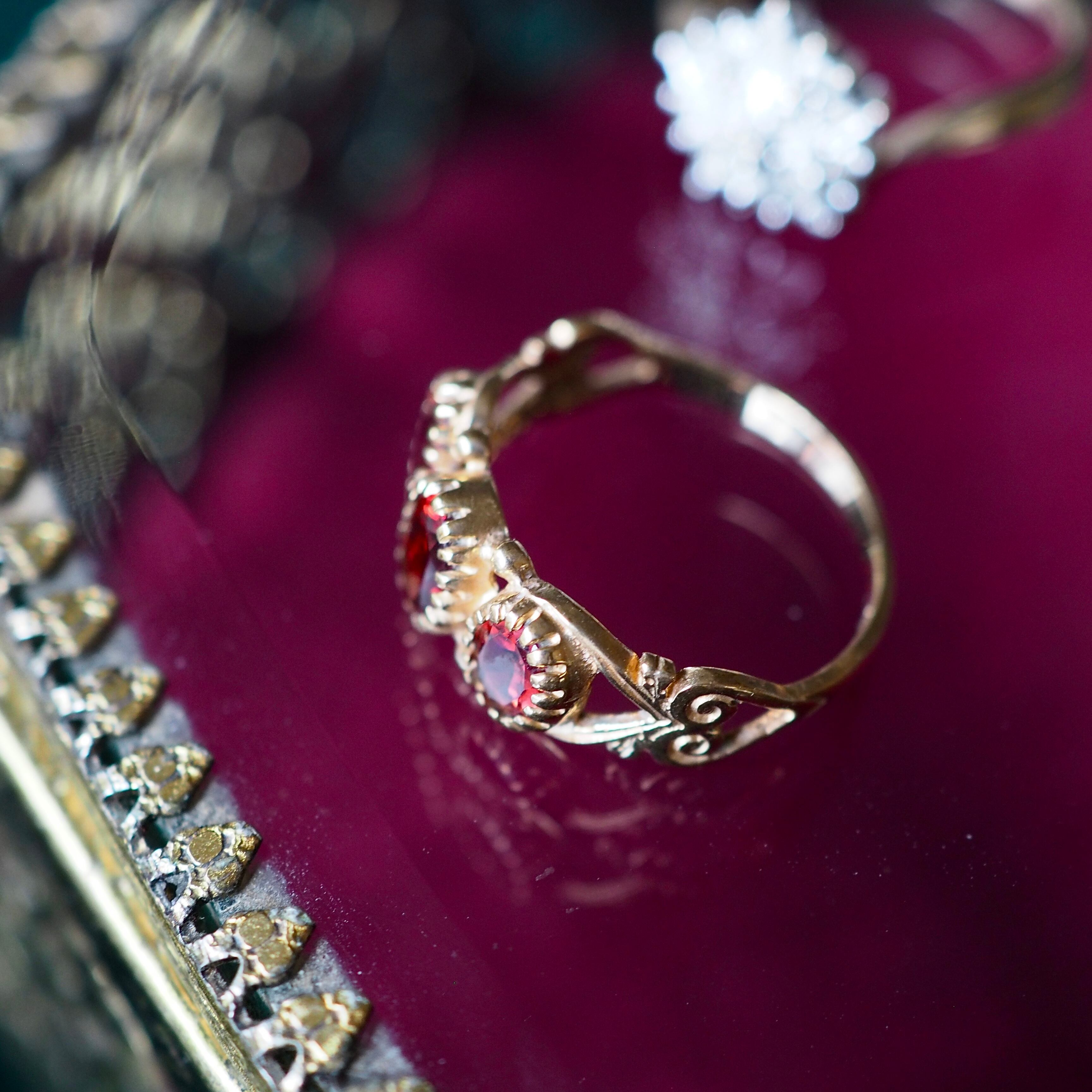 美しくカットされたオーバル型のガーネットが3石セッティングしてある一文字リング。