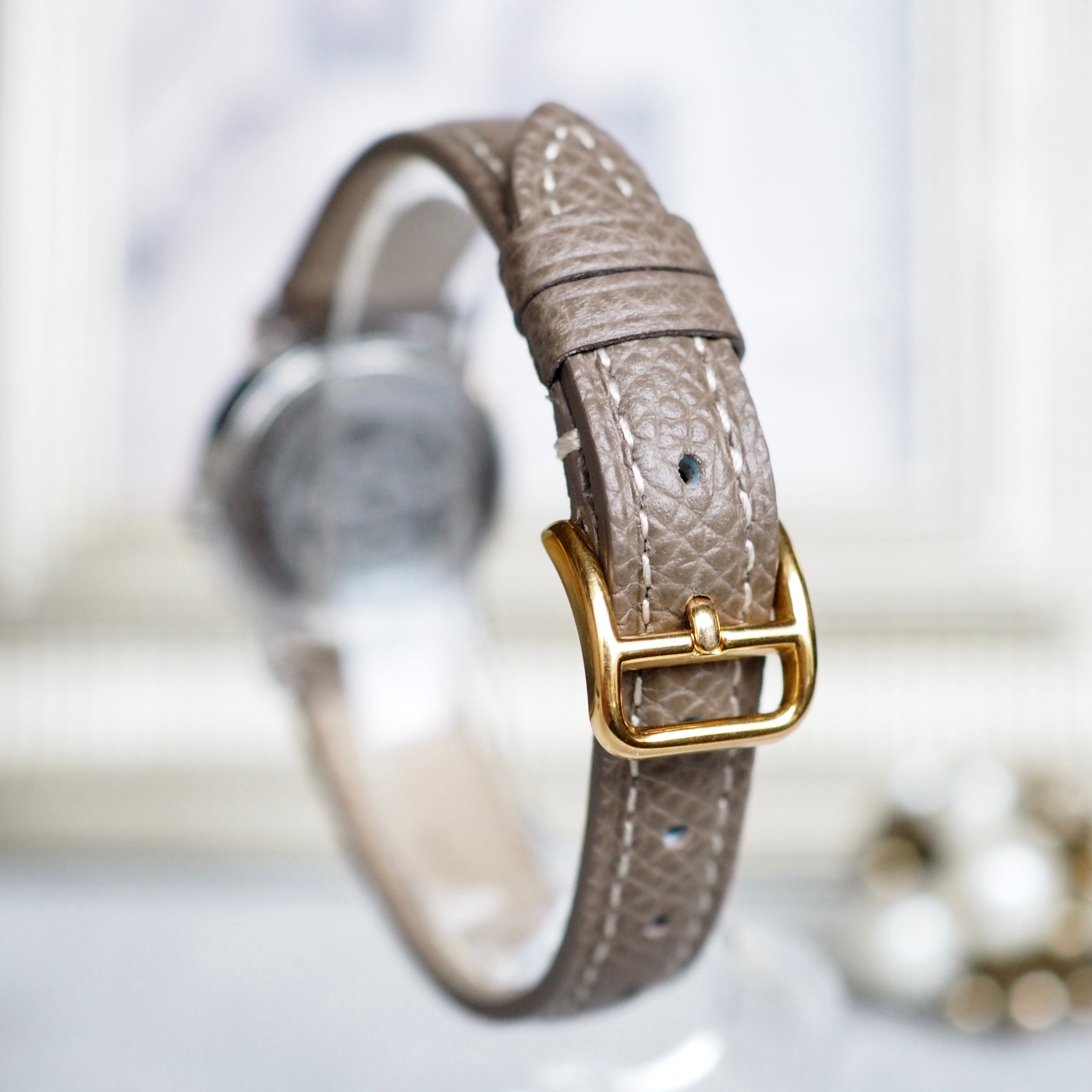 ベゼルにゴールドのステッチ模様を施したエルメスらしい上品で高級感漂う洗練されたデザインです。
