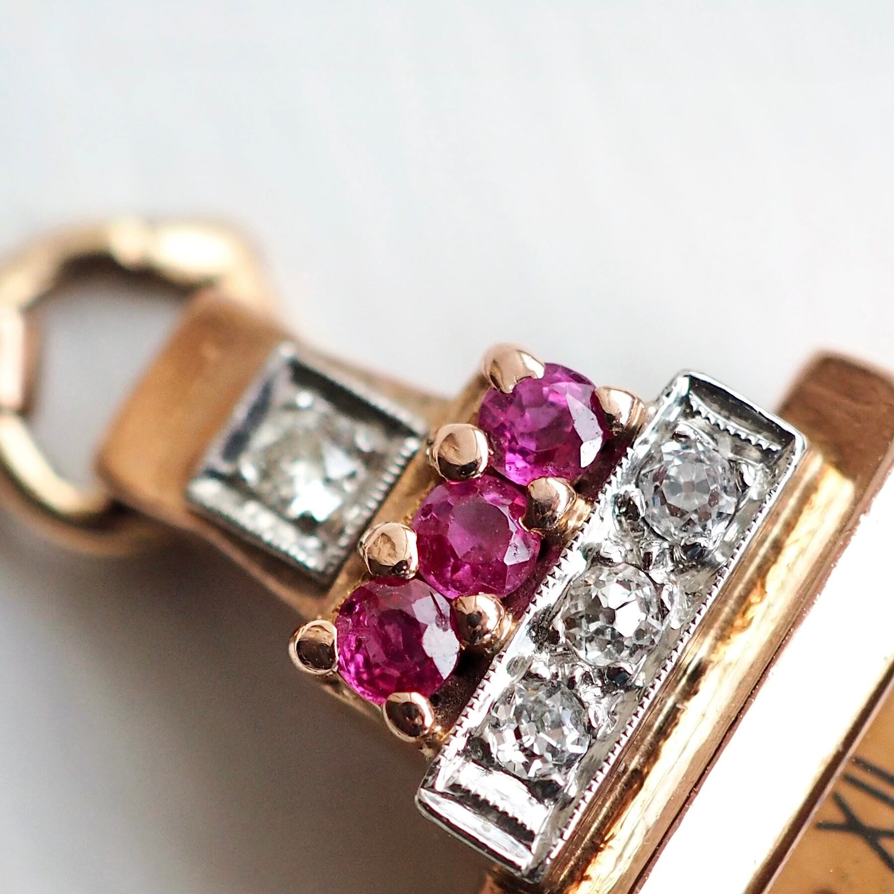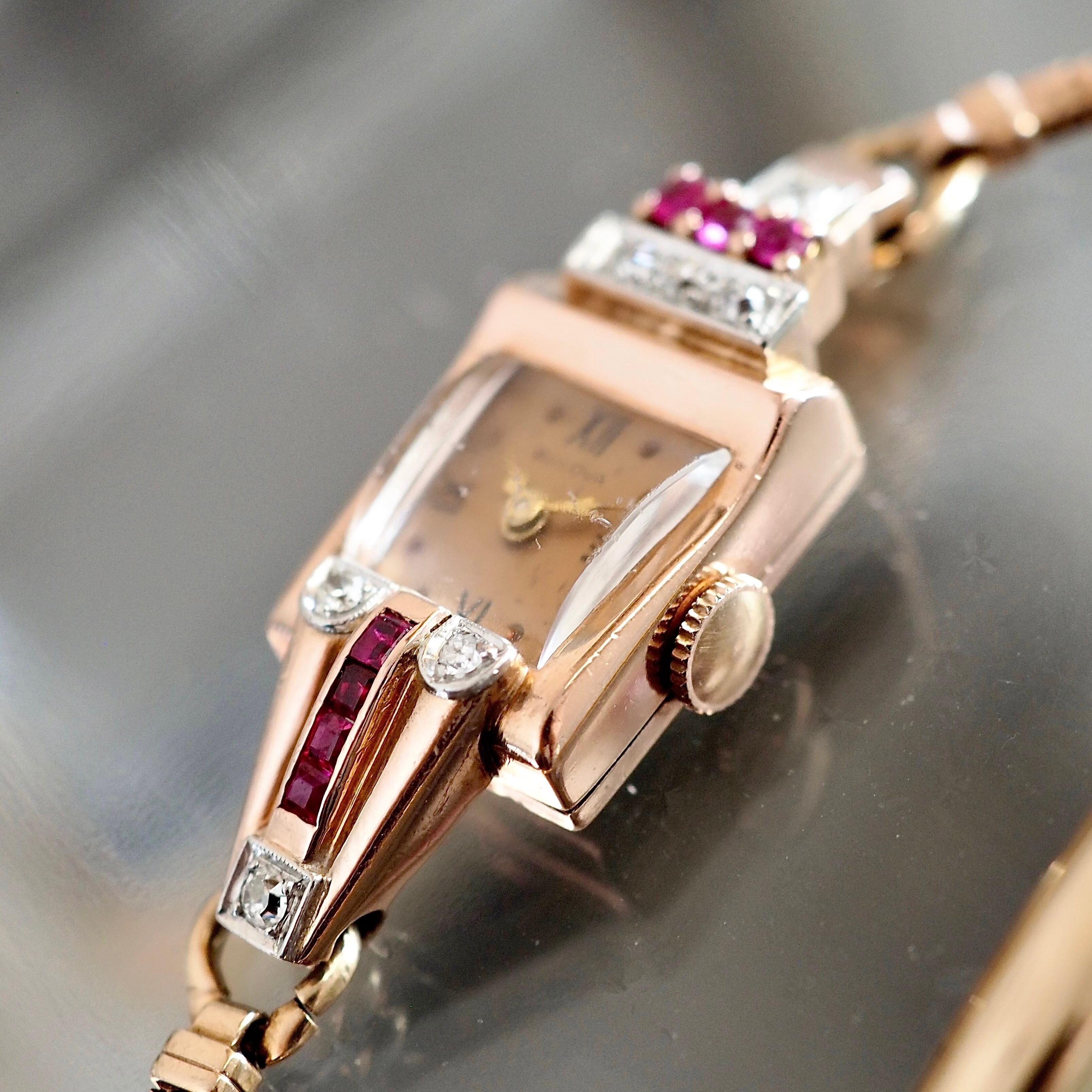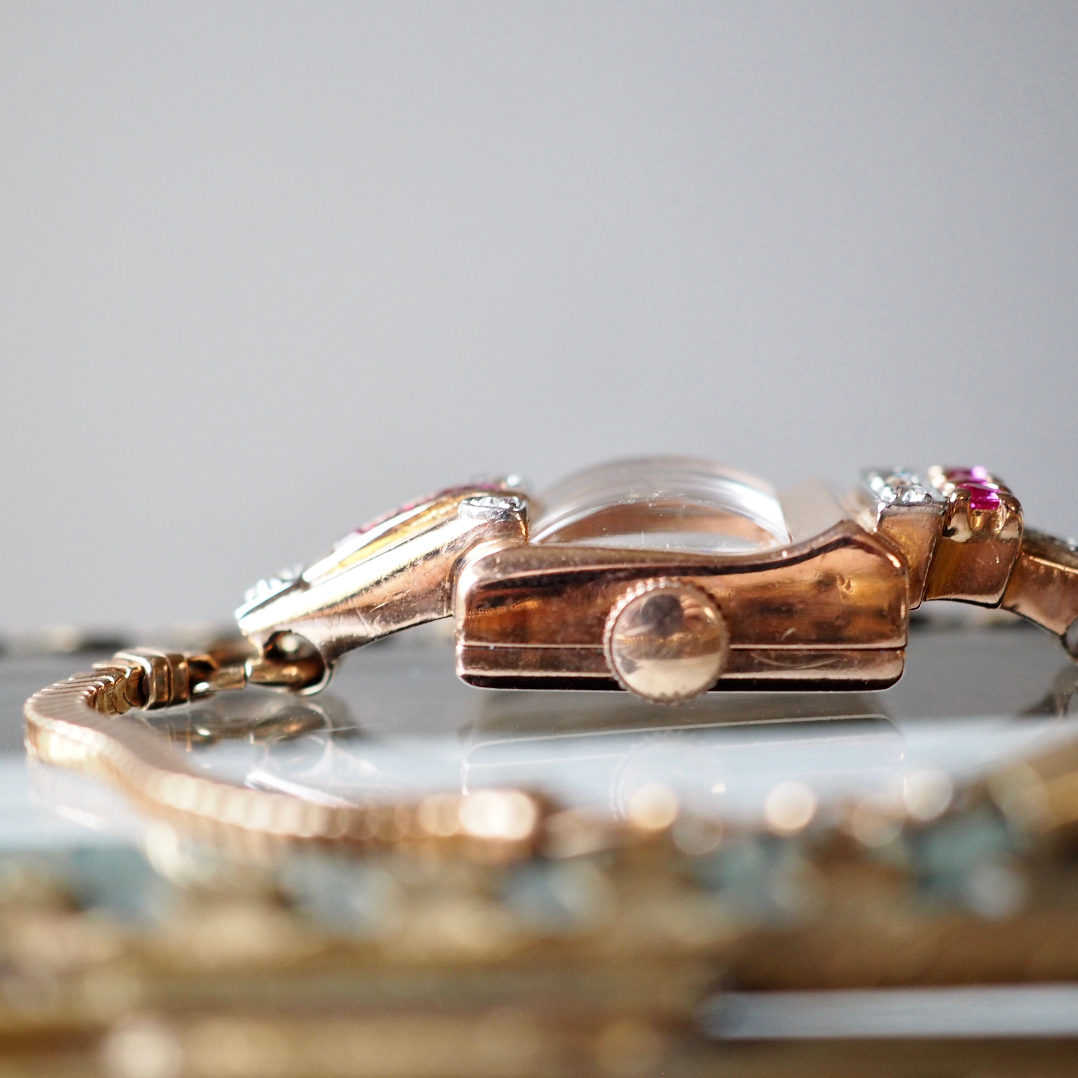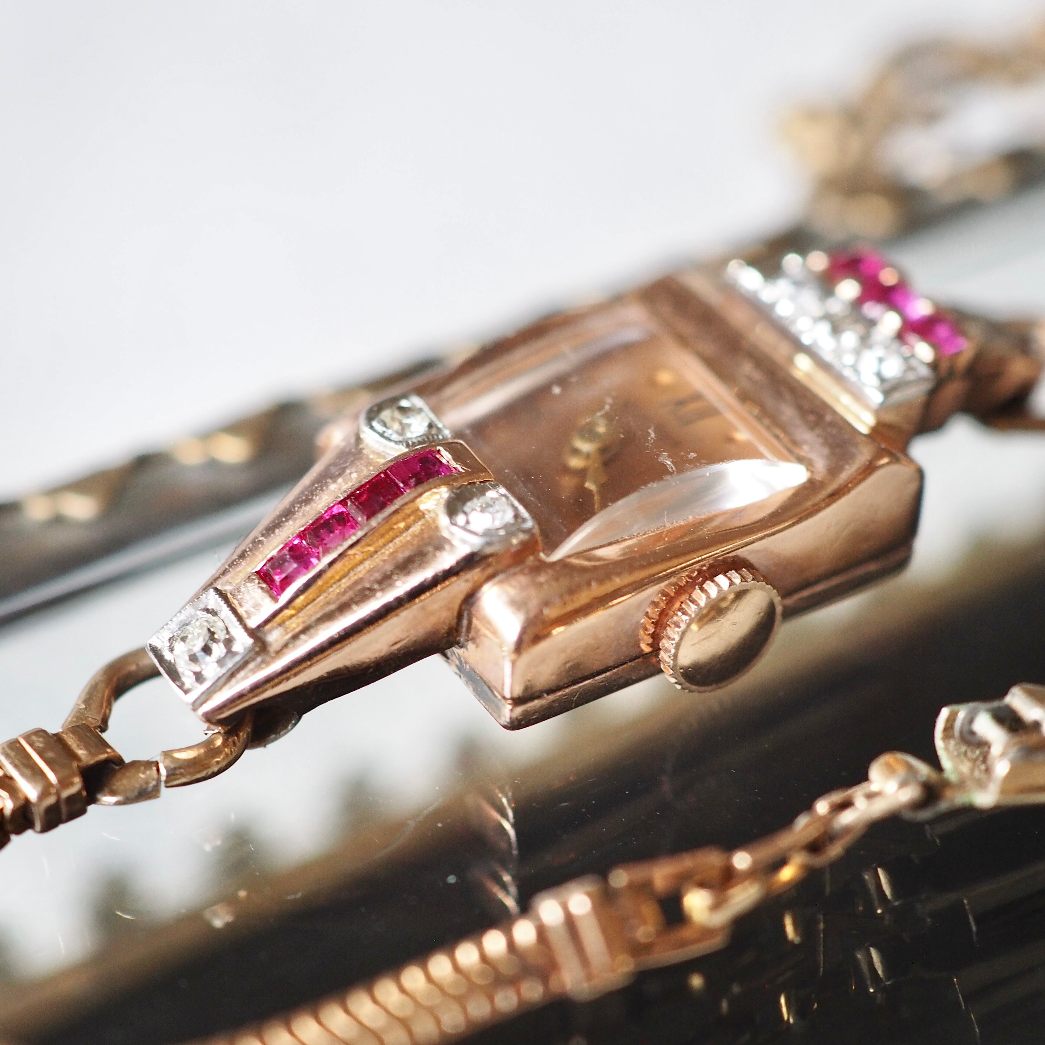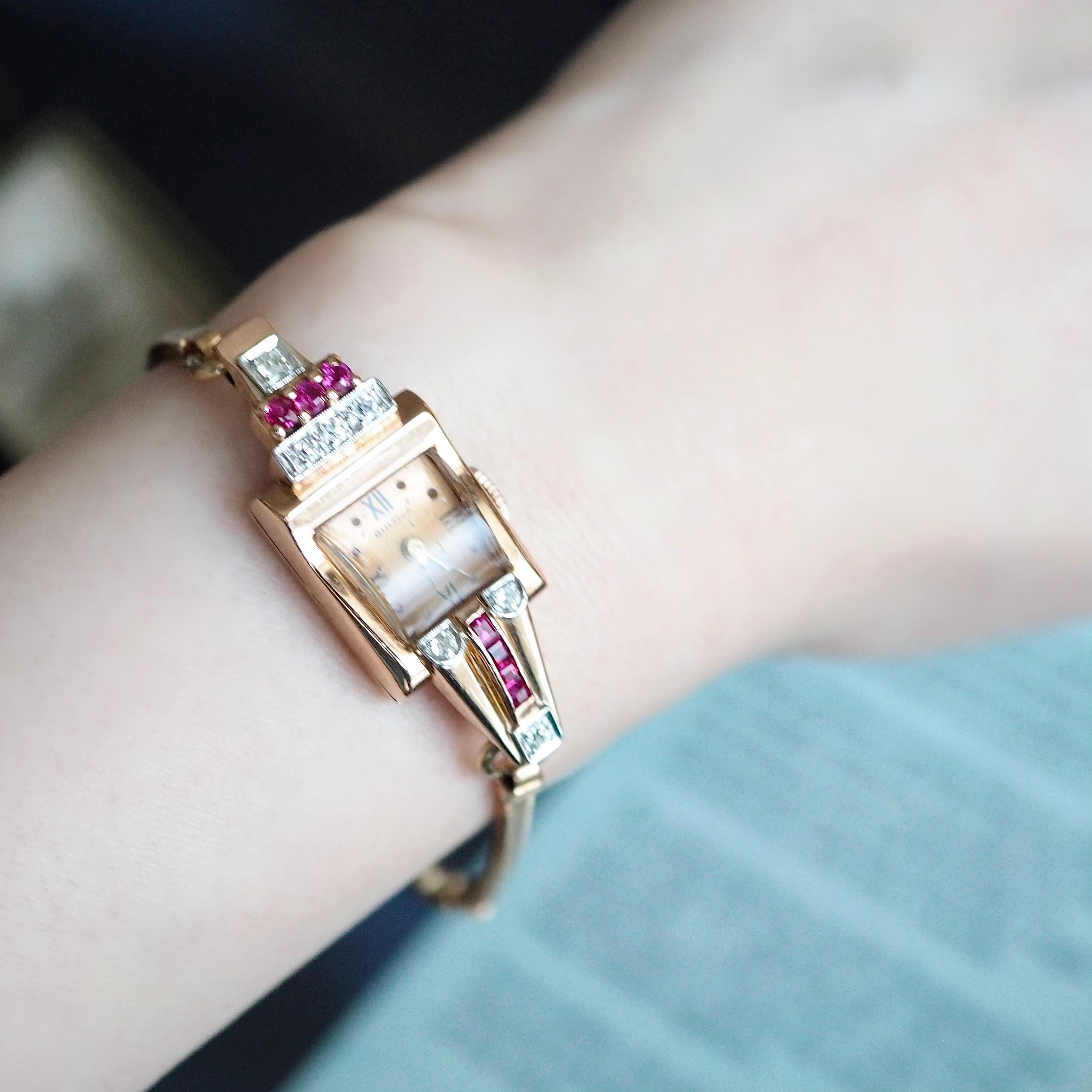 なかなか手に入らない14金ローズゴールドケースと上下のルビー&ダイヤモンドを組み合わせた40年代ならではのデザインです。