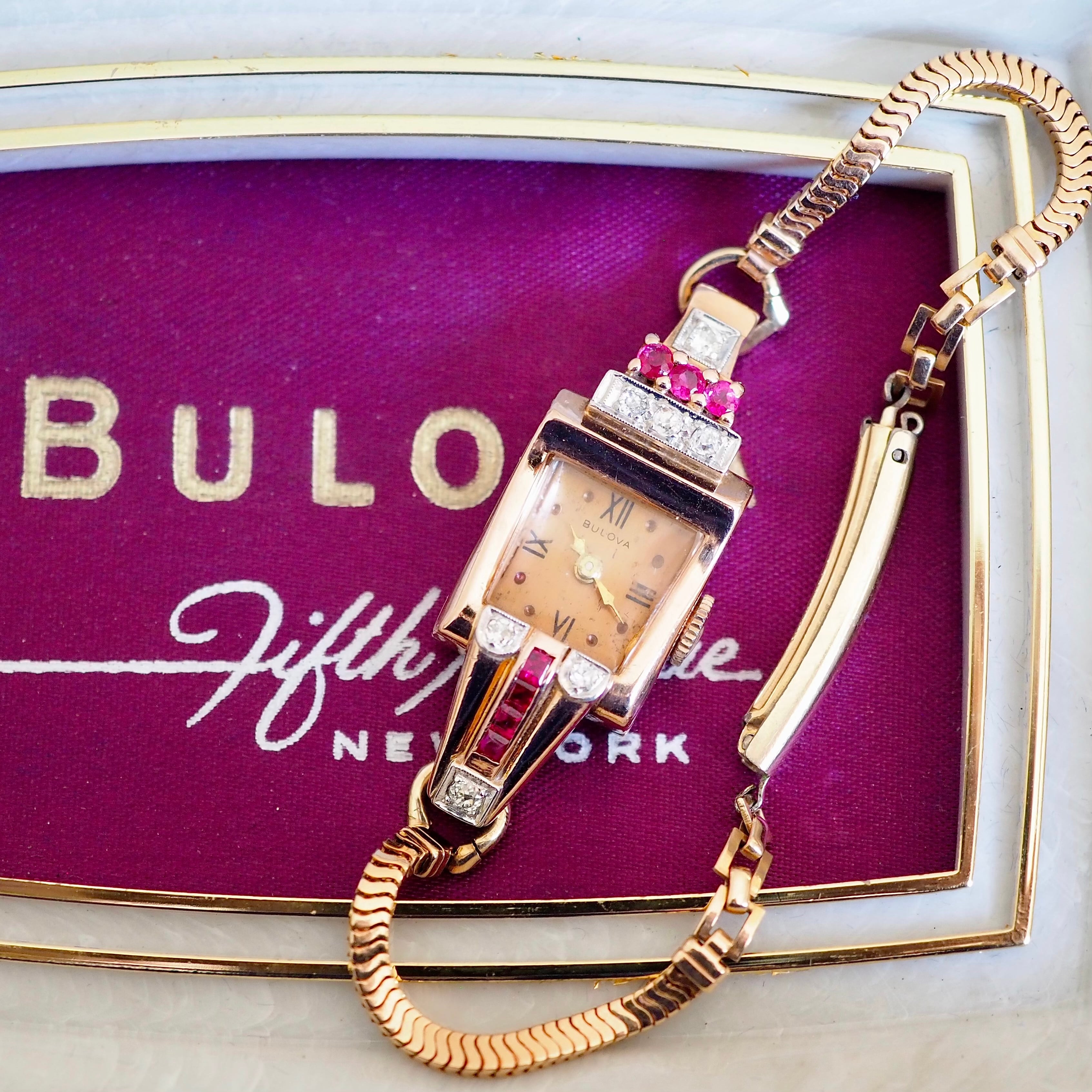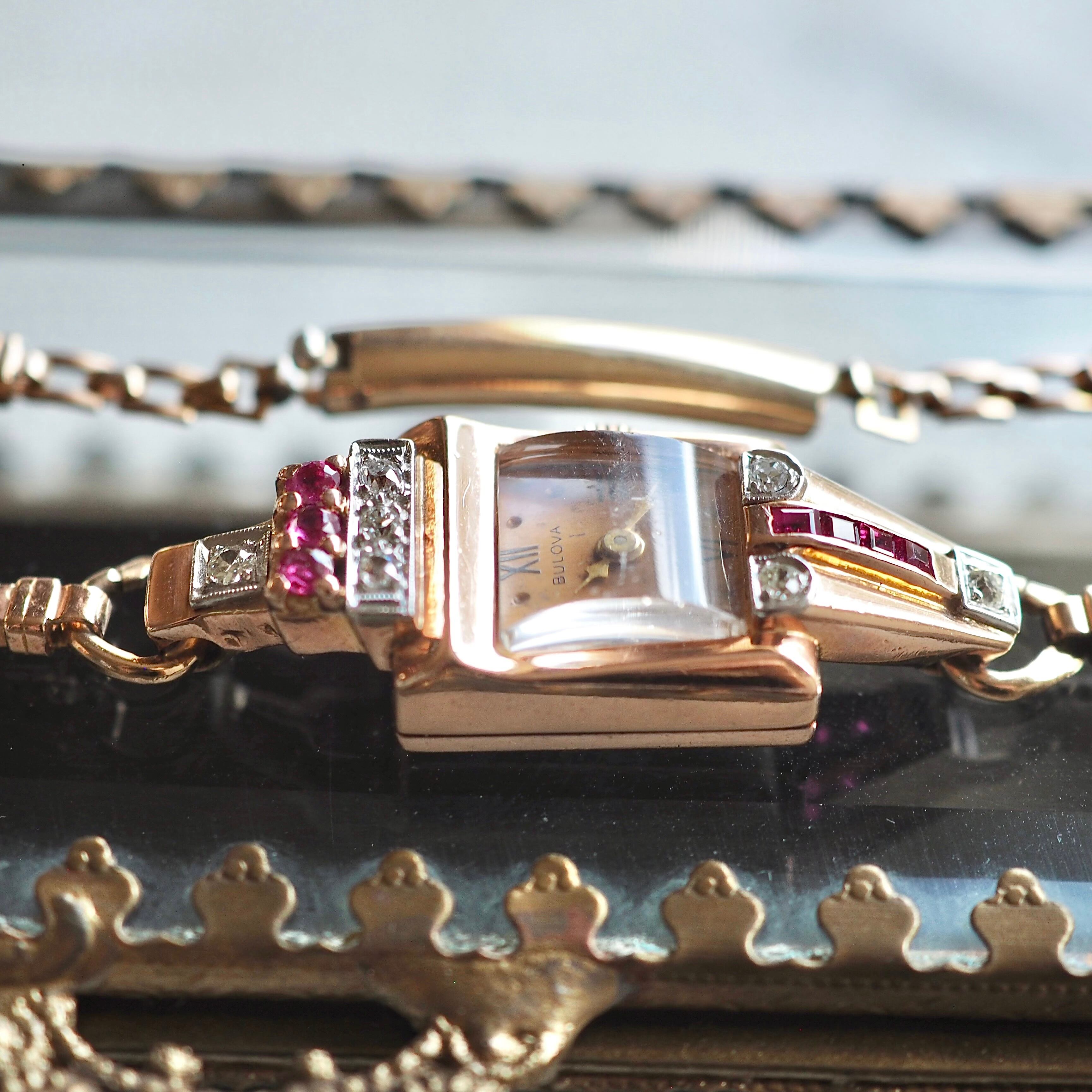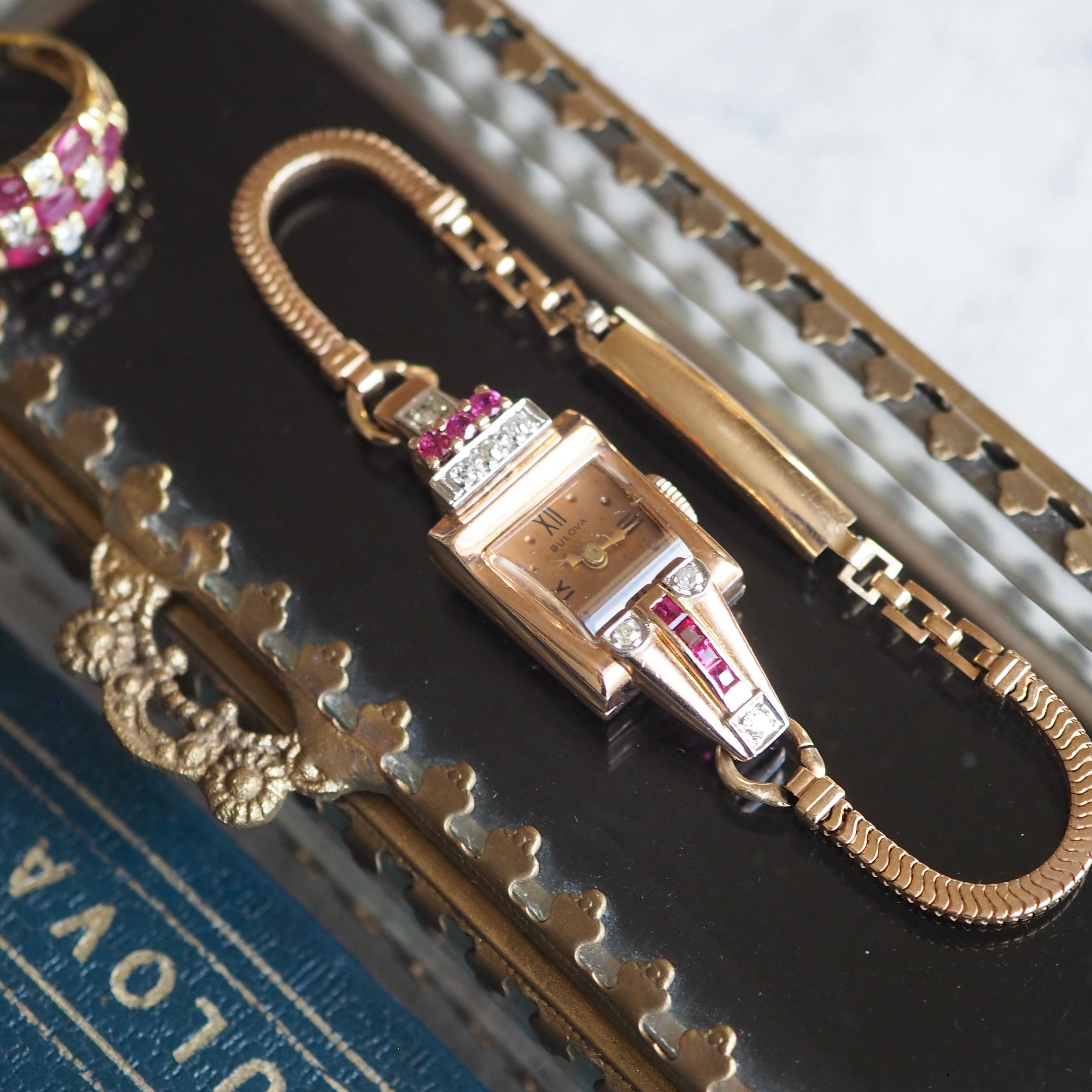 1940年代製のBULOVAのアール・デコデザインの華やかなジュエリーウォッチ。