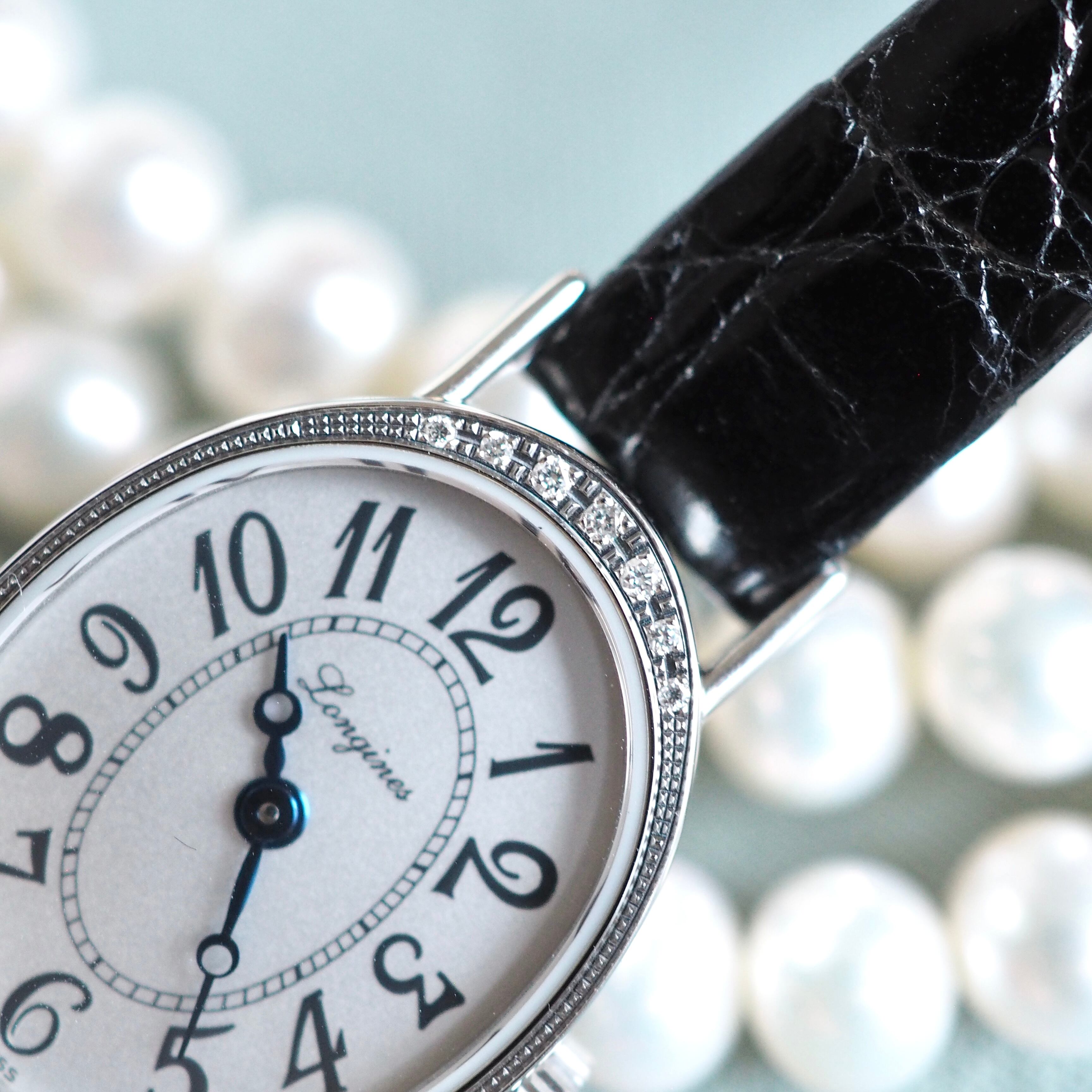 細身のオーバルデザインのケースのベゼルに16Pのダイヤモンドが装飾されております。