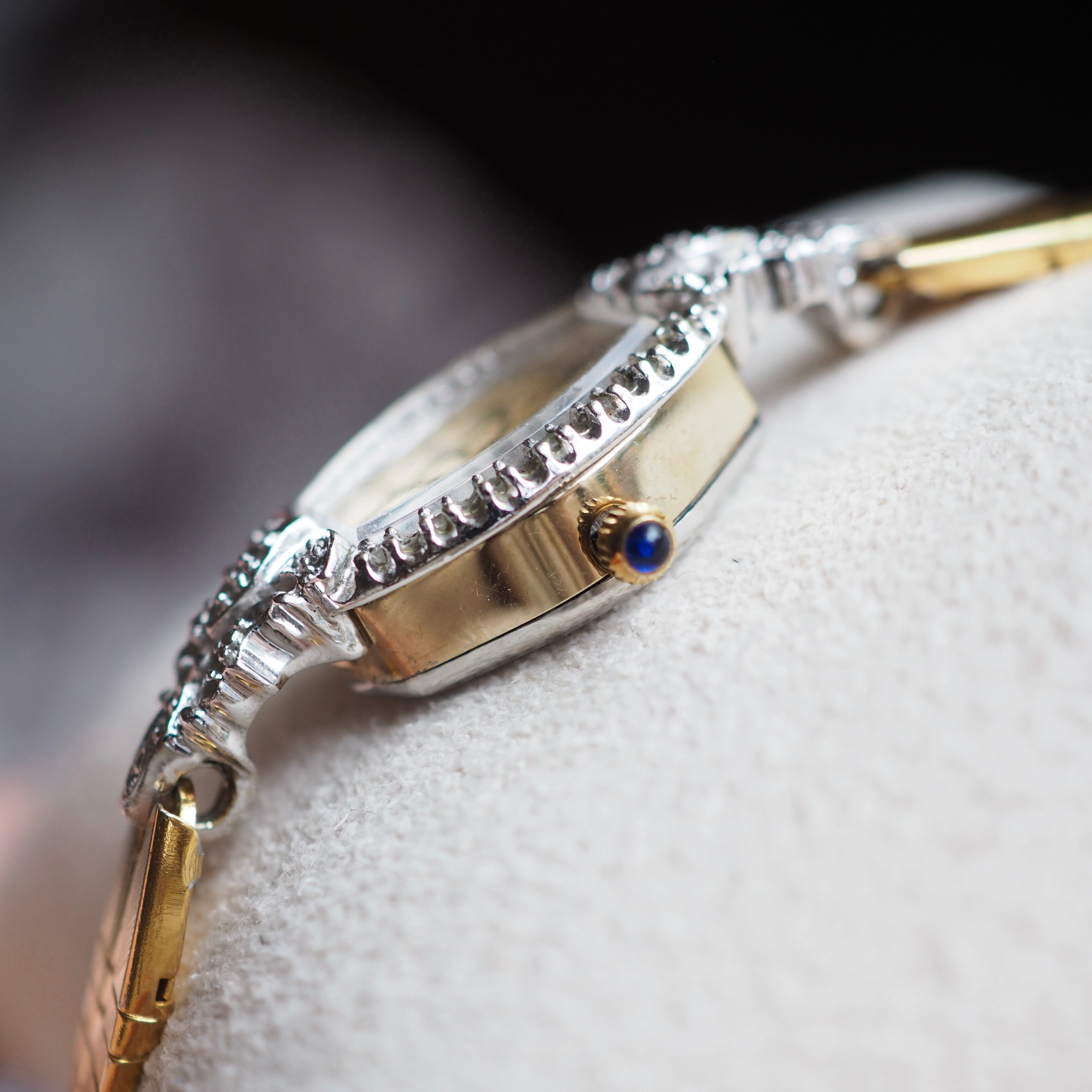 ヴィンテージ ・ルシアンピカールのドレスウォッチです。トノー型ケースのベゼルと上下のラグ・ベゼルにはダイヤモンドがセッティングしてあります。