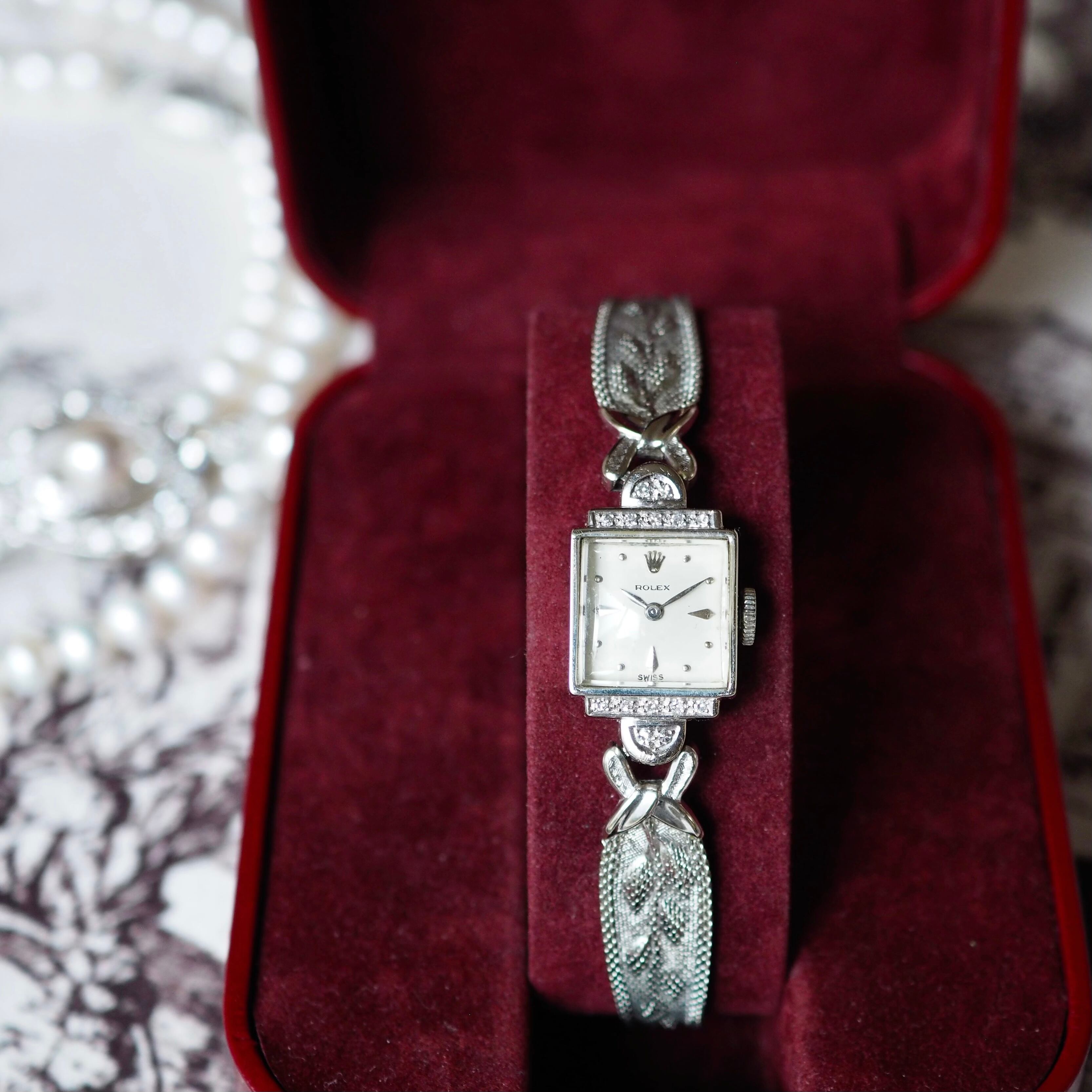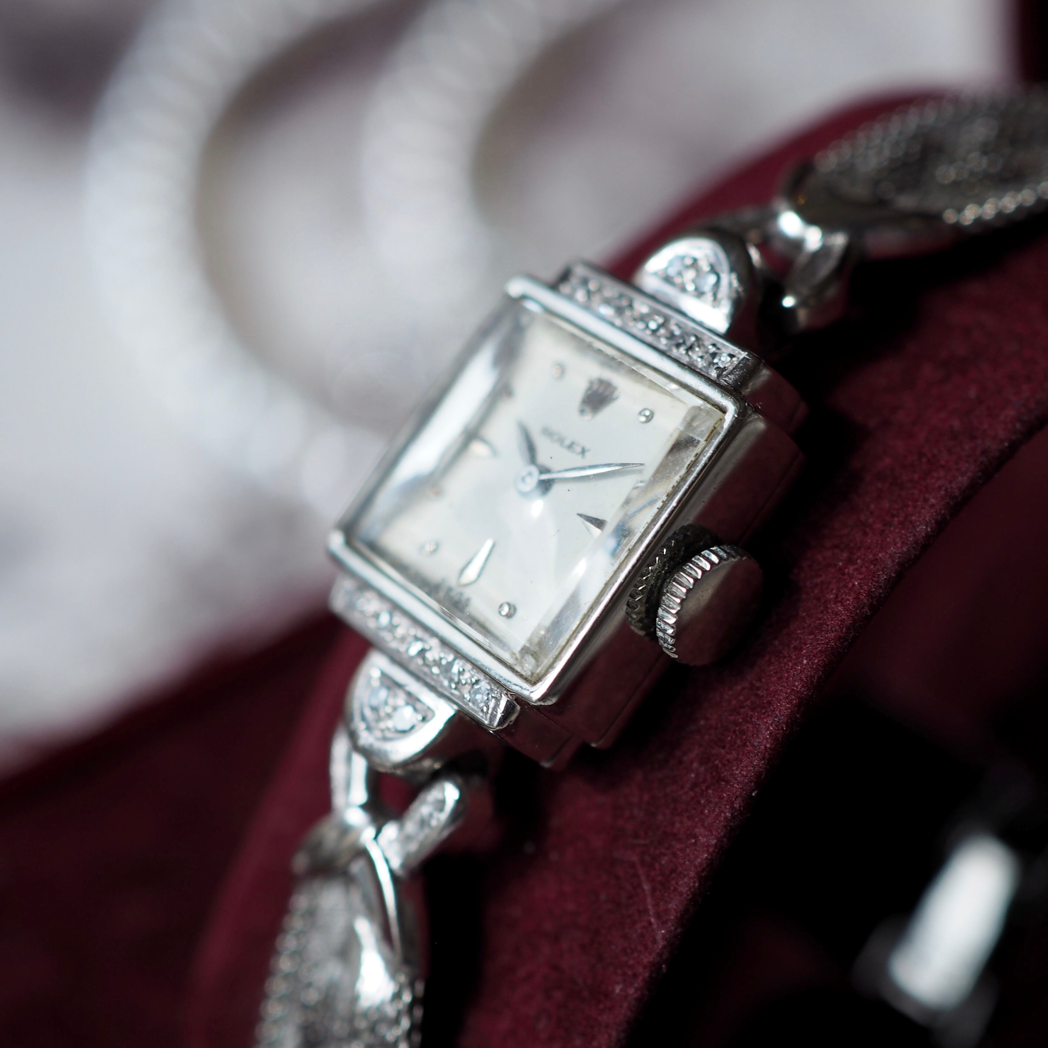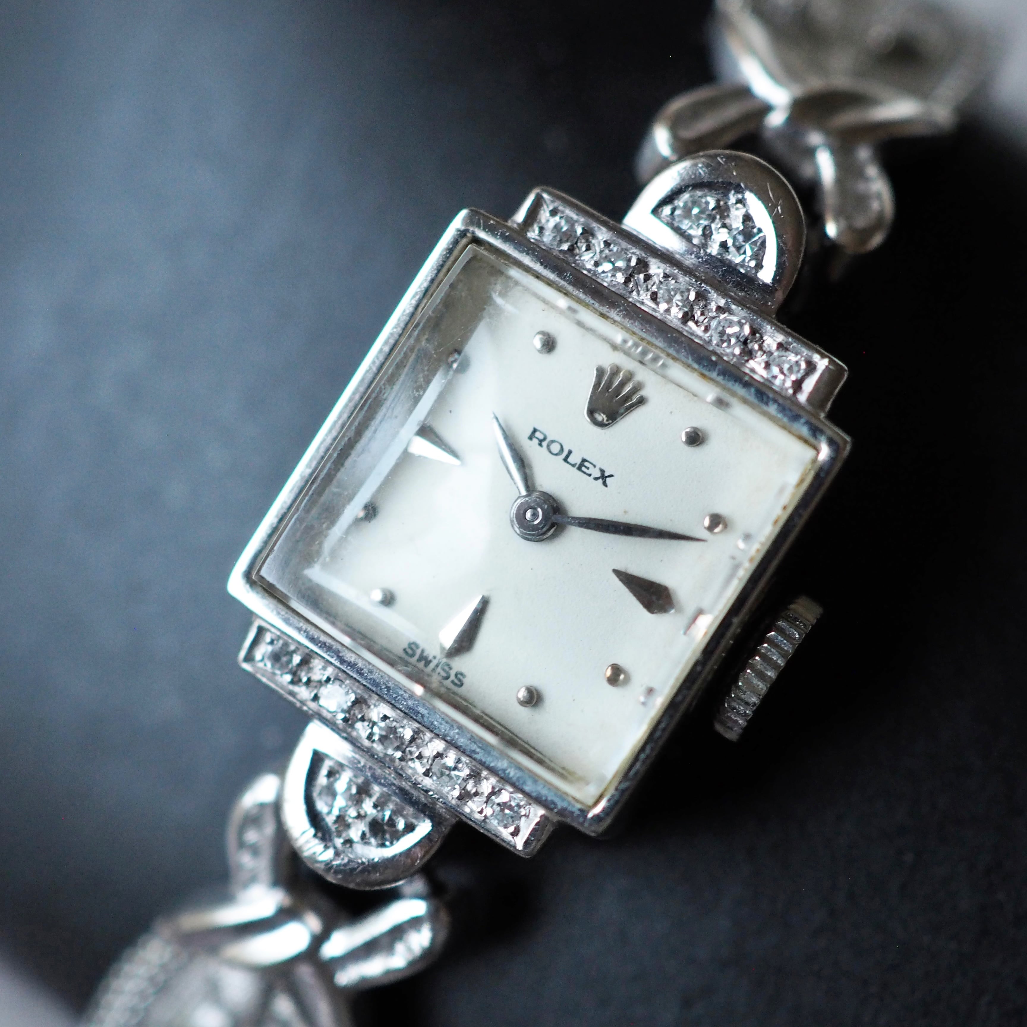 天然ダイヤモンドがケース上下・ラグにセッティングされたアンティーク・ロレックスのジュエリーウォッチです。