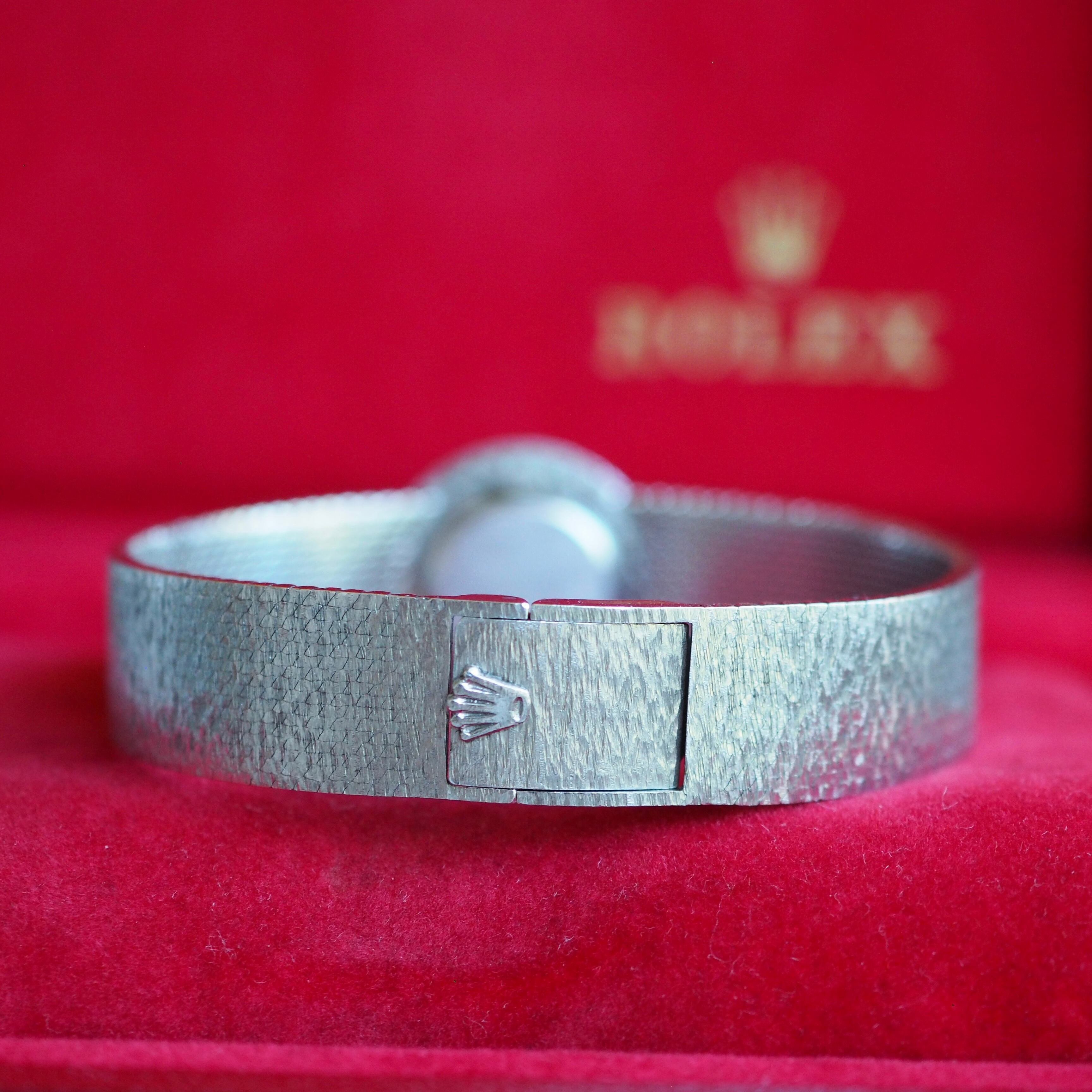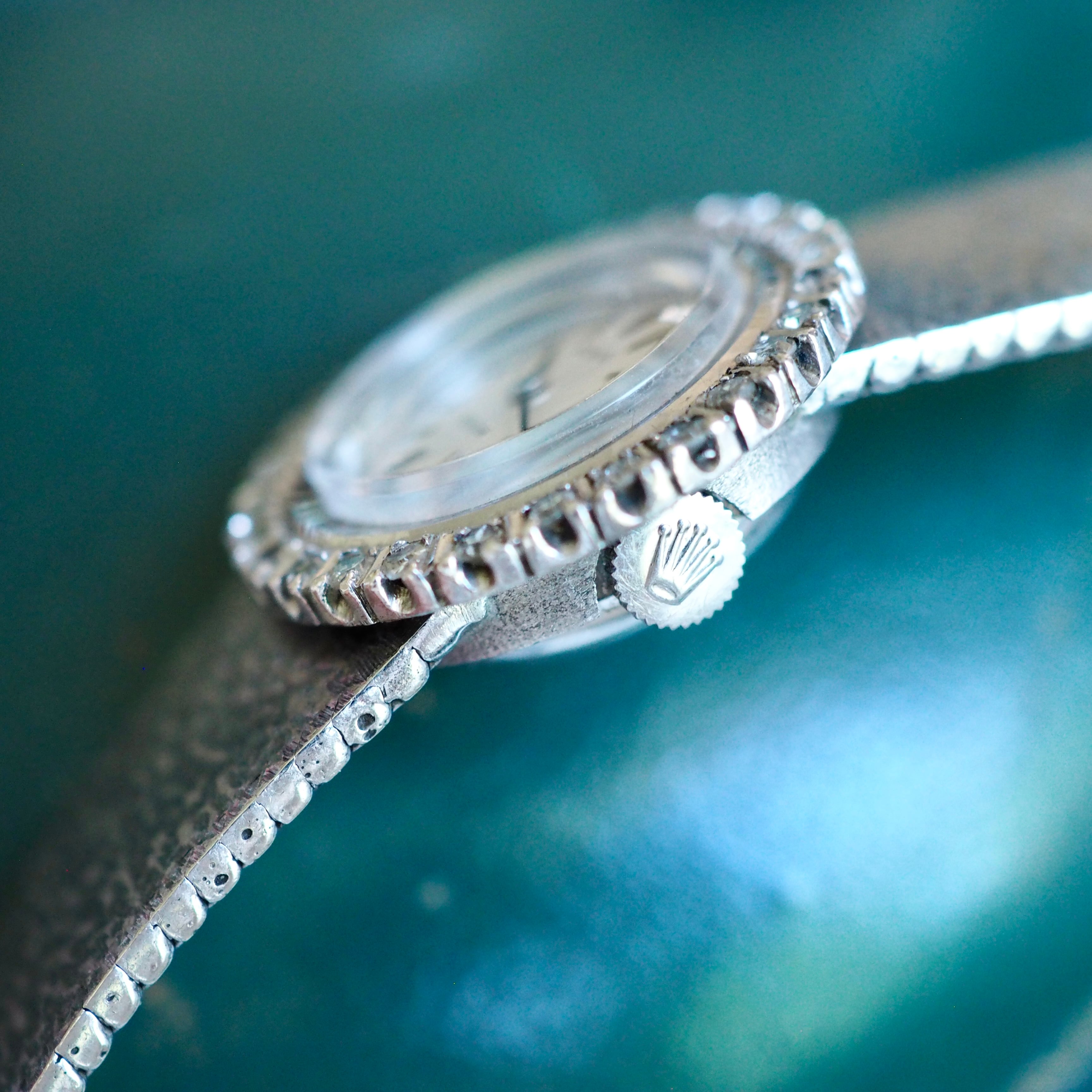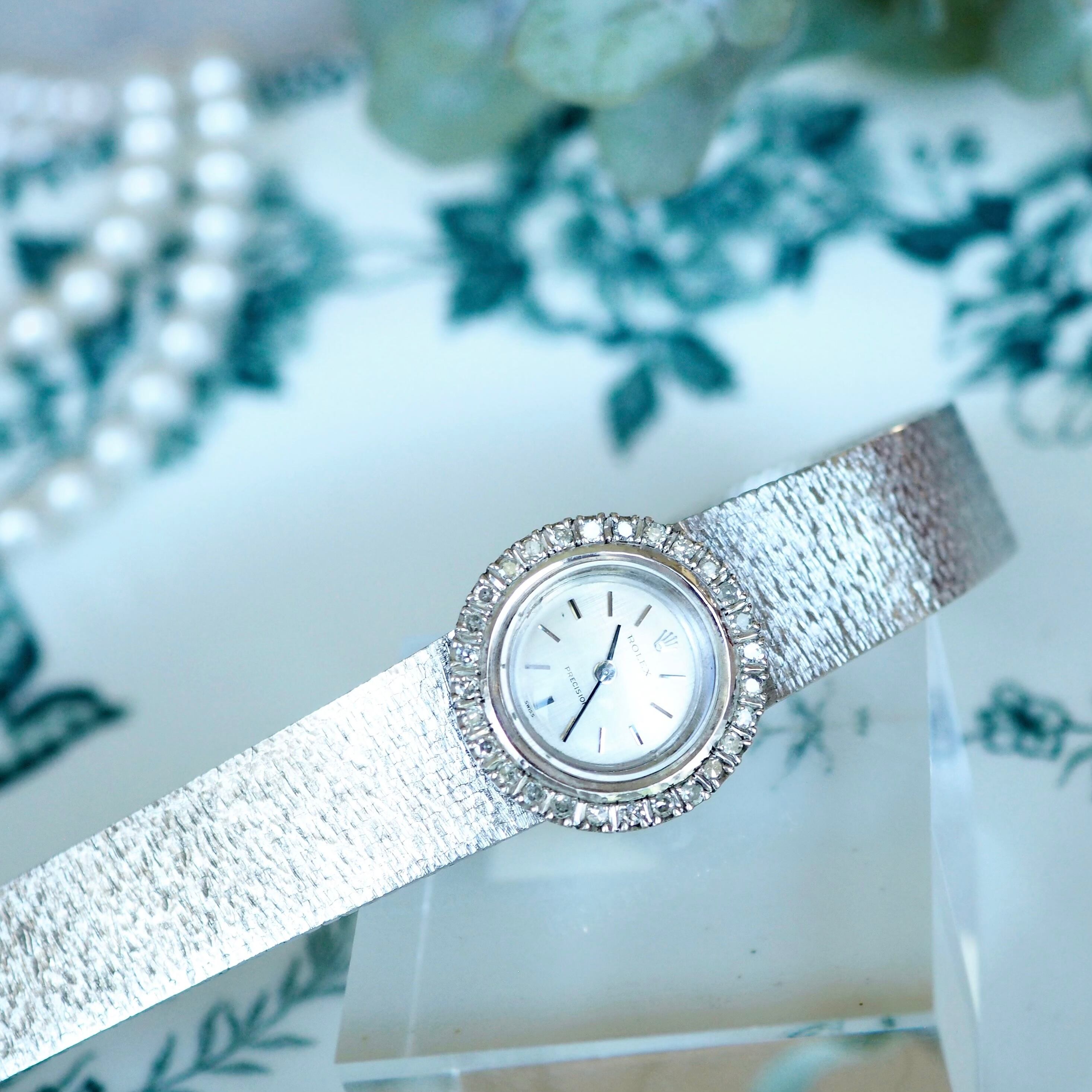 ラウンド型ケースをぐるりと囲んだ上質なダイヤモンドが贅沢でエレガントなアンティークロレックス。 K18ホワイトゴールドの美しい輝きとダイヤモンドの輝きが融合したデザインは、洗練された品格を演出します。