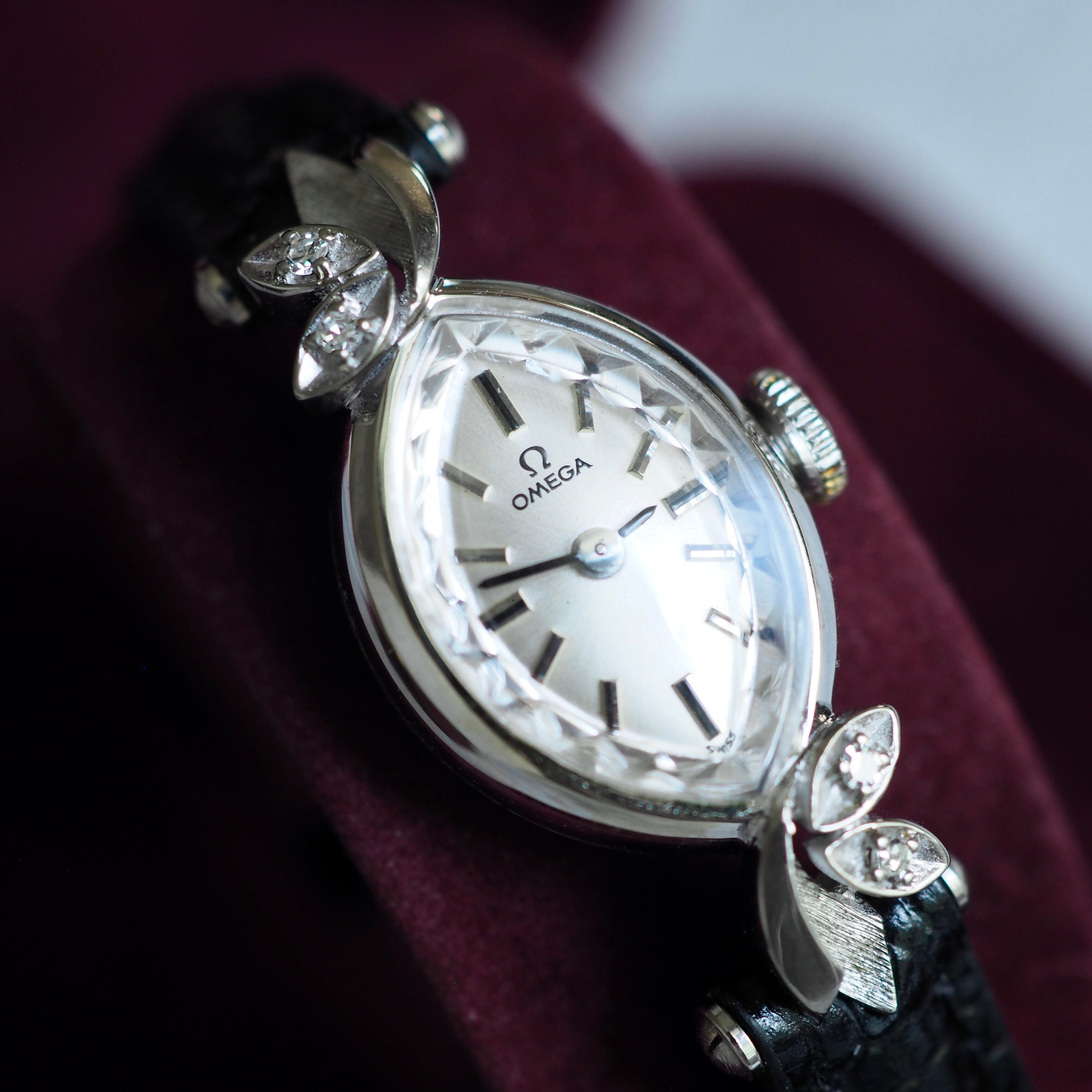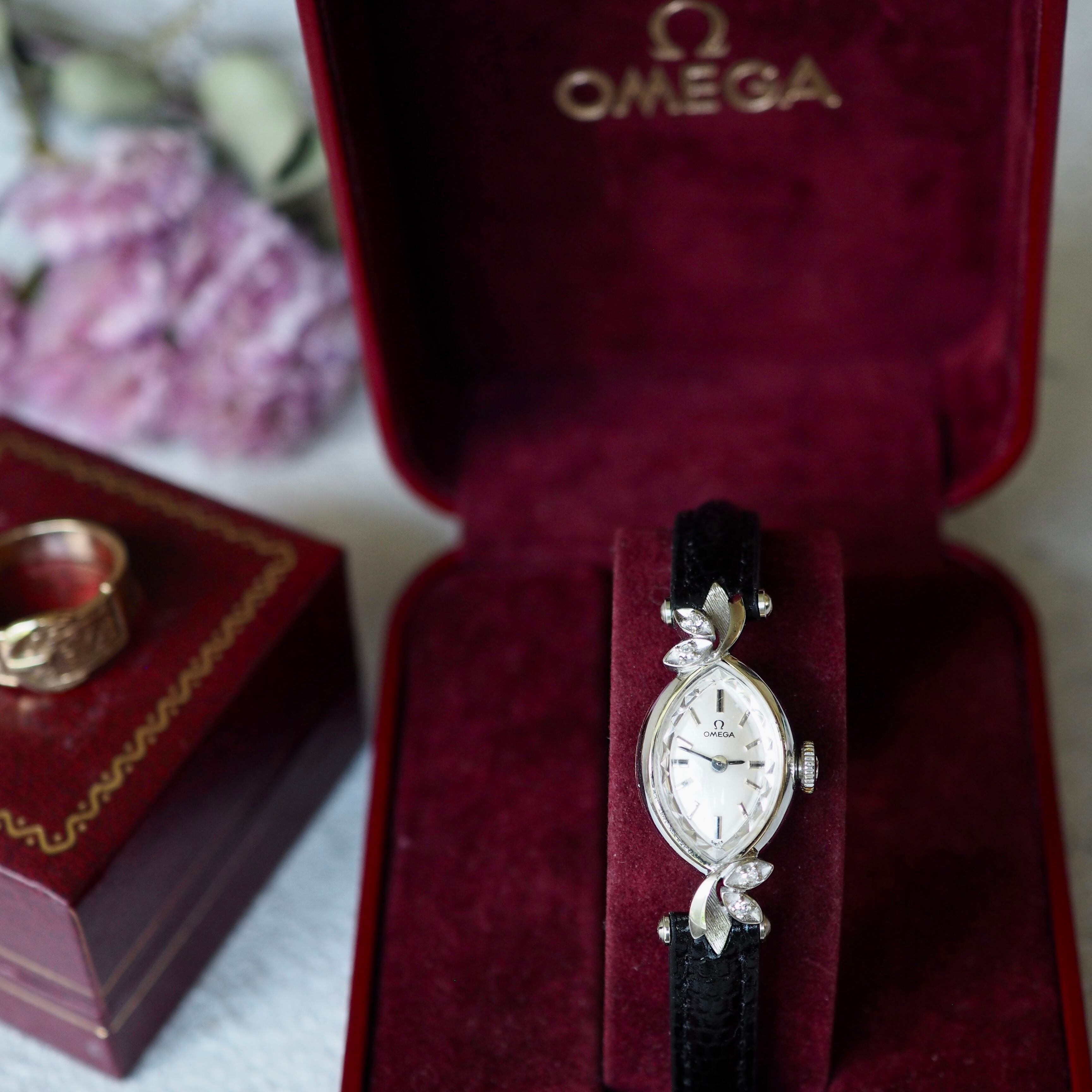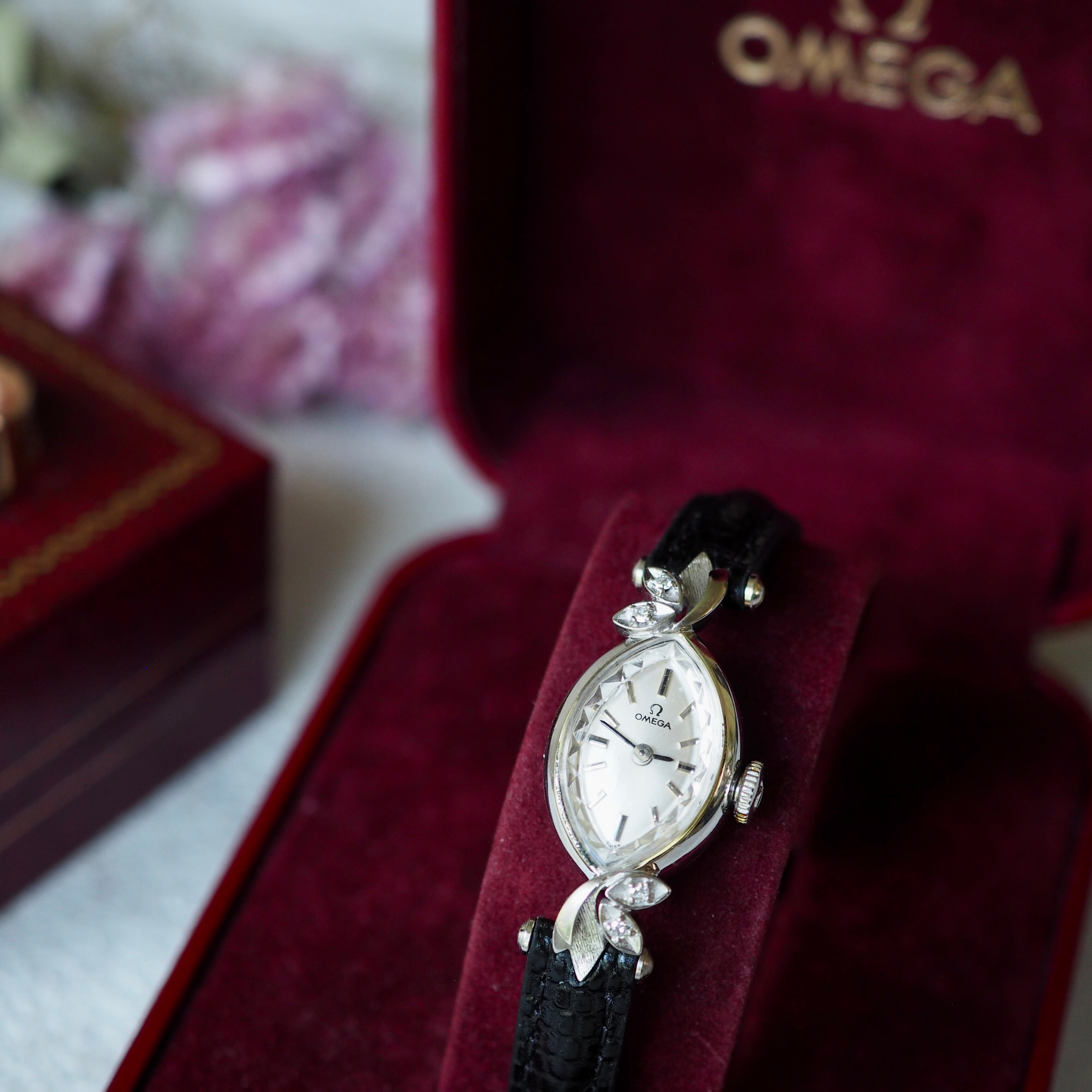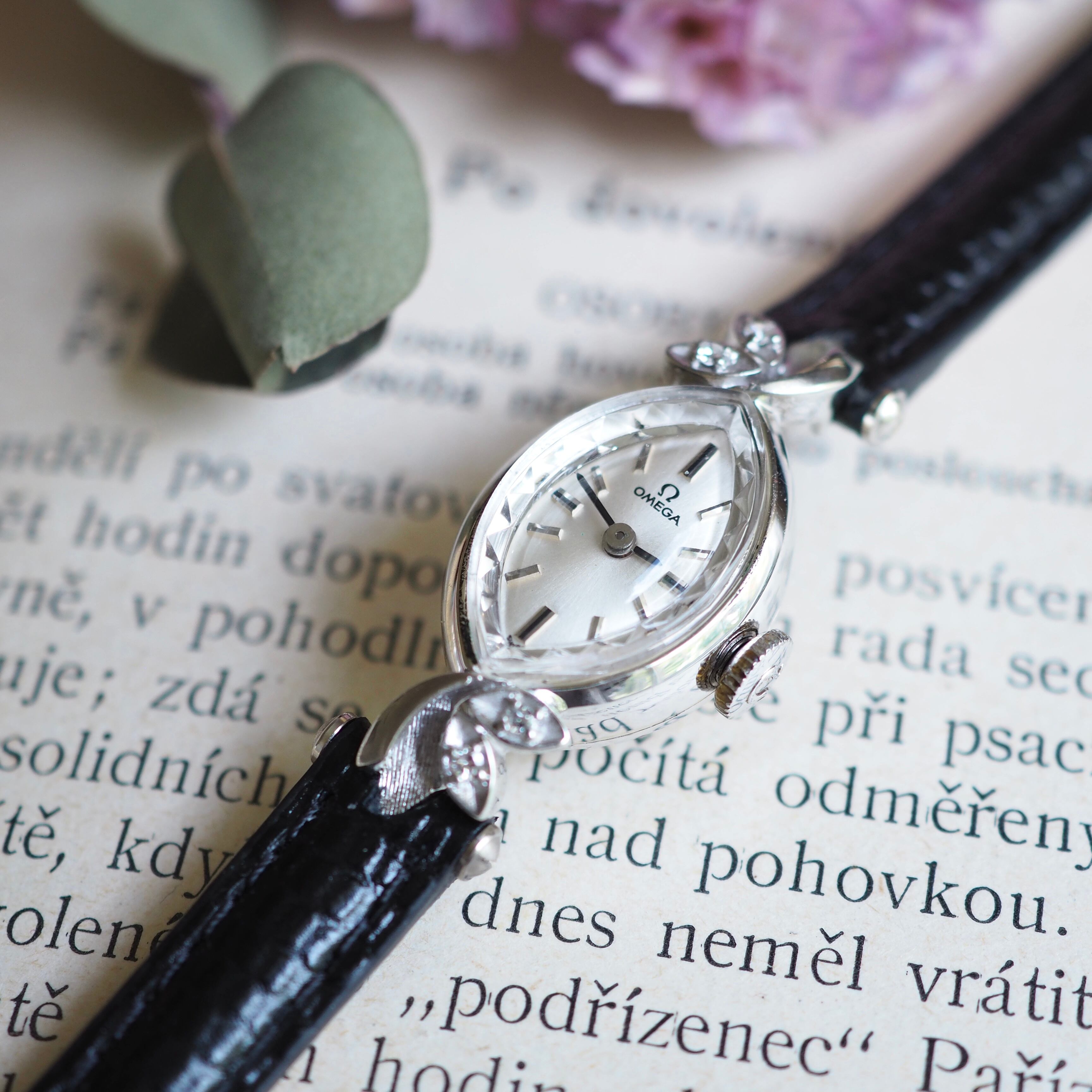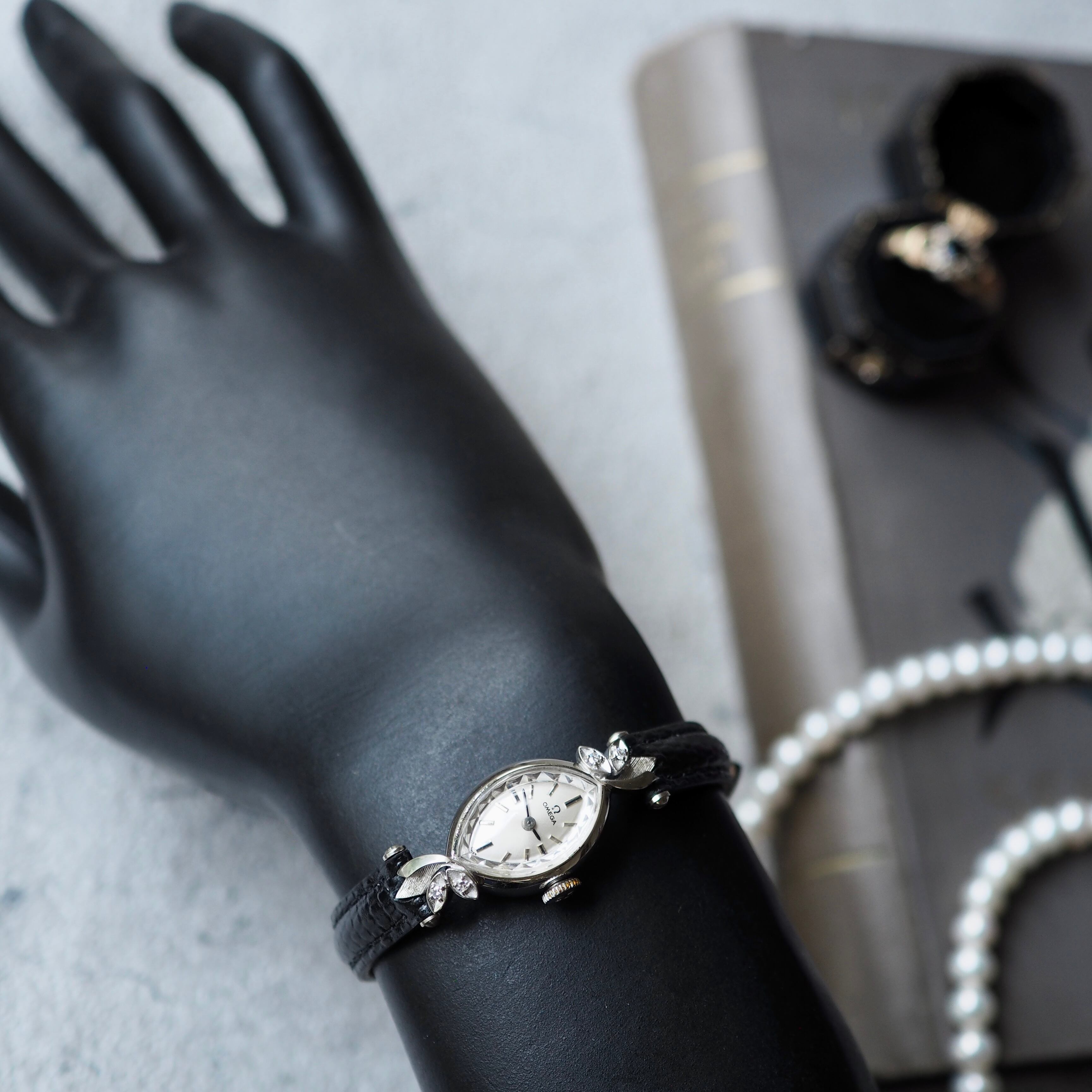 14金張りのマーキス型ケースにダイヤモンドがあしらわれたボタニカルモチーフのラグが可愛い60年代のOMEGAのカクテルウォッチです。