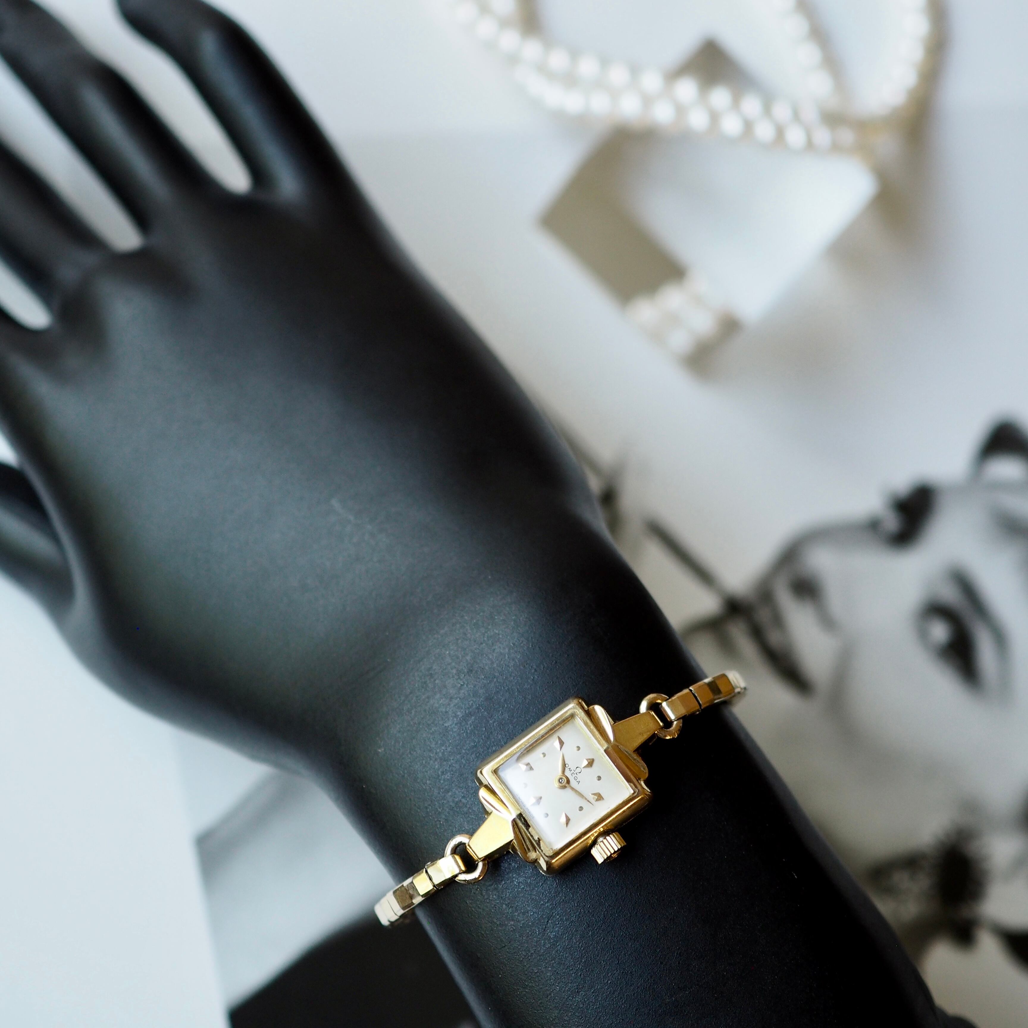 つやつや光る金張りの小さなスクエアケース。ダイヤ型とドットインデックスが交互に配置され、ノスタルジックな雰囲気が漂います。