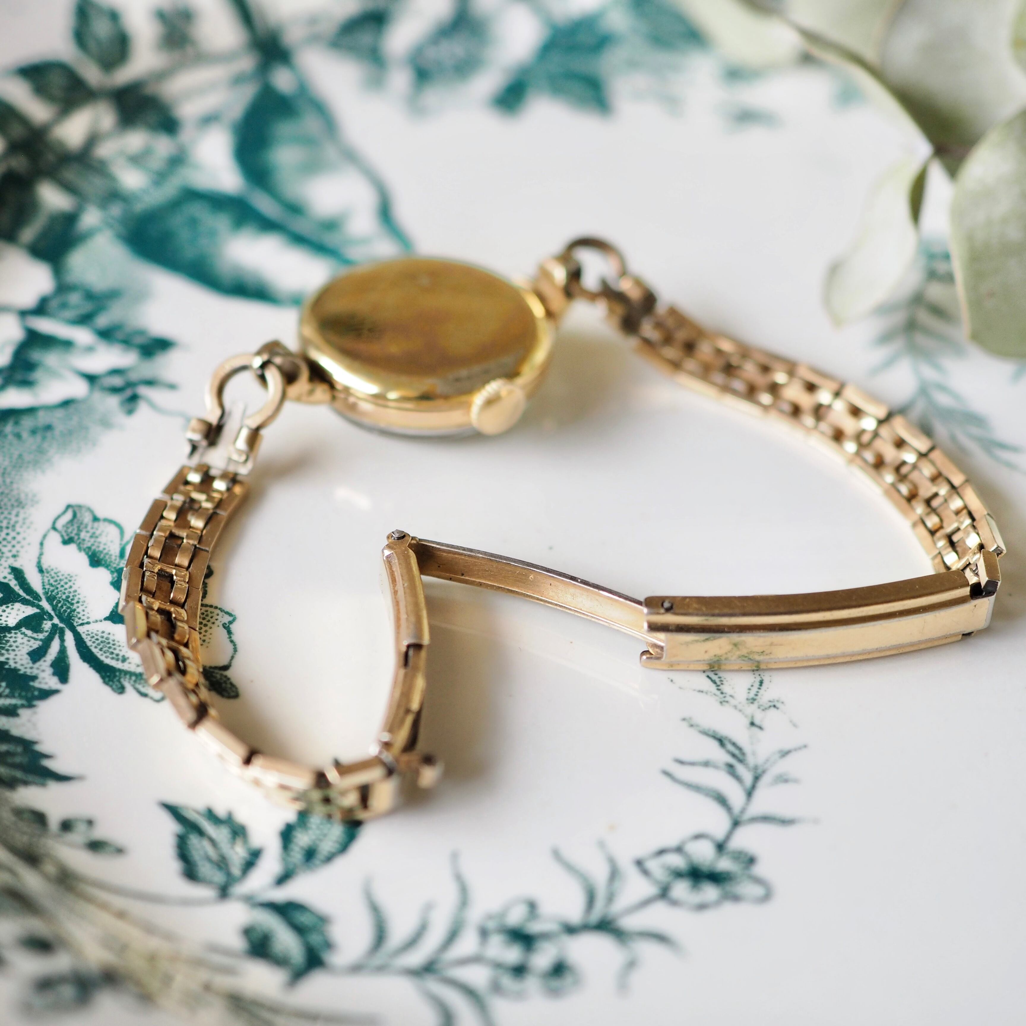 ぷるんとした丸い風防やゴールドの針柔らかで女性らしく可愛らしい雰囲気です。