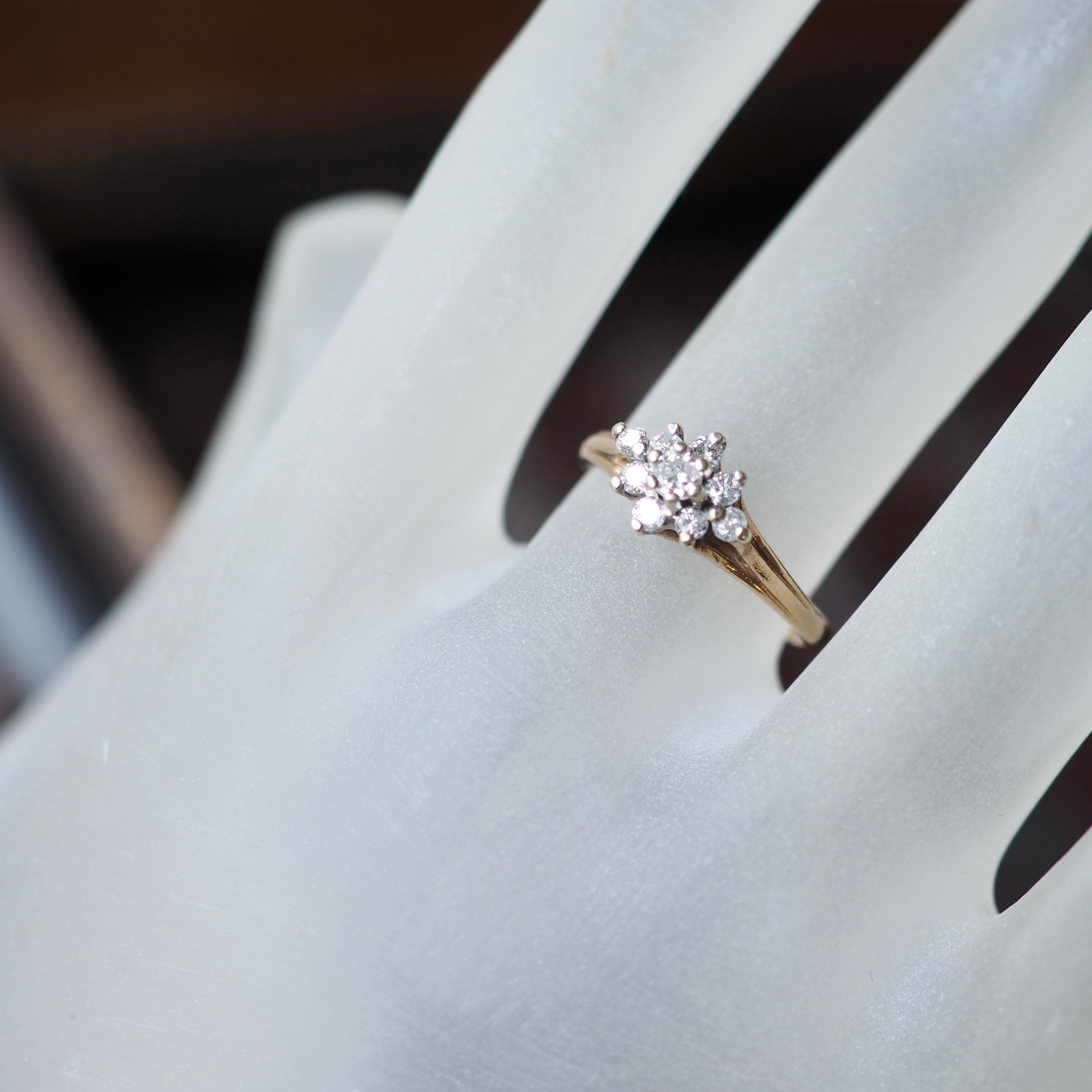 ダイヤモンドを9粒集めて形作った上品なデザインが美しいクラスターリング。