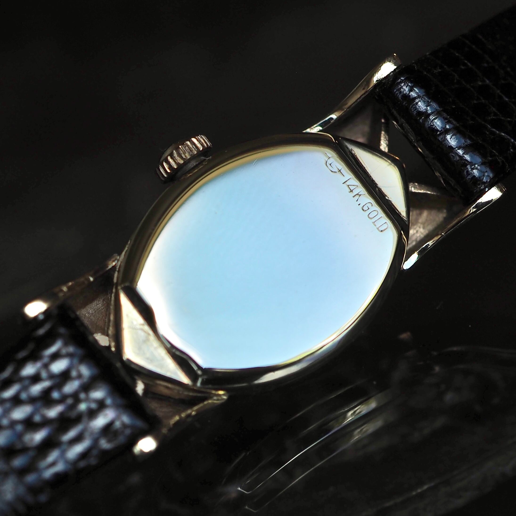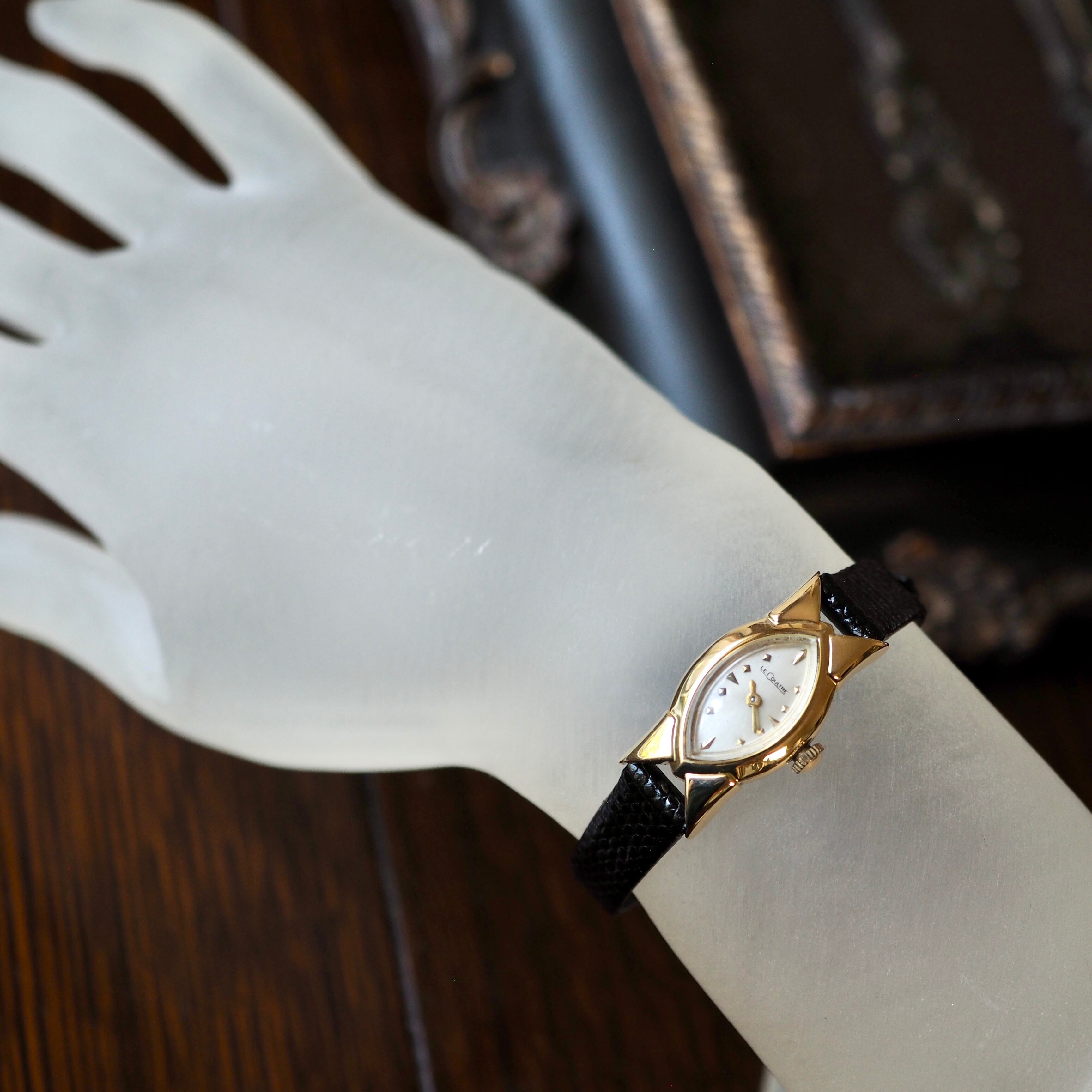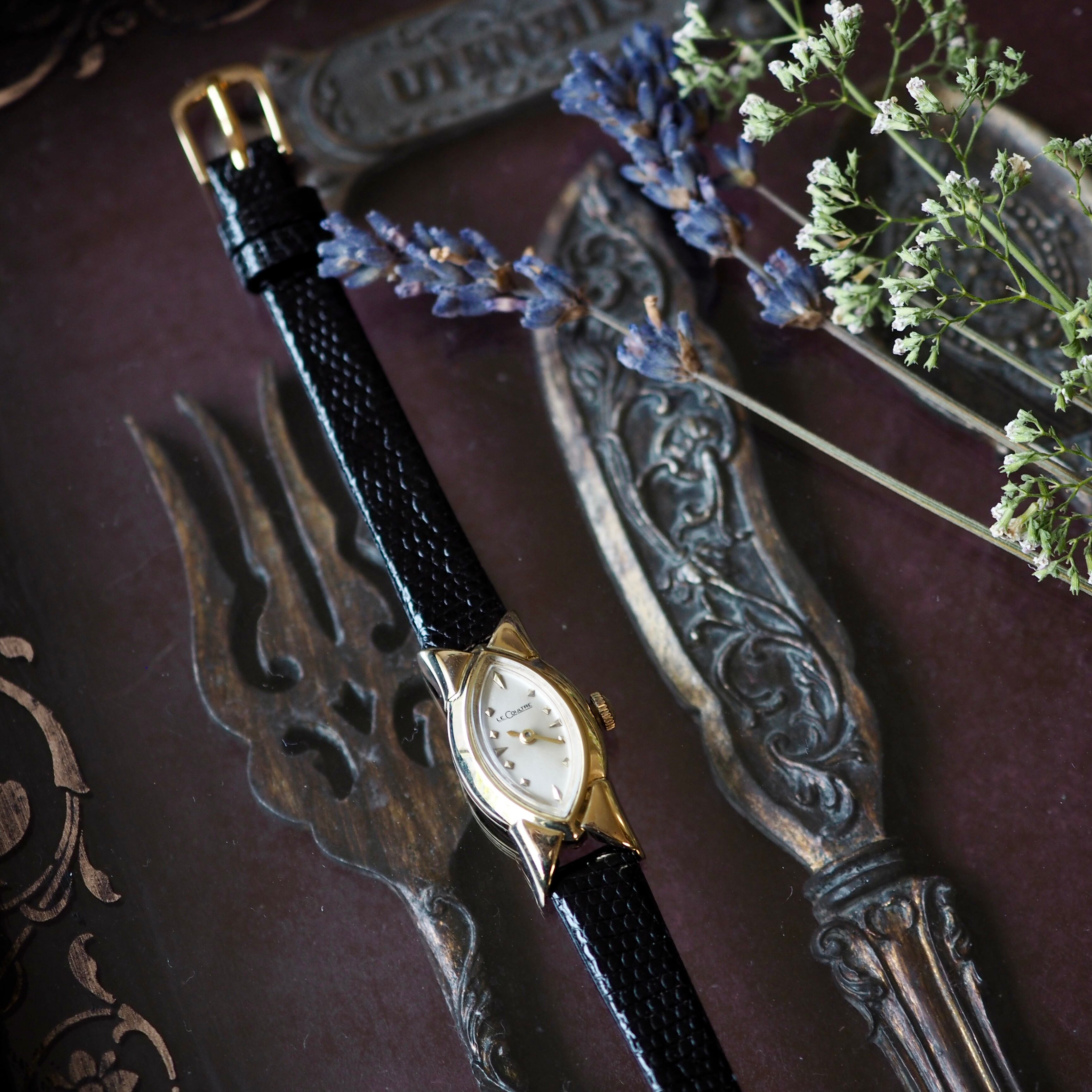 マーキス型の金無垢ケースにリボンをモチーフにしたラグがついた個性的なデザイン。アンティークならではです。