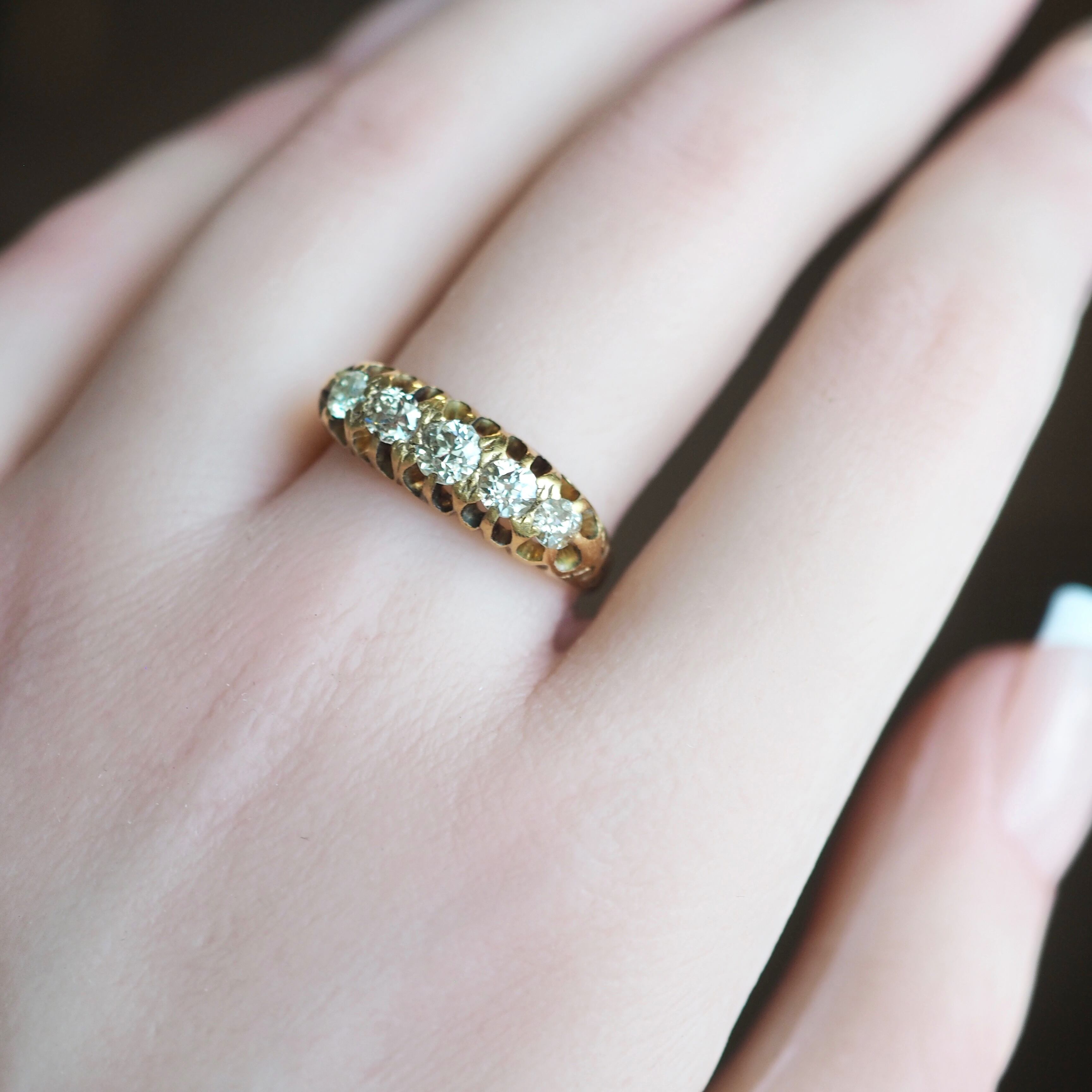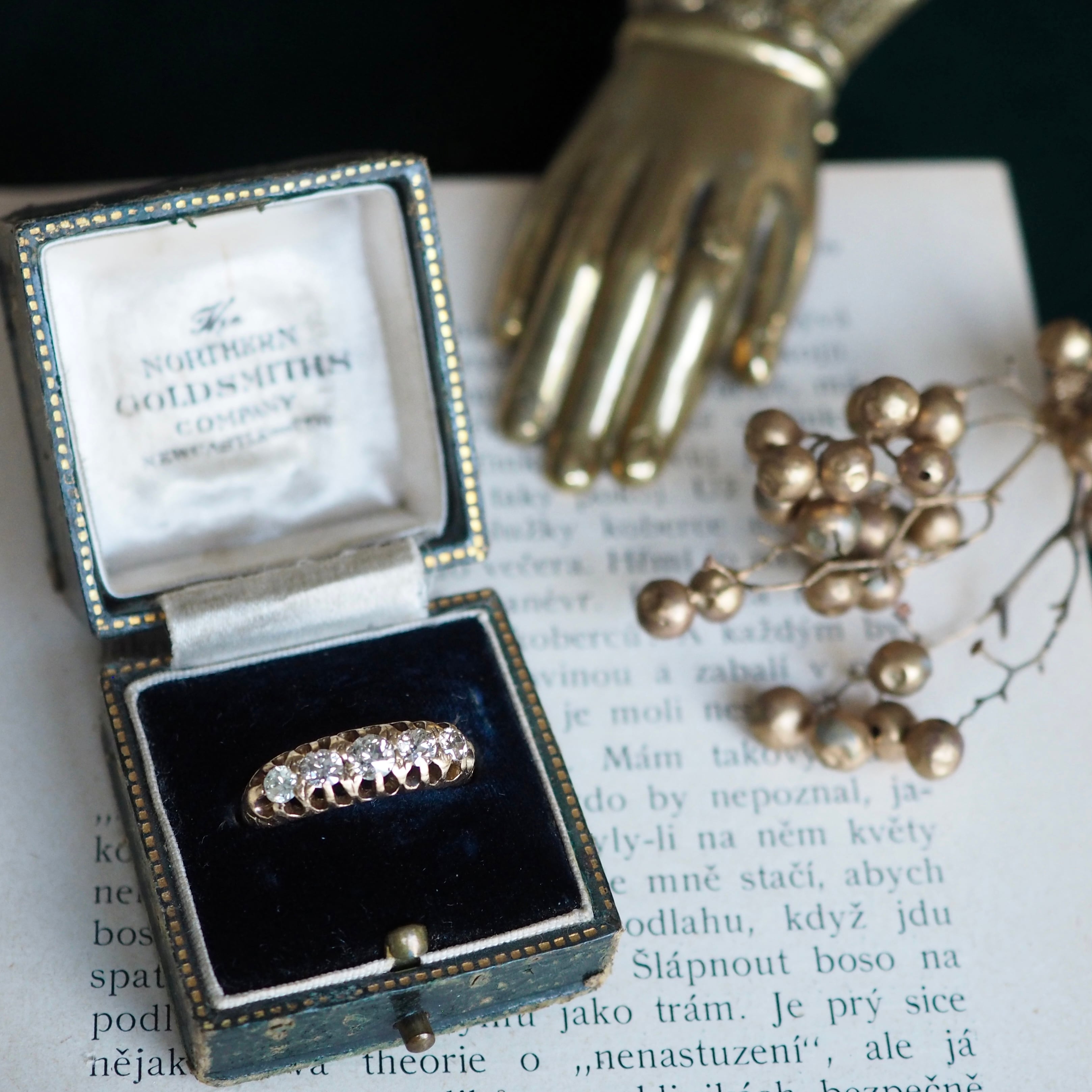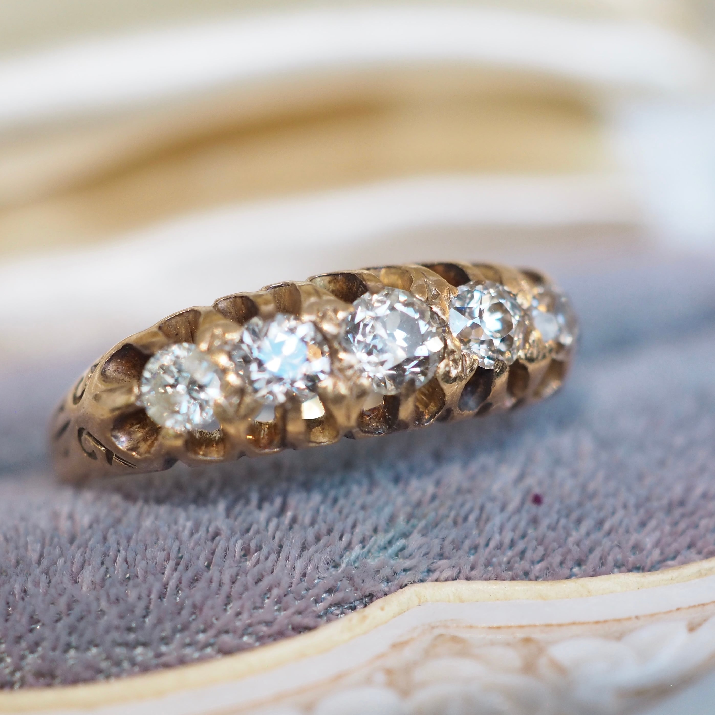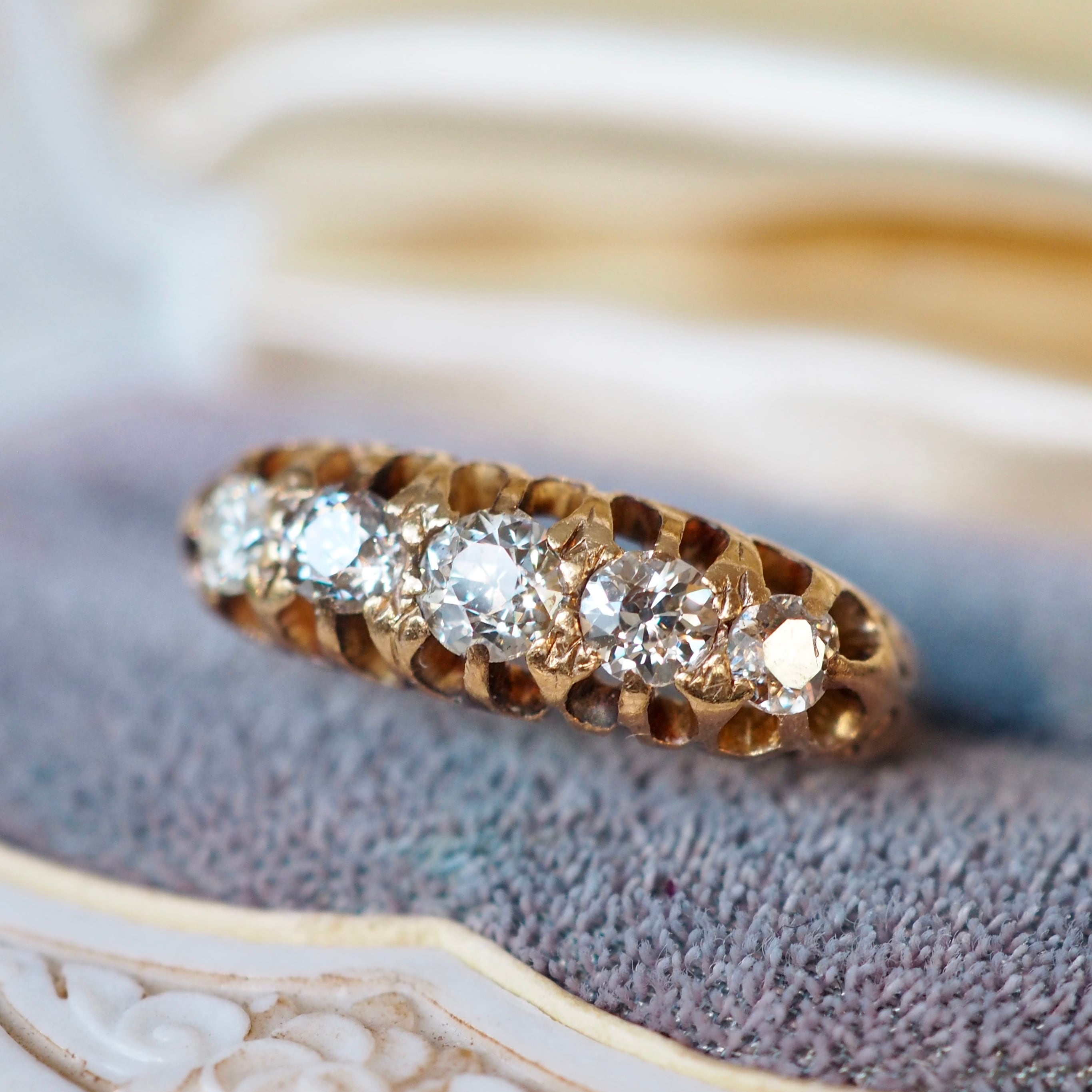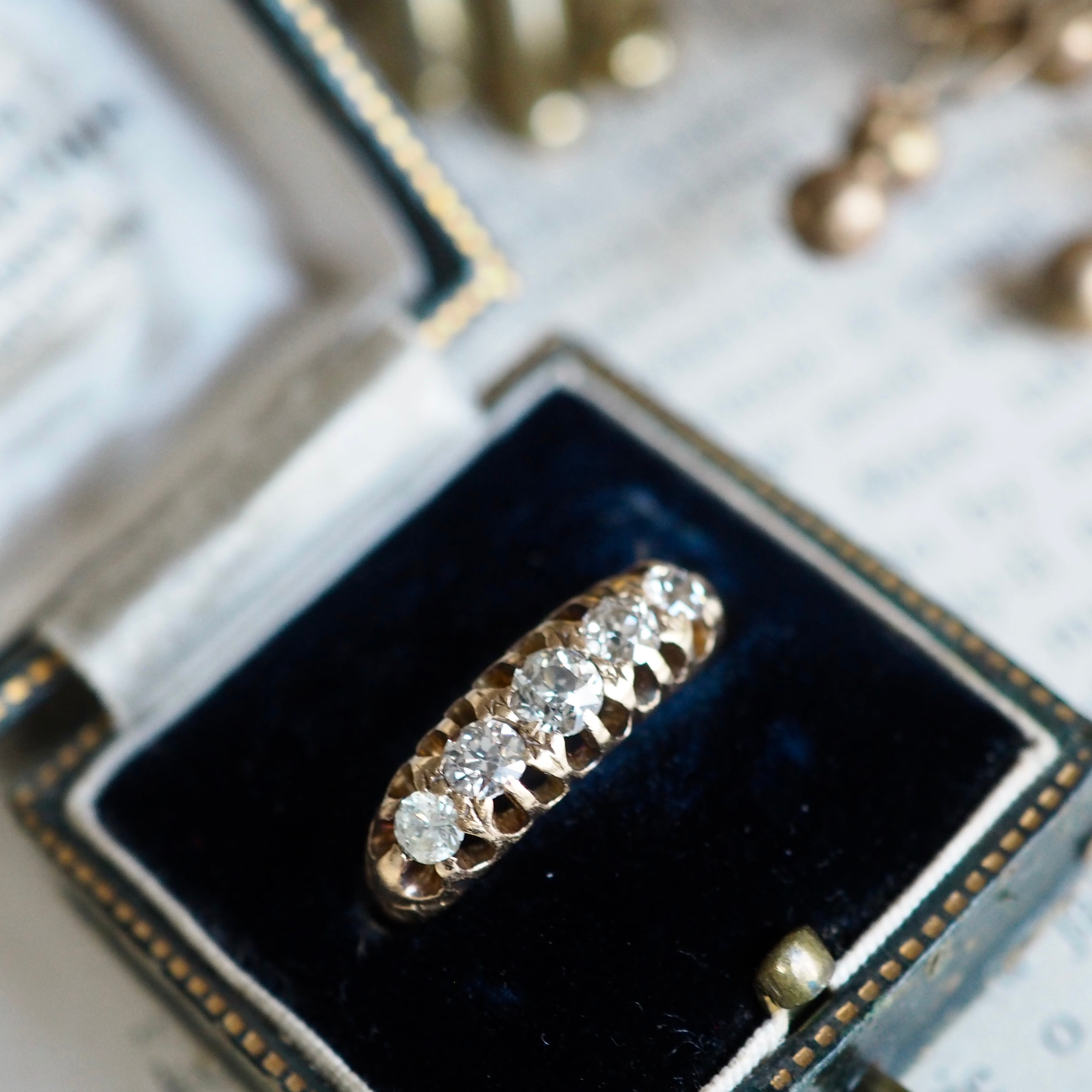 コロンとしたオールドヨーロピアンカットがほどこされたダイヤ5石がセットされたヴィクトリアン・リング。